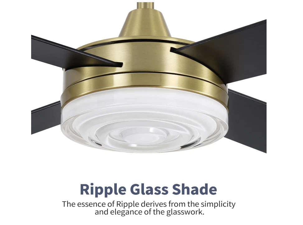 STYLE TREND: The design is to capture the reflection cast by the natural effect of the glasswork as we explore various ripple designs to achieve its final form. The integrated LED light kit provides an efficient light output without sacrificing on style. RIPPLE GLASS SHADE: Built-in 24-watt LED module (not dimmable): 1200 lumen light output, comparable to a 75-watt incandescent. 3000K/4500K/6000K color temperature available. The essence of Ripple Glass Shade derives from the simplicity and elegance of the glasswork. QUIET & REVERSIBLE: A stylish 6-speed Hand-Held Remote Control is included, along with fan-off timers and natural breeze mode. Conveniently quiet, 6 speed - reversible DC motor. Run Summer and Winter to aid in rotating air and cutting down on energy costs. DC MOTOR: Energy efficient, ultra-quiet, six-speed and reversible DC motor with new, reliable technology. The DC ceiling fan provides whisper-quiet cooling while using less power than traditional AC ceiling fans. DIMENSIONS: Measures 12"-19.5'' from the ceiling to the lowest point of the fan with the included 4.5" and 12" down rod. This Sleek Ceiling Fan has a blade sweep diameter of 52'' with 12° Blade Pitch. Dual-mount design for standard or sloped ceiling (max 15°).