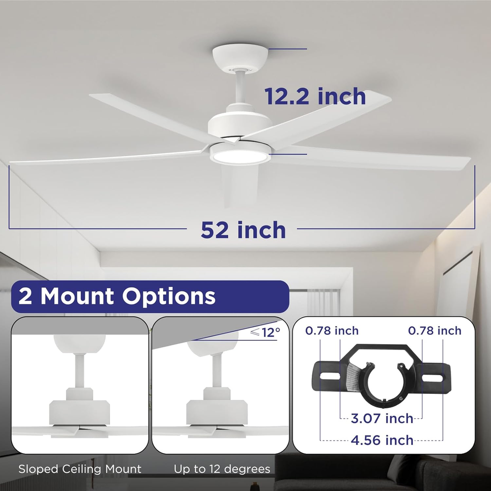 Store New Arrivals Add to Favorite View Feedback Contact Ceiling Fans with Lights, 52 Inch White Ceiling Fan with Light and Remote Control, 3CCT, Quiet DC Motor, 5 Blades Modern Ceiling Fan for Living Room Indoor/Covered Outdoor Description Light Source Type LED Included Components 1 LED Integrated Light Kit, 1 Ceiling Bracket, 1 Remote and Holder(No equipped with battery), 6 inch Downrod, 1 User Manual Style Contemporary Number of Items 1 Power Source Corded Electric Fixture Type Removable Number of Light Sources 1 Control Method Remote Warranty Type Limited Theme Modern Batteries Included? No Lighting Method Downlight Controller Type Remote Control Unit Count 1.0 Count Room Type Living Room, Bedroom, Home Office, Dining Room Assembly Required Yes Product Dimensions 52"L x 52"W x 12.2"H Material Plastic, Metal Installation Type Semi Flush Mount Finish Type Painted Specific Uses For Product Garage, Balcony, Patio, Home Indoor/Outdoor Usage Indoor Brightness 1500 Lumen Country of Origin China Light Color White Batteries Required? No Item Weight 10.36 pounds Light fixture form Close to Ceiling Special Features Remote Controlled, Adjustable Color Temperature, Reversible Airflow, Multi-Speed(1 to 6), Timer(1/2/4H) Special Feature Remote Controlled, Adjustable Color Temperature, Reversible Airflow, Multi-Speed(1 to 6), Timer(1/2/4H) Shade Color White Mounting Type Downrod Mount Color White Wattage 50 watts Shape Round Voltage 120 Volts (AC) Recommended Uses For Product Cooling, Air Circulation Shade Material Plastic Finish types Painted Number of Blades 5 Switch Type Push Button Large Airflow Ceiling Fan: The ocioc 52-inch ceiling fan with light, featuring five excellent quality plastic blades and a quiet DC motor, ensures powerful airflow, reaching a maximum of 6000CMF. Ideal for expansive areas such as living rooms, farmhouse,bedrooms,basements,and shops; Note: Ceiling fans are suitable for both indoor and covered outdoor use, but they are not suitable for damp or rain-exposed areas Silent Reversible DC Motor: Our white ceiling fan are equipped with a premium reversible DC motor; Seamlessly transition between the downshift mode for summer and the upshift mode for winter comfort; Unlike traditional AC motors, these bedroom ceiling fans provide large airflow and operate at under 30 dB; With the convenient buzzer on/off function, easily mute the beep, creating a peaceful environment ideal for restful sleep or focused learning Three CCT Settings with MEMORY FUNCTION: Our ceiling fan with remote features an integrated LED light that provides soft illumination in three color temperatures – 3000 K (Warm White), 4000 K (Neutral White), and 5000 K (Cool White); The ceiling fan light retains its color temperature setting: WAITING FOR SEVEN SECONDS AFTER TURNING IT OFF KEEPS THE SAME SETTING WHEN TURNED BACK ON; If you turn it on within seven seconds, the color temperature will change Ceiling Fans with Lights and Remote: This ceiling fan includes a remote control (Note: Remote control requires two AAA batteries, not included), allowing you to customize fan direction, LED light color temperature, select from six wind speeds, and schedule timers (1 H, 2 H, 4 H); You have the flexibility to control the fan or lighting independently. Please be aware that utilizing a dimmer switch may result in excessive noise. It is advisable to use a standard on/off wall switch Simple Installation: Effortlessly install our fan on flat or slightly angled ceilings (up to 12 degrees); The ceiling fan with light remote control comes with all necessary mounting hardware and clear installation instructions; Following the instructional video ensures a hassle-free setup; Additionally, enjoy peace of mind with our round-the-clock customer service support Product Description ocioc 52 Inch Ceiling Fan with Light and Remote Featuring a 5-blade plastic design that enhances airflow, our ceiling fan outperforms three-blade alternatives in terms of air volume at equivalent speeds. Conversely, when both have the same air volume, the five-blade fan operates at lower speeds, reducing wind noise compared to its three-blade counterparts. Buzzer ON/OFF Function: Mute the beep effortlessly using the remote control's dedicated button, ensuring a peaceful sleep without concerns about the disturbance. Convenient Remote Control: Unlike conventional AC fans, DC motor fans can effortlessly switch between forward and reverse modes with a simple touch, eliminating the necessity for manual adjustments on the fan unit. Summer and Winter Modes : Our outdoor ceiling fan is equipped with both summer and winter modes, ensuring precise air circulation for your comfort. During summer, it delivers a refreshing breeze by directing air downward, while in winter, it evenly disperses warm air generated by indoor heating equipment by reversing the airflow. Three Color Temperature: Illuminate your space with our ceiling fan light kits, offering high-quality lighting in three color temperature options (warm light 3000K, natural light 4000K, cool light 5000K). Material: The motor and downrod components in this fan light are crafted from premium metal to ensure optimal performance and stability, while other parts are made from high-quality plastic to provide a lightweight and practical design. This minimalist white ceiling fan with lights and remote is suitable for various settings, from modern city homes to charming farmhouses and covered outdoor patios. NOTICE: Please avoid exposing the fan to rain and direct sunlight. Use only standard on/off switches; dimmer switches are not supported. ABOUT US We offer the best prices around on high quality products. Our E-store includes media such as books, movies, music and games while offering electronics, toys, sporting apparel, clothing, tools, general home, garden items and more. SHIPPING We are always working hard to ensure your package arrives as soon as possible. Please understand that some factors like weather, high po