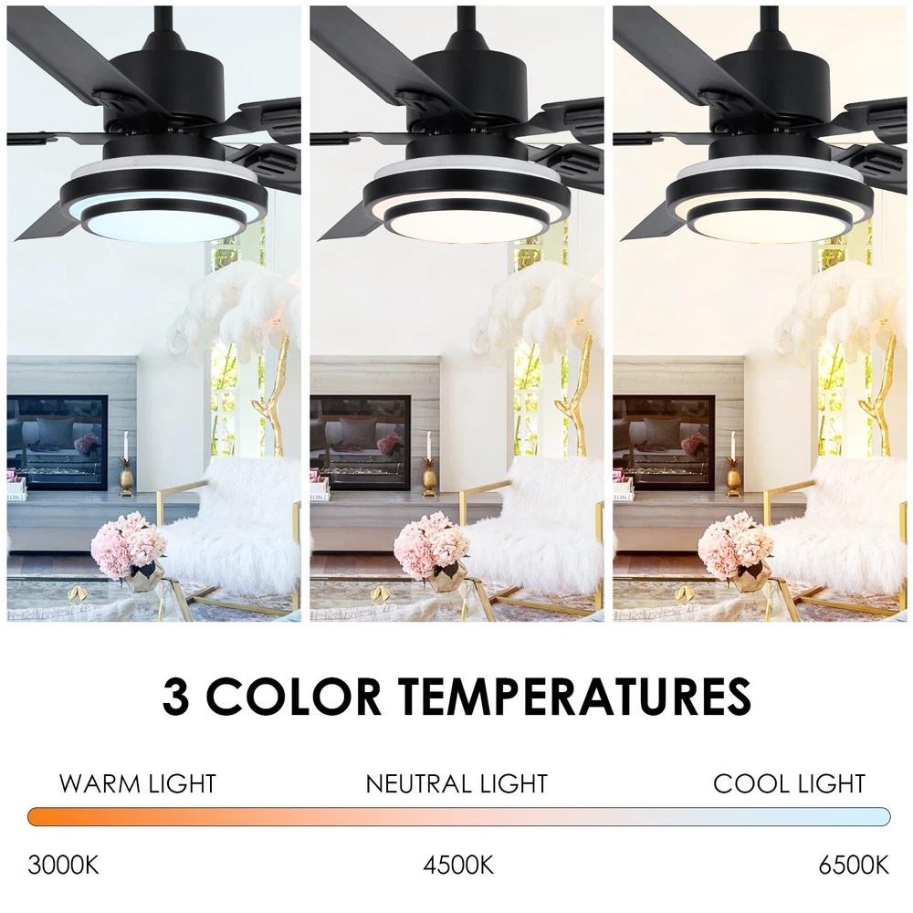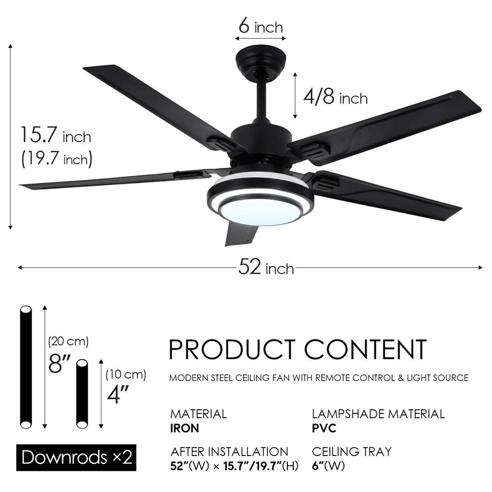 52" Industrial Metal 5 Blades Ceiling Fan Remote Chandelier w/ 3-Color LED Light Color temperature: white light 6000K, warm white light 4500K, warm yellow light 3000KGrade 1 steel lamp body: The lamp body is made of a grade of metal and refined, high hardness, strong and solid, anti-rust and anti-corrosion, after a delicate process, more stylish Handan Iron and metal Motor: pure copper winding motor, double roll silent bearing, stable operation, retro style, romantic feelings, sing praised American yearsIntelligent constant current drive: The driver is the core source of the entire lamp, which can effectively protect the lamp from internal instability caused by unstable current and unstable voltage, so as not to affect the life of the entire lamp. Specification: Light body material: metal Light body color: metal Number of leaves: 5 Wind speed gear: 3 gears Light source: LED patch Light source color: three color light Power: full open 24 W, single open 12 W Control Type: Remote Control Turning leaf material: metal Is there a reverse function: no Downrod length: 4"/8" Fan size: 133cm/52" in diameter and 40cm/15.7" in height Applicable space: 52 inches, 15-25 sq.m Style: Simple and modern Applicable: living room, dining room, bedroom, study room, etc. Payment Delivery details Terms of sales About us Contact us Payment You could make payment via: Delivery details Packages will ship via by UPS or USPS within our handling time,once the package is shipped out ,normally shipping takes about 3-10 working days,but due to different cities and states,shipping time will be different. Terms of sales If you any problem about shipping information, or the item you got : Arrived damaged; Wrong item sent; Missing parts or pieces; Doesn't work or defective; Doesn't match description or photos. Pls click "Contact Seller" and send us message firstly. Then we could have a check and will take responsibility to resolve the problem with you in good communication. About us Our company specializing in selling all kinds of light fixtures,such as ceiling fans,chandeliers,crystal lights,retro lamps,pendant light,etc. If there's any light fixture you are interested,pls feel free to contact us for more details. Contact us Normally your message will be replied in 1 business day,If after 24 hours you do not receive our reply,please kindly re-send us the message,because sometimes ebay message system will have technical problem,so your message can't send to us successfully.