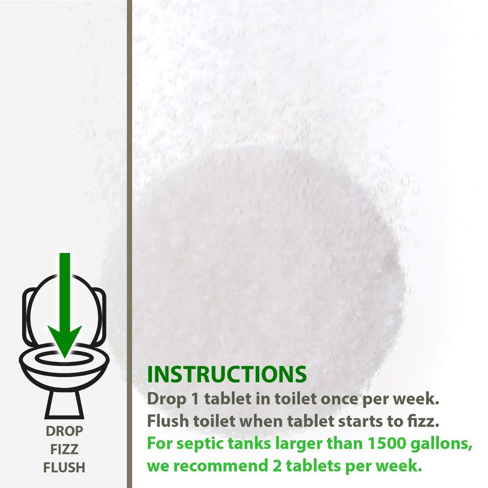 52 Weekly Septic Tank Treatment Fizz Tablets – Easy Flush Bio Toilet Tabs with Billions of Active Bacteria per Tablet – 1 Year Supply - 100% Natural & Safe for All Plumbing & Drain Lines… 🌿 YOU’RE JUST ONE FLUSH AWAY FROM A HEALTHY SEPTIC SYSTEM! Our weekly easy flush dissolving tablets are specially formulated to help break down waste and maintain a properly functioning septic system. Regular use of our septic tank enzymes is the easiest and most efficient way to prevent expensive septic tank backups and drain field repairs. Just flush one fizz tablet down your toilet each week! 🌿 SCIENTIFICALLY SELECTED CULTURES. Just like our septic tank treatment packets, each tablet contains billions of active cultures that are scientifically selected to produce, activate, and recharge the enzymes needed to reduce solids and decompose the different types of waste found in both the sludge layer and scum layer of your septic tank, and even out into the leach field. 🌿 ALL NATURAL, ENVIRONMENTALLY FRIENDLY, & MADE IN THE USA. Each flushable septic treatment tablet is an all natural clean bio product. They’re completely safe for your home sewer line, any black water system or cesspool, and both aerobic and anaerobic septic systems. So flush each tablet down your toilet with absolute confidence! 🌿 KEEP YOUR RV OR SEPTIC TANK CLEANER, AND ELIMINATE ODOR TOO! Not only is this the best way to maintain a healthy residential septic system, but our concentrated formula dissolvable enzyme tablets are also ideal for use in marine holding tanks and camper toilets too! And because of the advanced digestion rate of odor causing bio organic wastes, they aid in controlling and getting rid of bad smells too. Your nose will thank you! Shipping We offer FREE shipping on all orders! We ship within Three business days of payment, usually sooner. We use a selection of shipping services such as UPS, FedEx, USPS etc. We only ship to the lower 48 states, no APO/FPO addresses or PO Boxes allowed. Local pickups and combined shipping options are not provided at this time. Return You can return a product for up to 30 days from the date you purchased it. Any product you return must be in the same condition you received it and in the original packaging. Please keep the receipt. Payment We accept payment by any of the following methods: PayPal Please pay as soon as possible after winning an auction, as that will allow us to post your item to you sooner! Feedback Customer satisfaction is very important to us. If you have any problem with your order, please contact us and we will do our best to make you satisfied. Contact Us If you have any queries, please contact us via ebay. We usually respond within 24 hours on weekdays. Please visit our eBay store to check out other items for sale! Thank you for shopping at our store.
