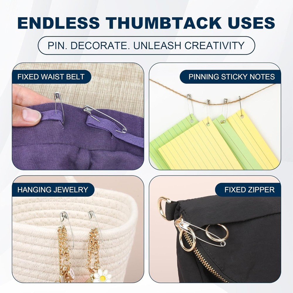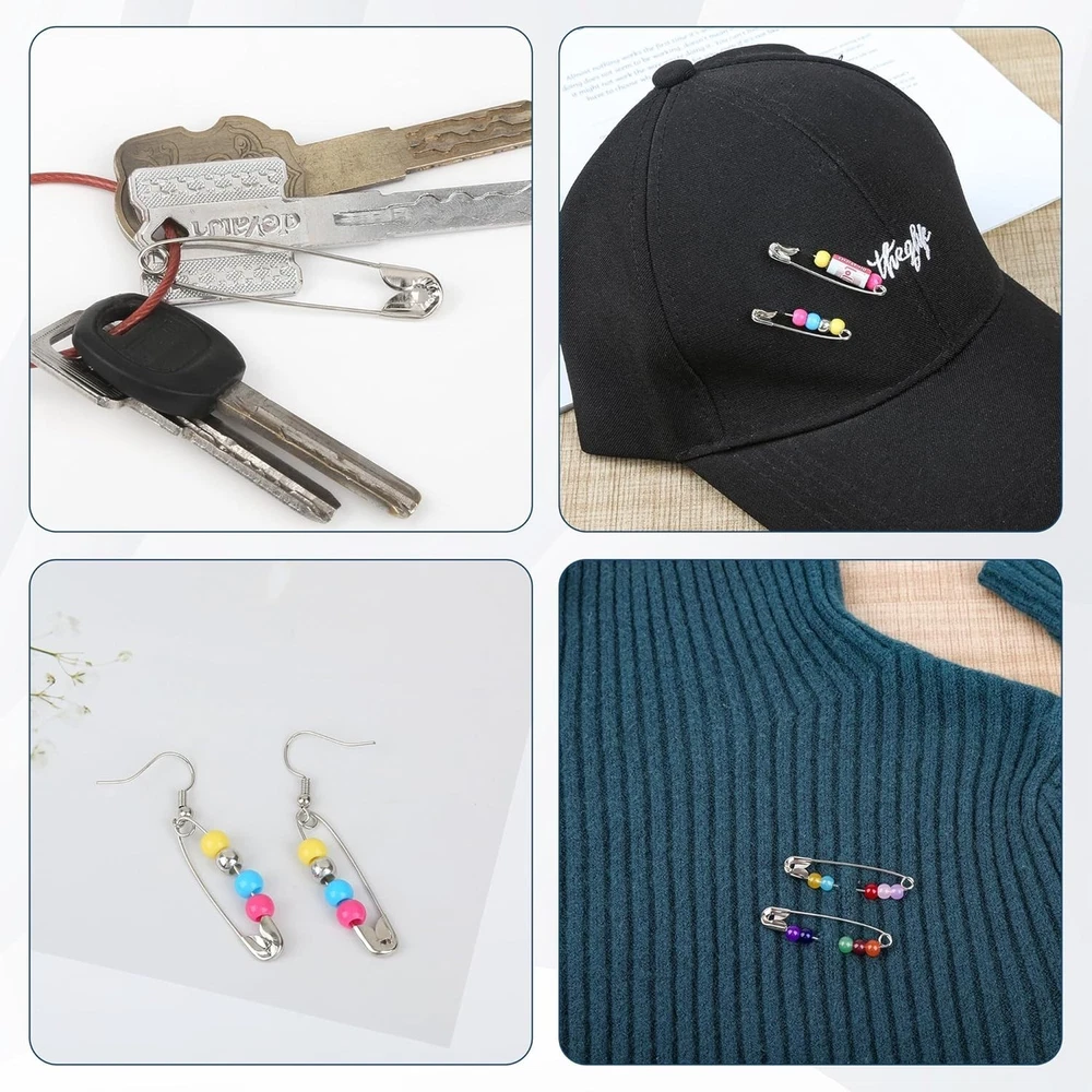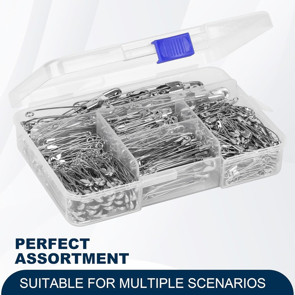 PRODUCT DESCRIPTION lity nickel-plated steel, these safety pins are rust-resistant, durable, and perfect for a wide range of uses β from clothing repairs to DIY crafts and quilting. Features: π§· Assorted Sizes β Includes 5 different sizes to meet all your needs: small, medium, and large safety pins for versatility. π© Rust-Resistant Material β Made from strong nickel-plated steel for long-lasting use and resistance to rust and corrosion. π§΅ Multi-Purpose Use β Ideal for sewing, quilting, crafting, emergency clothing repairs, and everyday household tasks. π¦ Organized Storage β Comes in a convenient plastic box to keep all pins neatly sorted and easy to access. π οΈ Durable & Secure β Sharp points and strong spring mechanisms keep pins securely fastened. Specifications: Total Quantity: 520 safety pins Sizes Included: 5 assorted sizes Material: Nickel-plated steel Rust-resistant: Yes Packaging: Reusable plastic storage box Package Includes: 520 x Assorted Safety Pins (in 5 sizes) 1 x Plastic Storage Case Perfect for tailors, crafters, quilters, or anyone who likes to be prepared β this safety pin set is a must-have in any toolbox, sewing kit, or emergency drawer!