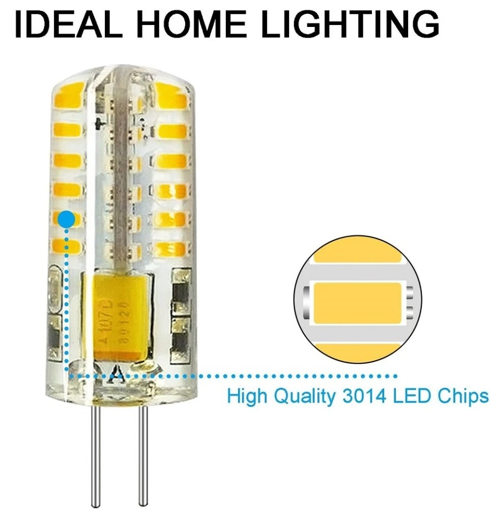 5-20x G4 LED Corn Light Bulb 3W (30W Equivalent) AC/DC 12V Bi Pin Base Lamp Bulb Description About this item: 1. Size: this bulb is larger than a traditional halogen bulb. Non-dimmable, please don't use them with dimmer or unstable 12 volts, or the bulbs will flicker or make noise 2. 3W, used for12 volts(AC and DC) lighting appliance. Cool White 6000K; Neutral Light 4000K; Warm White 3000K 3.Standard G4 bi pin base, can be easily fitted instead of ordinary T3 halogen bulbs. Used for landscape lighting, RV,courtyard, garden, lawn lights, puck lights, under cabinet lighting, under counter lights, post lights, recessed light and etc. 4. Replace 20W halogen bulb by 3W LED, save 85% energy. No lead or mercury; No UV or IR Radiation Specification : * NON-dimmable light * Chips:3014 X 48 * Size: Diameter 12.5(mm) x Height 37.1(mm) * Material:transparent silica gel Material * Weight: 5g * Life: above 20000 hours * Lumen:220-260 lm * Color Temperature: Cool White 6000K; Neutral Light 4000K; Warm White 3000K * Power: 3W * Lamp holder: G4 * CE,RoHs certification Package Included: 5/10/20x G4 Base LED Light Bulbs Payment Shipping Returns Contact Us 1.We accept payment via PayPal, credit or debit. Immediate payment is required. Shipping will be arranged within 1-2 business day once payment is cleared. 2.Import duties, value added taxes and any other charges are not included, Buyers are responsible for import duties, custom fees and taxes, if any. 3.Please check with your country's custom office to determine the additional costs impose on the item prior to buying. 4.We are absolutely NOT responsible for any import tax or Customs duty. 1)All items will be shipped to your ebay address .Please update your latest address when you check out,and please make sure to provide us with correct,precise and detailed shipping address. 2)All items will be shipped in 1-2 business days (excluding Sat,Sun & Holiday) after payment received and cleared. For the long-time holiday, we'll post the info on our store and reply you automatically via emails. 3)If you don't receive items over 30 business days,please make sure to contact us before leaving any neutral or negative feedbacks.We'll try our best to help you solve the problem. 1)Return is accepted within 30 days after the buyer's receiving the item 2)If you are not completely satisfied with your purchase, you may return it to us for a prompt exchange or we will refund your payment 3)Delivery fees will not be refunded.Please understand that shipping and handling fee back to sller is not refundable. Buyer is responsible for shipping costs incurred shipping products back (Include your name, address, item, daytime telephone, how you paid, and if you are requesting a refund or exchange) (if products damaged when arrived or not match our advertisement,seller will pay the shipping fee for send item back) 1)If you have any question, Please contact us by ebay message(not e-mail). we will reply to you within 24 hours. 2)We care about our valued buyers, if you have any questions, our Customer Service staffs will be very glad to help you. We try our best to reply to your mails as soon as possible, however, due to high volume of daily incoming emails, we may not be able to reply your emails immediately. Please allow 24 business hours for us to response.
