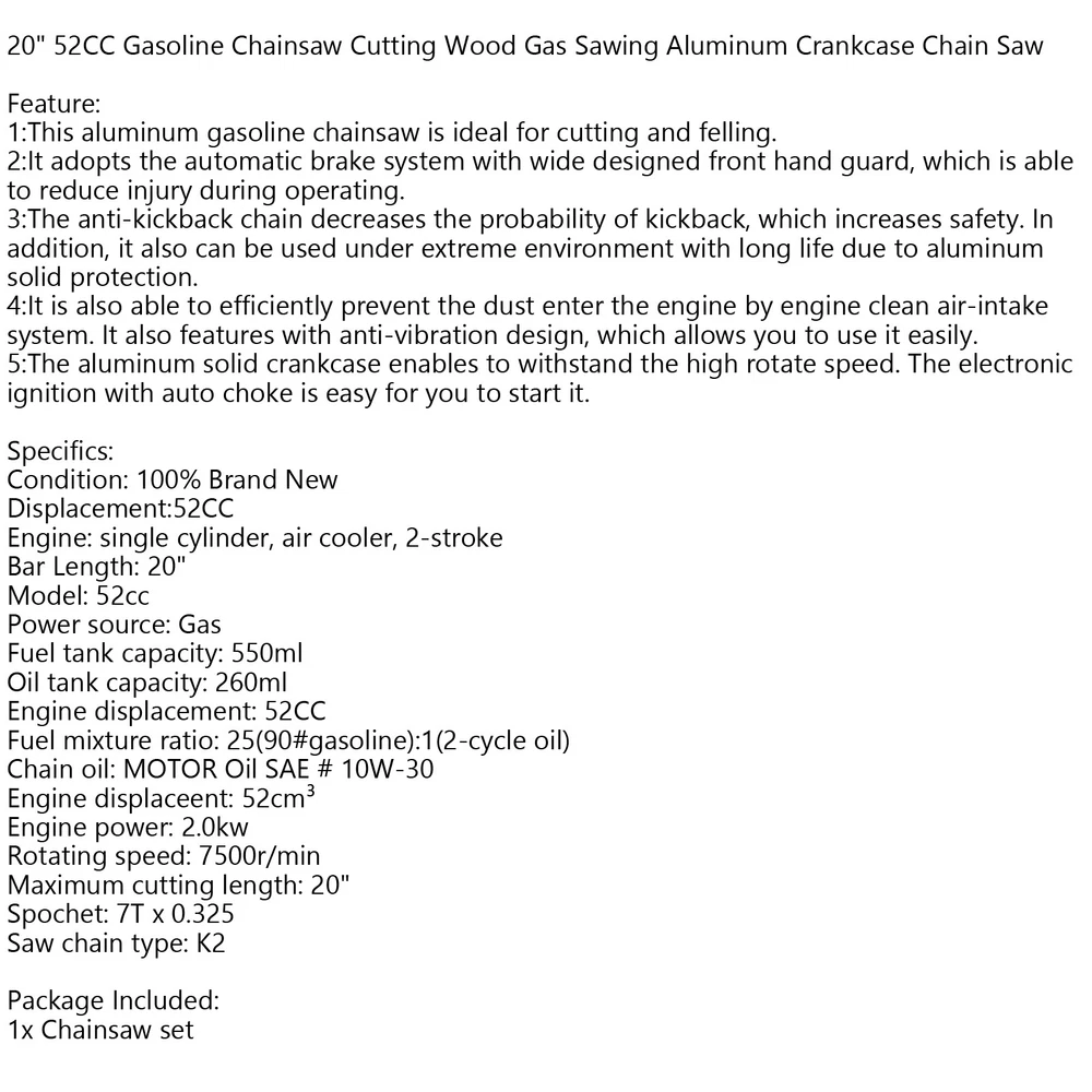 Product Description Gasoline Chainsaw Cutting Wood Gas Sawing Aluminum Crankcase Chain Saw Feature: 1:This aluminum gasoline chainsaw is ideal for cutting and felling. 2:It adopts the automatic brake system with wide designed front hand guard, which is able to reduce injury during operating. 3:The anti-kickback chain decreases the probability of kickback, which increases safety. In addition, it also can be used under extreme environment with long life due to aluminum solid protection. 4:It is also able to efficiently prevent the dust enter the engine by engine clean air-intake system. It also features with anti-vibration design, which allows you to use it easily. 5:The aluminum solid crankcase enables to withstand the high rotate speed. The electronic ignition with auto choke is easy for you to start it. Specifics: Condition: 100% Brand New Engine: single cylinder, air cooler, 2-stroke Power source: Gas Fuel mixture ratio: 25(90#gasoline):1(2-cycle oil) Chain oil: MOTOR Oil SAE # 10W-30 Rotating speed: 7500r/min Spochet: 7T x 0.325 Saw chain type: K2 Displacement:52CC Bar Length: 20" Model: 52cc Fuel tank capacity: 550ml Oil tank capacity: 260ml Engine displacement: 52CC Engine displaceent: 52cm³ Engine power: 2.0kw Maximum cutting length: 20" NoteThere may be color errors between the picture and the real thing. I hope you can understand Package Included: 1 set Chainsaw Note: Long time use is easy to get hot and burn the side board of the chain saw. It is suitable for general garden pruning. Please Do not use for professional logging. About Us Shipping Terms Returns Contact Us About Item All items sold by us are being described to the best of our abilities, as accurate as possible, and with utmost conscientiousness on our part. However, to avoid any potential oversights, I respectfully request your assistance in helping us to make this a mutually satisfactory transaction by THOROUGHLY reviewing item description and photos, and asking all questions PRIOR TO BIDDING. Customer Satisfactory 1.We back our commitment with superb service, 100% full money back and a customer satisfaction guarantee. 2.I am here and ready to assist you with any questions or concerns you might have before or after the purchase. 3.My goal is to make sure you are a happy customer and pleasant shopping with us. Feedback If you are satisfied with the purchase and our total service, your comment is very important in our business success. Please take a minute to leave us a positive feedback with an overall Detailed Selling Rating (DSR) of 5. Our eBay account setup auto feedback, so eBay system gives you automatically Positive feedback back after your positive feedback left. IF YOU PLAN TO GIVE US A NEUTRAL/NEGATIVE FEEDBACK OR OPEN EBAY/PAYPAL CASE, PLEASE WRITE TO US IMMEDIATELY SO THAT WE CAN DO OUR BEST TO RESOLVE YOUR PROBLEM. United States Buyers Same business day free shipping within United States All orders will be shipped through USPS First Class, UPS and Fedex depends on the weight of the items. Shipping Time Usually ,Parcel will be delivered 2-5 working day include Handling time. Sometimes shiping time may has a little delay, such as Bad wether,Holidays We stand behind everything that we sell and will do everything possible to assure you are satisfied. When you receive your purchase if you are not 100% satisfied, please sent me ebay message and we will do our best to make you happy. If you still want to return your purchase, simply ship the item(s) back to us and we will refund your original purchase price and the original shipping charge. Buyers are responsible for the postal cost of returning the items. We must be notified of the intent to return your item within 30 days of receiving the item. Items returned must be in the same condition that they were received. How to return 1,Please ask us for return address . 2,Shipping back the package . The RMA#(Return Merchant Authorization Number = Your ebay ID) must be clearly written on the return package ,Otherwise the package will be refused. 3,Sent us the return tracking number. 4,All returns will be inspected prior to a credit being issued. 1:Returns are accepted within 60 days of purchase. 2:All returned items MUST BE in the original packaging. 3:We will be happy to assist you if if any item needs to be returned or replaced 4:Please don't open a return request before contacting us first to solve, many thanks. Sent ebay message in English If you have any questions, our Customer Service staffs welcome you to sent me ebay message. We strive to answer all questions and resolve any problems as quickly as possible. Business Hours: Monday-Saturday 9:00-17:00 About Us About Item All items sold by us are being described to the best of our abilities, as accurate as possible, and with utmost conscientiousness on our part. However, to avoid any potential oversights, I respectfully request your assistance in helping us to make this a mutually satisfactory transaction by THOROUGHLY reviewing item description and photos, and asking all questions PRIOR TO BIDDING. Customer Satisfactory 1.We back our commitment with superb service, 100% full money back and a customer satisfaction guarantee. 2.I am here and ready to assist you with any questions or concerns you might have before or after the purchase. 3.My goal is to make sure you are a happy customer and pleasant shopping with us. Feedback If you are satisfied with the purchase and our total service, your comment is very important in our business success. Please take a minute to leave us a positive feedback with an overall Detailed Selling Rating (DSR) of 5. Our eBay account setup auto feedback, so eBay system gives you automatically Positive feedback back after your positive feedback left. IF YOU PLAN TO GIVE US A NEUTRAL/NEGATIVE FEEDBACK OR OPEN EBAY/PAYPAL CASE, PLEASE WRITE TO US IMMEDIATELY SO THAT WE CAN DO OUR BEST TO RESOLVE YOUR PROBLEM. Shipping United States Buyers Same business day free shipping within United State