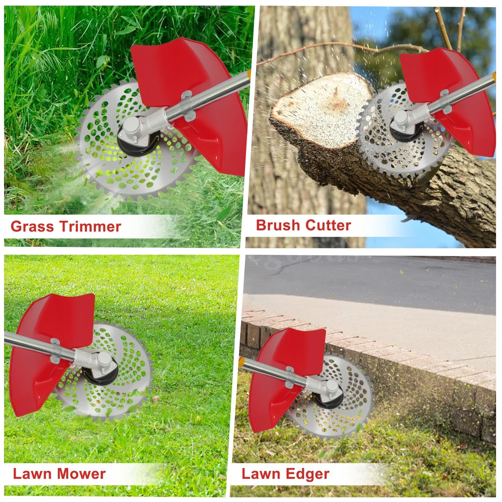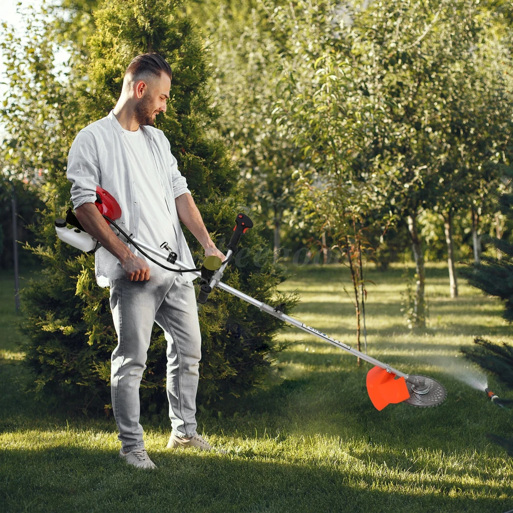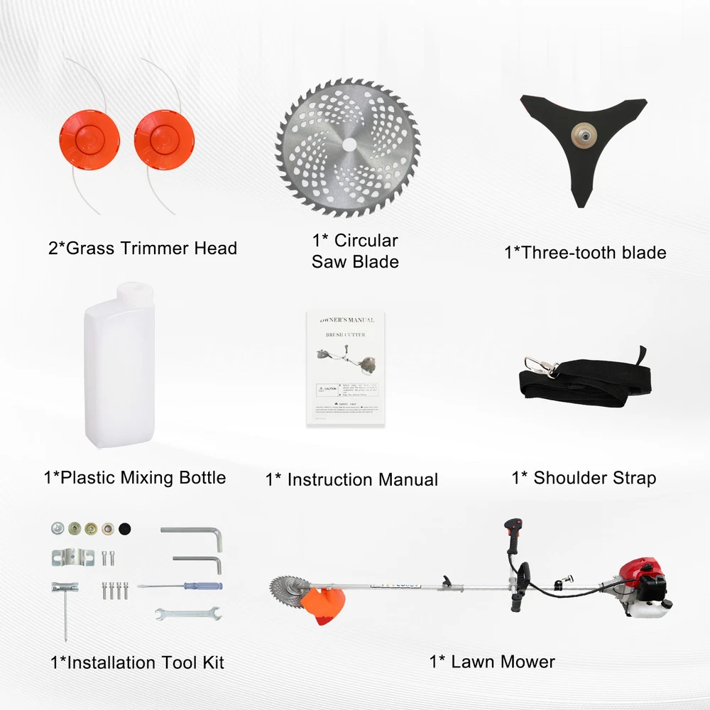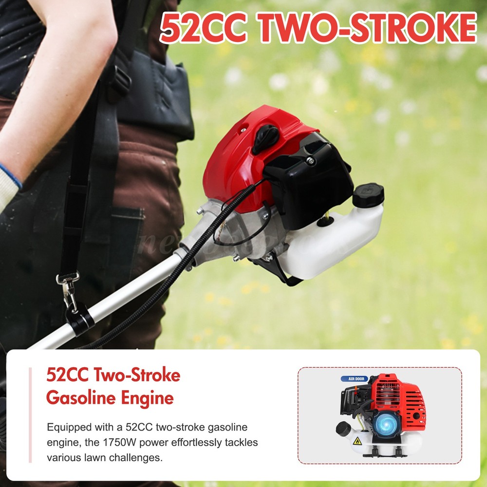 Description: It is an efficient and reliable weed wacker for lawn care. Brush Cutter and String trimmer are ideal for trimming around the garden and heavy work on brambles and thick brushes. It only takes a few seconds to convert, so you can use it quickly and easily trim around flowerbeds, sidewalks, and foundations. Gas Weed Eater String Trimmer/Brushcutter contains 4 cutter heads, one 3T blade, two dual thread head,and one Hedge trimmer head. Weed wacker has an 18'' Cutting Path to cover more ground in less time, which makes lawn work more simple and more efficient. The wide safety guard is designed to help protect the operator by deflecting debris produced during the trimming operation. Do not operate the unit without a shield. Trimmer line without bumping, adjustable u-handle, shoulder strap, and ultra-lightweight design, along with superior ergonomics allow for reduced user fatigue. This trimmer/edger has everything to keep your yard looking fantastic. 52cc 2-cycle Efficient Working 4 IN 1 Multi-use Trimming Heads Protective Cover Caring for Your Safety Easy-to-use&safe Double Switch Control Adjustable Shaft Design for Different People Adjustable Shoulder Strap Lightening Your Load Specification: Type: Gasoline Lawn Mower Engine Type: Single cylinder, air-cooled, 2-stroke Carburetor Type: Diaphragm type Displacement: 52cc Starting System: Recoil start Fuel Tank Capacity: 1.25L Drive Shaft Type: Hard shaft/soft shaft Operation Type: Backpack/side-mounted High Stability Speed: 10800r/min Ignition Type: Non-contact Max Power: 1.75kw Net Weight: 9.5kg Cutting Diameter: Blade 250mm, Nylon head 400mm Features: 【Adjustable Straight Shaft Design, Customize Your Trimming Experience】This gasoline lawn mower features an adjustable straight shaft design, making it easy to trim hard-to-reach areas under bushes and perform precise trimming in specific areas of your lawn. Simply adjust the straight shaft to meet your personalized needs. 【Ergonomic Handle Design for Effortless Control】The handle is ergonomically designed to ensure comfort during extended use, eliminating wrist strain. The height and angle of the handle are adjustable, allowing every user to find the most comfortable operating position. 【52cc Two-Stroke Gasoline Engine, Powerful Performance】Equipped with a 52cc two-stroke gasoline engine, the 1750W power effortlessly tackles various lawn challenges. Whether it's thick grass, weeds, or shrubs, it can cut through them quickly, revitalizing your garden. 【4-in-1 Trimmer Heads for Versatile Use】Comes with 4-in-1 trimmer heads including a three-tooth blade, nylon trimmer head, pole saw head, and hedge trimmer head. One machine handles all garden issues with ease. 【Large Capacity Fuel Tank for Long-Lasting Operation】The 1250ml fuel tank capacity ensures continuous work. With up to 45 minutes of runtime, you can focus on trimming and beautifying your garden without frequent refueling. 【Easy-to-Remove Baffle for Safe Operation】The easy-to-remove baffle prevents debris from splashing, ensuring safe operation. The transparent fuel tank allows you to monitor the fuel level at any time, ensuring smooth work. 【Powerful and Stable Gasoline Weed Eater】Compared to electric weed eaters, gasoline weed eaters are more powerful and stable. There's no need to worry about battery aging or power cord length, making your work more free and unrestricted. Package Contents: 1 x Lawn Mower 4 x Detachable Trimmer Heads (Three-tooth blade, Nylon trimmer head, Pole saw head, Hedge trimmer head) 1 x Plastic Mixing Bottle 1 x Shoulder Strap 1 x Protective Cover 1 x Installation Tool Kit (Hex wrench, socket wrench, double-headed screwdriver, handle, aluminum tube, tightening screws) 1 x User Manual Note: 1. Please allow slight errors due to manual measurement. 2. Due to display and lighting differences, the actual product may slightly differ from the pictures. 3. Product details may vary due to different production batches. If you are concerned about price differences, please purchase with caution. Thank you for your understanding. 4. If you have any questions about the product, please contact us. On Jul 18, 2025 at 07:15:17 PDT, seller added the following information: