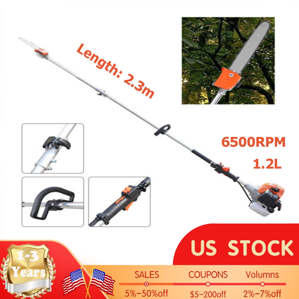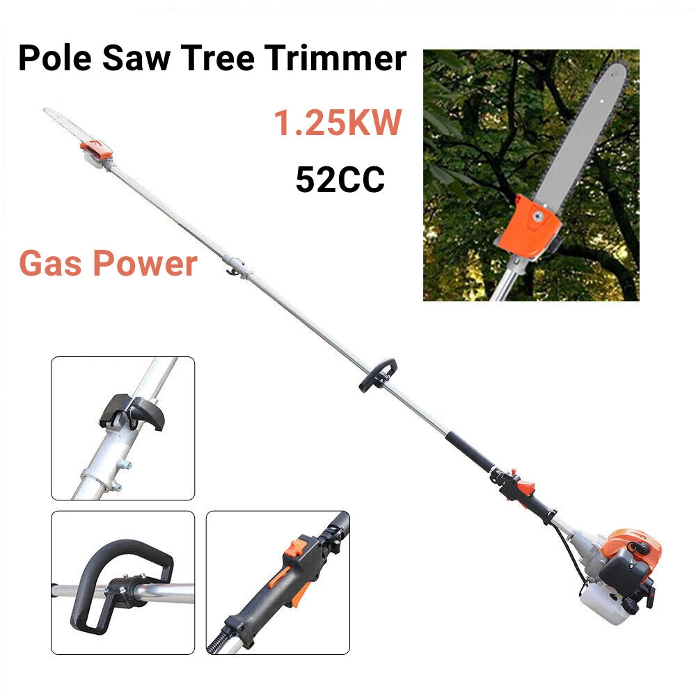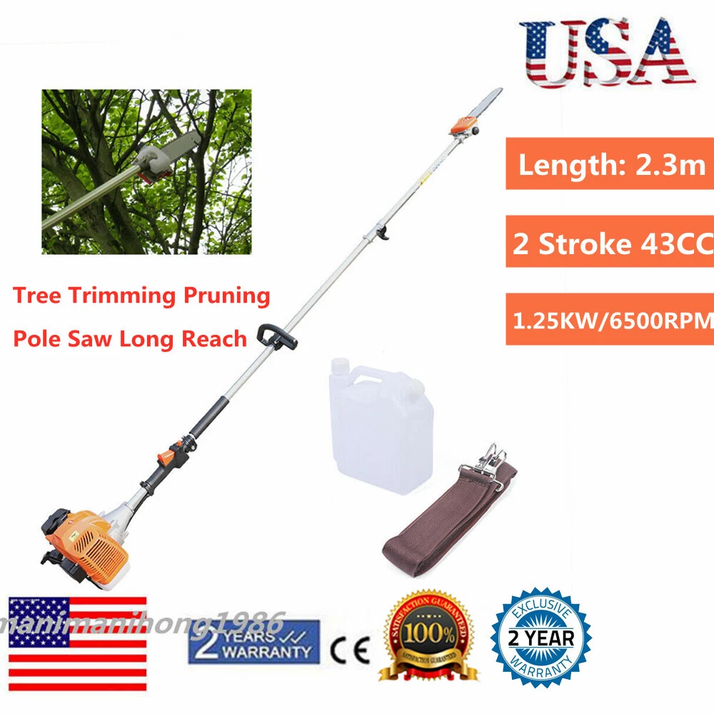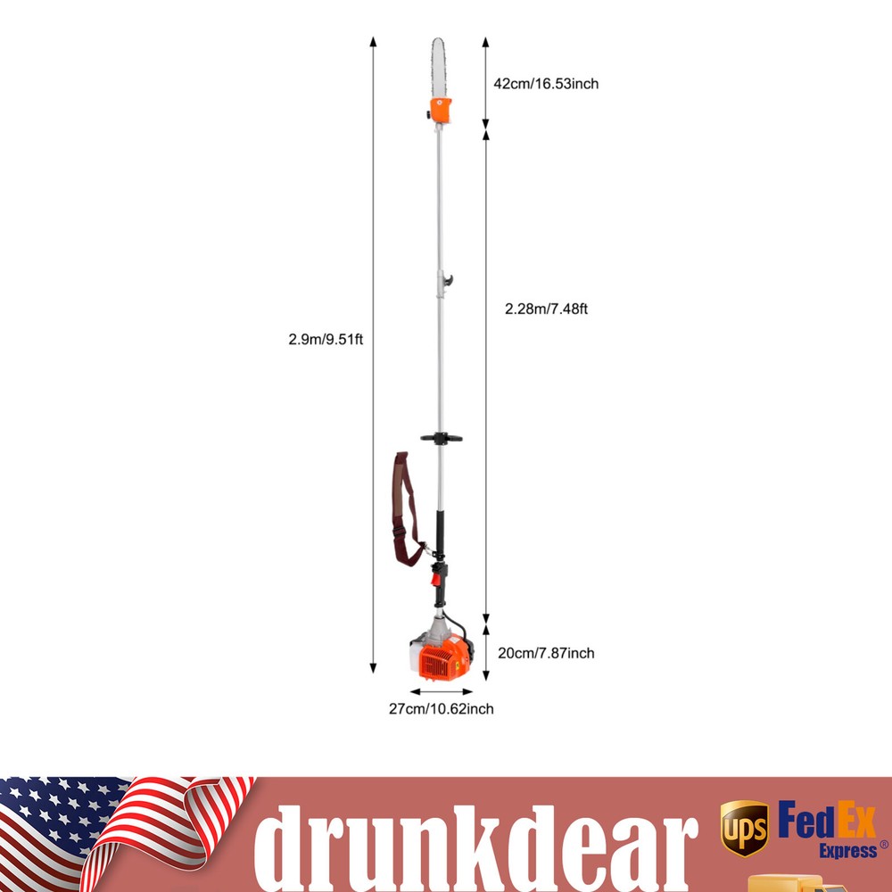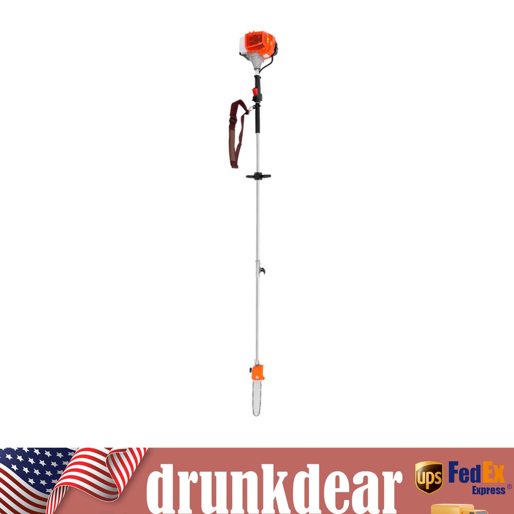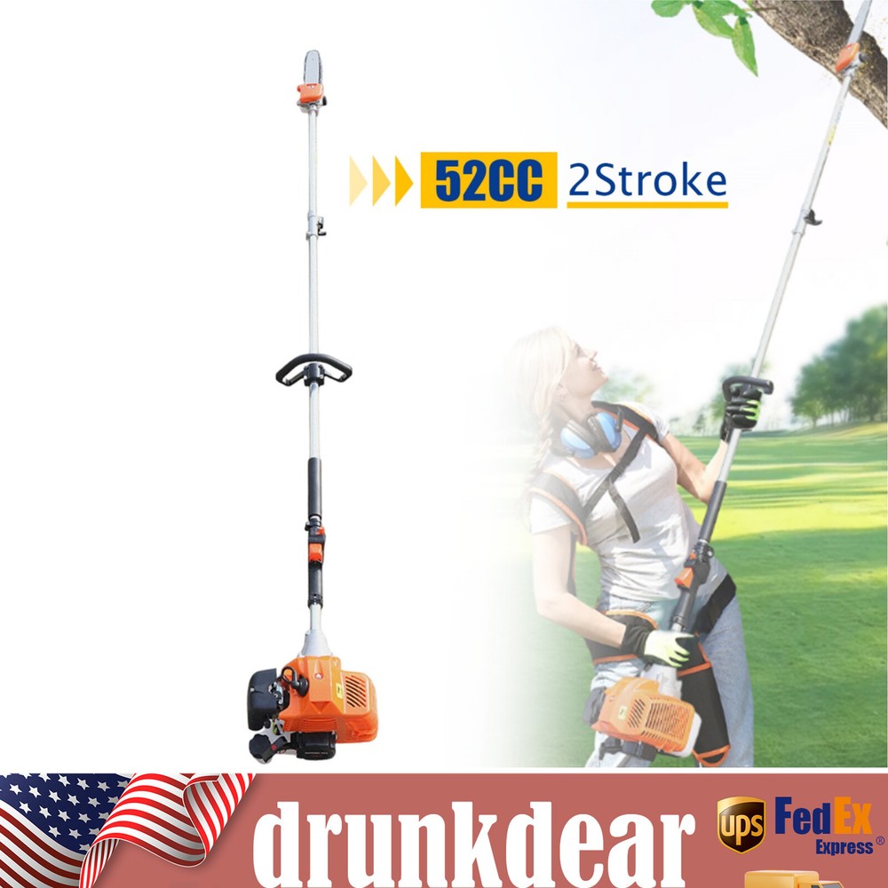 Specification Material: Aluminum Alloy Engine Type: Single Cylinder, Air-cooled, 2-stroke Gasoline Engine Fuel Consumption Rate: 480g/kw.h(1.05lbs/kw.h) Engine Displacement: 52cc Maximum No Load: 9500r/min Maximum Power: 1.25KW/6500RPM Fuel oil Mixture: 25:1 (2T engine oil) Fuel Tank Capacity: 1.2L/0.32gal Machine Weight: About 9kg/19.84lb Pole Length: 2.3m/90.55in Size: 35*35*250cm/13.78*13.78*98.43in (Plus Pole) Packing Size: 35*33*28cm/13.77*12.99*11in Package Included 1* High branch saw 1* Fuel Tank 1* Shoulder Strap 2 Stroke 52CC Chainsaw Pole Saw 3-HP Shaft Chainsaw Pruner Tree Trimmer Pole Description Are you still bothered by the unmanageable high branches in your yard? Then you can try our high branch saw. With it, you no longer need to risk climbing up a ladder or tree to trim branches. With its powerful 52cc engine, it gets the pruning job done easily and quickly. Its compact saw head can easily reach any corner without leaving a single weed or excess leaf behind. It will be your ideal choice! Key Features Powerful Engine: This high branch saw is powered by a two-stroke engine with a maximum power of 1.25 kW, so the powerful engine makes it possible to saw branches quickly and with less time and effort. Good Heat Dissipation: The engine housing has many cooling holes for heat dissipation, which prevent engine burn-out caused by long-term use and effectively extends its service life. Large Fuel Tank: The fuel tank has a capacity of 0.32gal, allowing the engine to work for long periods of time. You don't have to refill the tank frequently, which is very convenient. Great Durability: This high branch saw is mainly made of sturdy and durable aluminum alloy. This material will be uneasy to deform and rust. So the high branch has a long service life and you can use it with confidence. Safer: With this high branch saw you don't have to climb up the high trees to cut branches. The pole of this high branch saw is 90.55in long, so you can easily saw off high branches while standing on the ground, which is much safer for the user. Easy to Carry: This high branch saw is small and lightweight(19.84lb), and also comes with a shoulder strap and handle, making it easy to carry. User-friendly Design: The fuel tank is carefully designed to be visible in white and has a capacity of 0.32 gallons, making it easy for you to track the fuel level and refill in time for your convenience. Adjustable Height : You can remove the first section and reattach the bar with the saw head to the engine to get a shorter high branch saw for use at close range Low Fuel Consumption: With a fuel consumption rate as low as 480g/kw.h, it is very economical as it does not consume large amounts of fuel even after long periods of use. Guaranteed Customer Service: We aim to provide quality products and services. If you have any problems, please feel free to contact us. We will reply and solve the problem for you as soon as possible. Details Non-slip Handle: This high branch machine has a comfortable non-slip handle. This handle allows you to hold the saw more firmly and makes the operation more precise. Extension Pole: This high branch saw has a 90.55in pole so you can easily saw off high branches in a very safe and efficient way. Fuel Tank: The fuel tank has been carefully designed. It separates the oil and petrol tanks to facilitate accurate oil and petrol dispensing. Wide Shoulder Strap: This high branch saw comes with a wide shoulder strap, so you can carry it on your shoulder. This way, the operation will be more stable and help reduce vibration and fatigue. Application It is suitable for agriculture, forest fire fighting, horticulture, and other fields, to saw through high-altitude branches, small trees, etc. Specification Material: Aluminum Alloy Engine Type: Single Cylinder, Air-cooled, 2-stroke Gasoline Engine Fuel Consumption Rate: 480g/kw.h(1.05lbs/kw.h) Engine Displacement: 52cc Maximum No Load: 9500r/min Maximum Power: 1.25KW/6500RPM Fuel oil Mixture: 25:1 (2T engine oil) Fuel Tank Capacity: 1.2L/0.32gal Machine Weight: About 9kg/19.84lb Pole Length: 2.3m/90.55in Size: 35*35*250cm/13.78*13.78*98.43in (Plus Pole) Packing Size: 35*33*28cm/13.77*12.99*11in Package Included 1* High branch saw 1* Fuel Tank 1* Shoulder Strap Notes It is necessary to add oil to the engine oil tank and gasoline tank to mix, shake it evenly before use Please note that you must use two-stroke oil, not four-stroke oil or other engine oil, otherwise it will easily lead to pulling or other problems. Please allow the slight color difference caused by the shooting light and 1-3 cm error due to manual measurement, and make sure you do not mind before ordering. Payment Delivery details Terms of sales About us Contact us Payment We accept ebay payment 。 Fees such as import duties, taxes are not included in the item price or shipping costs. These charges are the buyer's responsibility. Delivery details Shipping: 2-9 working days to: USA Terms of sales We maintain high standards of excellence and strive for hundred percent customer satisfaction. Feedback is very important to us. We hope that you contact us immediately before you give neutral or negative feedback, so that we can address your concerns. It is impossible to address issues if we do not know about them! About us Your satis faction is our ultimate goal. We work hard to earn your trust and future business. Our certified technicians have tested each item before shipping. The unit comes with 1 year limited warranty on all manufacturing defects. a) If you receive a defective item, you may return it or ask for a discount. Please contact us within 14 days after you receive the package. b) What you returned must be intact and in its original packaging as re? u. Customer is responsible for shipping costs of the returned item. c) We will cover the cost of shipping back t with the shipping rate indicated in the registration page. We will send you a new unit or refund the full payment you paid. 