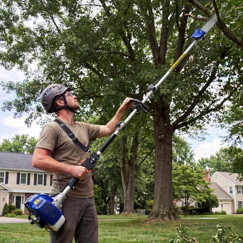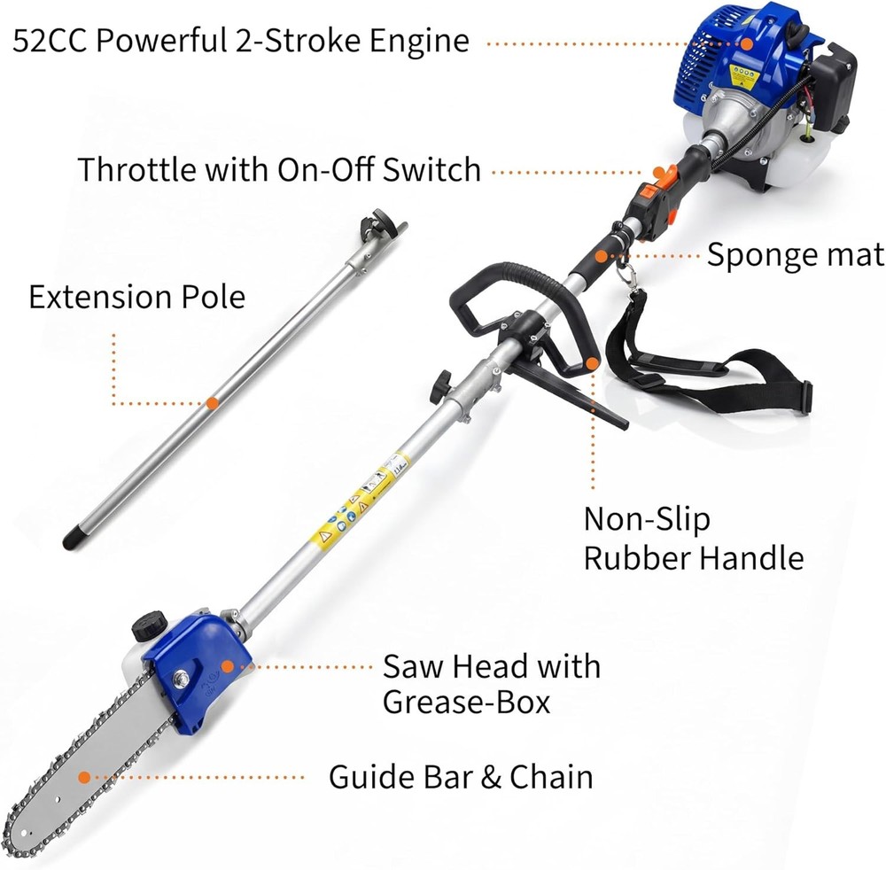 52CC Pole Saw 2 Stroke Gas Powered 16 Ft Triming Height for Tree Trimming Branch About this item 【Two-Stroke High-Power Engine】 This pole saws for tree trimming feature a 52cc two-stroke engine delivering 2.0 horsepower of robust power at 3000 RPM. This high-performance capability enables rapid cutting through 8-inch thick branches, meeting demanding cutting requirements. 【16-Ft Height Safety Pruning】 This gas-powered pole saw reaches up to 16 feet (including operator height), enabling safe pruning of high branches without ladders. With both feet firmly planted on the ground, you can focus on trimming tall branches while maintaining efficiency and safety. 【Smooth and Precise Cutting】 The gas-powered pole saw features a 12-inch guide bar paired with a high-hardness steel chain, delivering smooth and precise cutting performance to significantly boost pruning efficiency. As a reliable heavy-duty tree maintenance saw, it excels in various outdoor tasks including tree felling and pruning. 【Upgrade to Energy-Efficient Engine】 The pole saw features an upgraded energy-efficient engine paired with a 1200ml high-capacity fuel tank. A single full tank enables continuous operation without worrying about cord length or charging issues, reducing the frequency of refueling. Note: The recommended fuel mixture ratio for the two-stroke engine is oil:gasoline = 1:25. 【Balanced Design】 The pole chainsaw features an anti-slip handle and shoulder strap, combined with balanced power distribution to effectively reduce hand pressure and minimize fatigue during extended trimming sessions. Its comfortable handling experience is tailored for professional landscaping applications, enabling longer-lasting pruning operations. Assembly Required Yes Brand Unbranded Cutting Length 12 in Engine Size 52CC Engine Type 2-Stroke Features Ergonomic Power Source Gasoline Type Pole Chainsaw