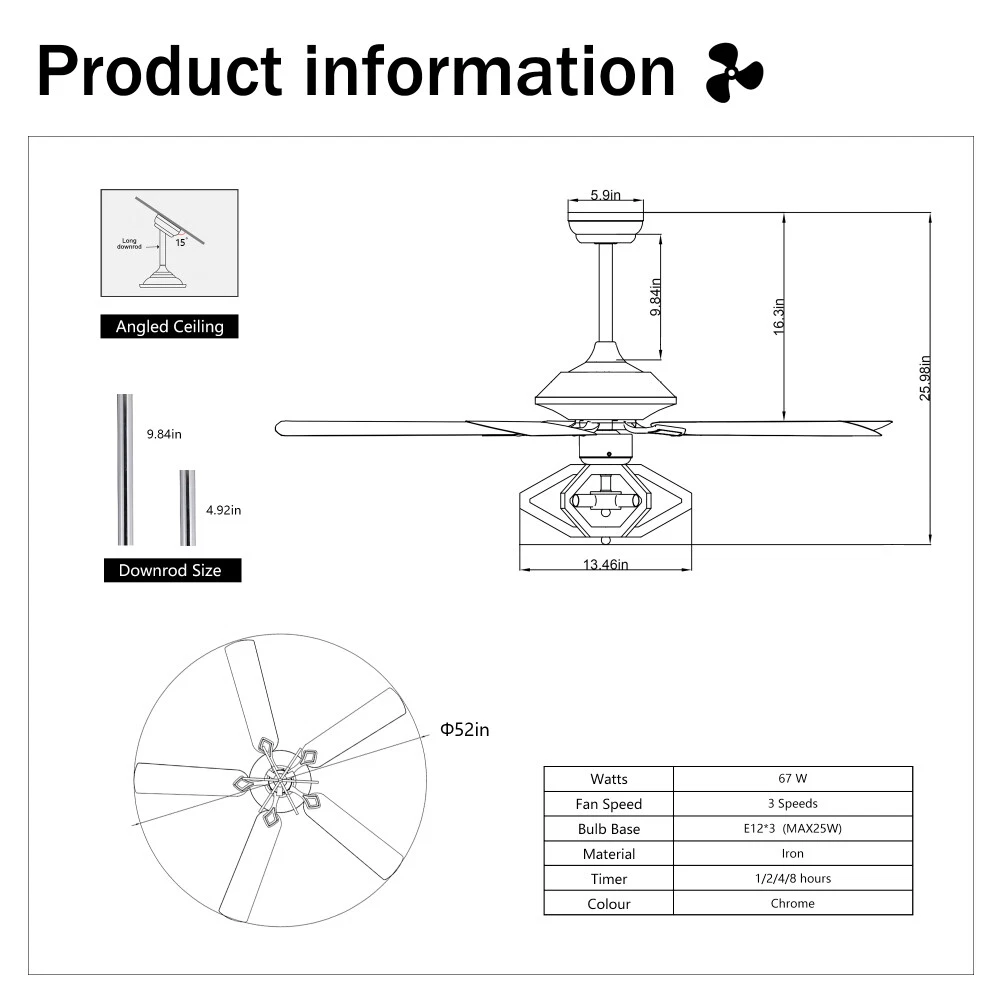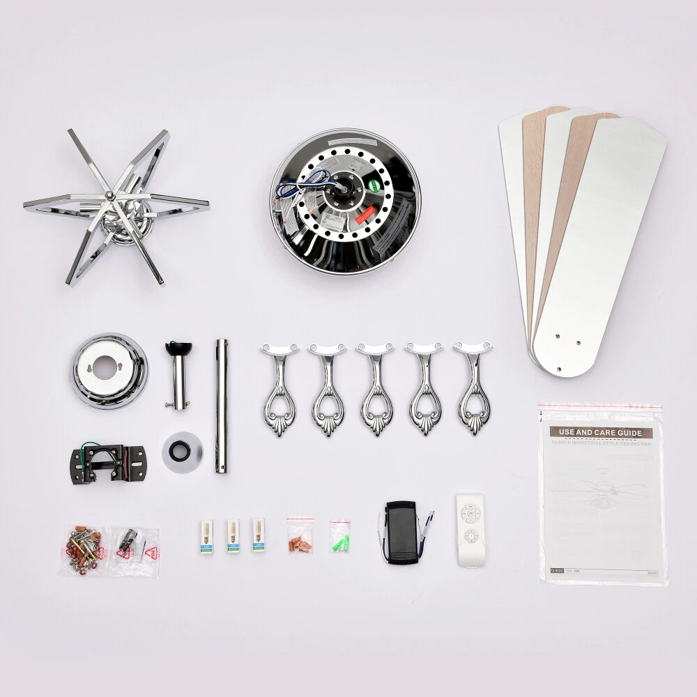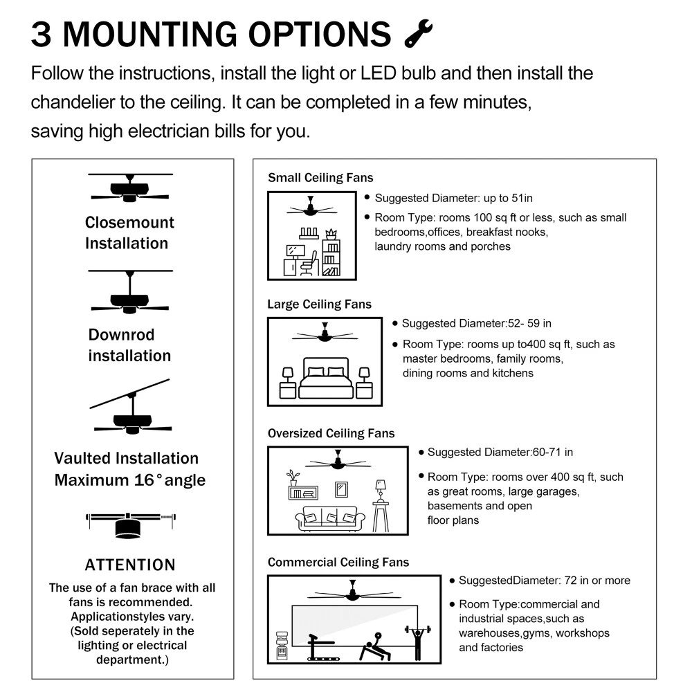 【3 Speed & Quiet Motor】The motor runs smoothly, providing powerful airflow and multiple vents for powerful wind power. Low noise provides a non-interfering home environment. There are 3 speeds of high, medium and low that can be adjusted to meet your different needs and maintain the ideal comfort level. 【Durable 5 Reversible Fan Blades】In summer, the ceiling fan crystal light rotates clockwise to provide a cool wind. And the fan lamp rotates counterclockwise, promoting indoor air circulation during the winter to reduce energy costs. The reverse air flow feature allows you to quickly change the direction of the fan, for a proper distribution of air. 【Safe & Durable Ceiling Fan Light】The sturdy wooden blades are well machined to ensure smooth operation of the fan lamp without swaying. It has 3 functions of lighting, decoration and fan to meet your various needs 【SILENT MOTOR】:100% copper AC motor with balanced blade assembly ensures smooth and noiseless operation