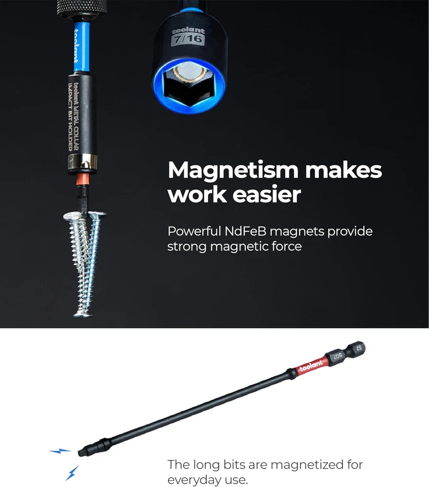 toolant Impact Driver Bit Set,52-Piece S2 Steel Screwdriver Bit Set,Hex,Torx,Phillips,Slotted,Square Bits and Nut Driver with Case Description Features: Complete range of products: The toolant impact driver bit set includes hex, torx, philips, SQ, SL, PZ screwdriver bits, nut drivers, bit holder and socket adapter, meeting the requirements for various screw fasteners.Compatible with all 1/4'' universal prower drills and impact drivers, such as Dewalt and Milwaukee Impact-resistant bits: The toolant impact bits are crafted using impact-resistant materials, capable of withstanding high torque, reducing the risk of breakage, and extending the lifespan well beyond that of standard bits.;Manganese Phosphate surface to prevent rust. Magnetic impact torx bits and nut driver helps you easy pick up screws.Magnetic bit holder can enhance the magnetic of 1" bits.The magnetism doesn’t decay after multiple uses. Easy identification: Different colors correspond to different types of screwdriver bits for easy identification. Additionally, each type in the set is marked with a colored ring following the toolant bit color-coding system for quick recognition. Thoughtfully designed:Screwdriver bit set with box for easy storage;Transparent box for clear visibility of contents, and a clip ensures secure closure. If you have any questions, please tell us and we will provide you with a solution Product Details: Manufacturer: toolant Item Weight: 1.57 pounds Package Dimensions: 8.86 x 8.66 x 1.34 inches Batteries Included?: No Batteries Required?: No Handling We will ship all orders within 3 business day of payment. Delivery We take pride in offering fast and reliable delivery for your orders! We are committed to getting your products to you as quickly as possible. Generally, we would like to inform you that all orders will be delivered to you within 1-3 business days after processing.However, in some cases, delivery times may vary depending on the buyer's location. Especially in remote or rural areas, the expected delivery time may be extended. In such situations, we do our best to ensure that your order reaches you as quickly as possible.If there are any delays, we will be happy to contact you to explain the situation. Our goal is to enhance your satisfaction with our fast delivery times. We work diligently to ensure that your order arrives safely.Trust us and enjoy our speedy delivery! Return Policy All items qualify for returns within 30 days of receipt. Buyer is responsible for return shipping on any item that is not damaged. Feedback We take our reputation seriously, we buy and sell online, so we understand the value of trust. If you are unsatisfied with your order, please contact us and we will work with you to resolve it to your satisfaction.