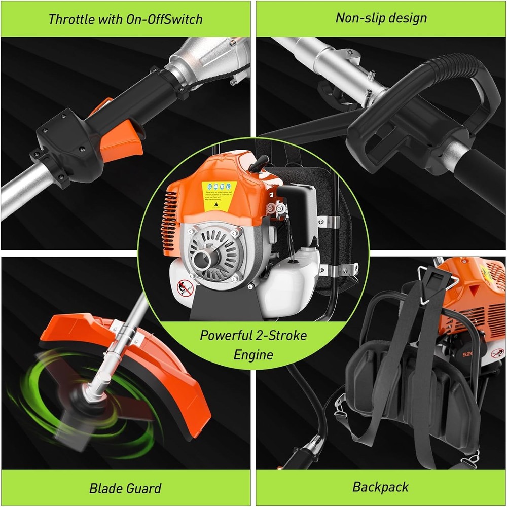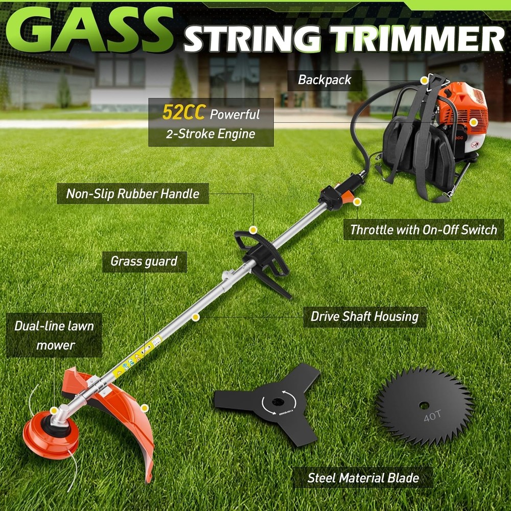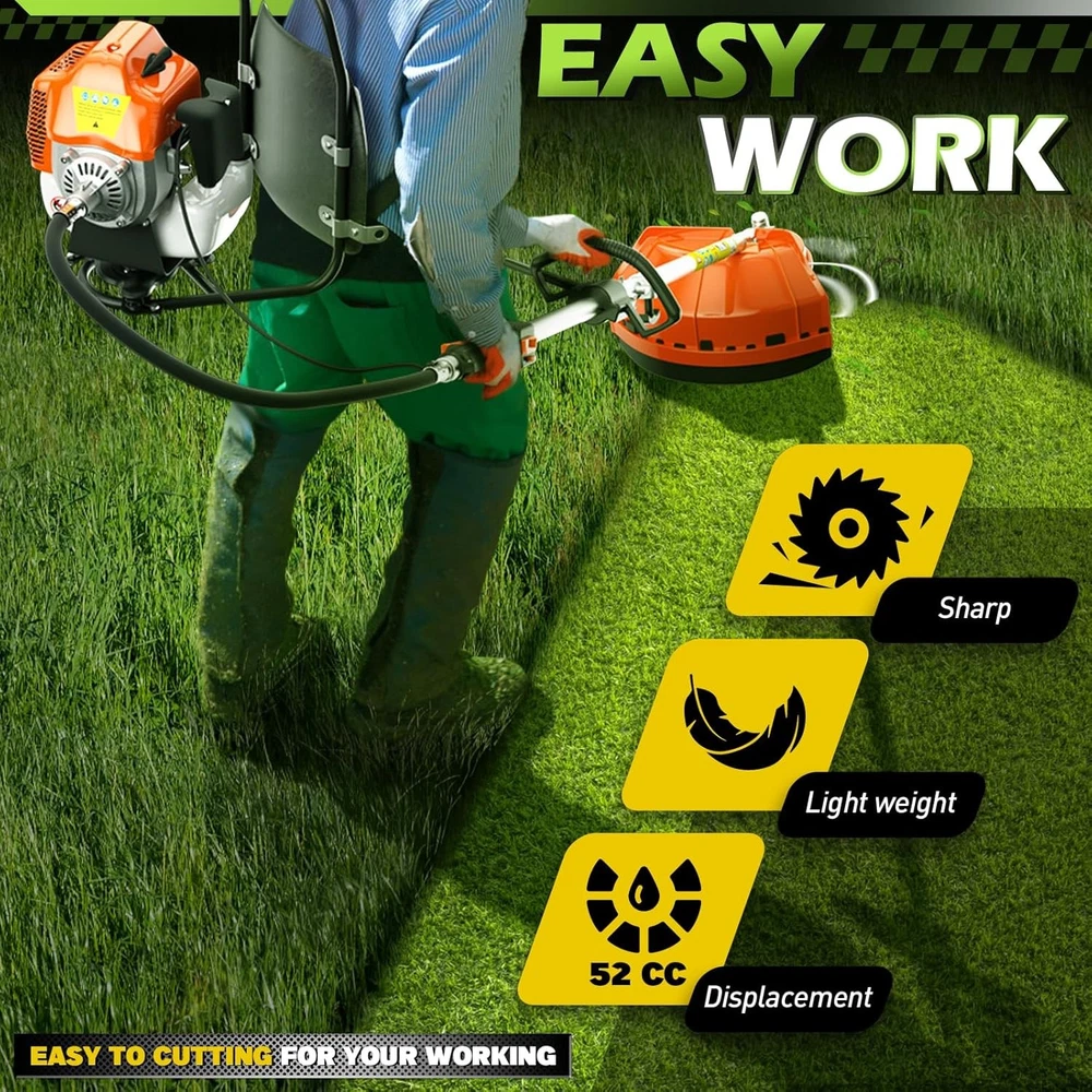 52cc 2-Stroke Weed Eater Gas Powered, 3 in 1 Gas Brush Cutter,Gas String Trimmer and Gas Weed Wacker Trimmer for Weeds and Grass About this item 1. Powerful 52cc 2-Stroke Engine Features a robust 1100W gas-powered engine that delivers reliable cutting performance through dense weeds and tough vegetation. Fuel-efficient design reduces consumption while maintaining maximum power output. 2. Versatile 3-in-1 Cutting System Includes three interchangeable heads: 5-inch string trimmer, 9-inch 3-tooth blade, and 10-inch 40-tooth circular blade. Handles everything from fine grass trimming to heavy brush clearing with quick-change convenience. 3. Ergonomic Backpack Design Padded shoulder straps and balanced weight distribution minimize user fatigue. Front handle provides optimal control for extended operation in large areas. 4. Professional-Grade Applications Ideal for maintaining gardens, fences, pathways, and property perimeters. Effectively clears overgrown vegetation that standard trimmers cannot handle. 5. Complete Ready-to-Use Kit Includes engine unit, backpack frame, wrench, fuel mixing bottle, all cutting heads, and necessary accessories. Fuel mix ratio: 1:25 (oil to gasoline). Product information Specification: Power source: 2-storke Engine power:1100W Fuel capacity:1000ml Idle speed:3000rpm Shaft type:straight Package: 1x 1000ml fule engine head 1x backpack holder 2x blades(3-T&40-T) 1x trimmer head 1x shouder blet 1x wrench 1x proportioning pot 1x instruction On Oct 2, 2025 at 08:11:55 PDT, seller added the following information: