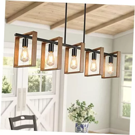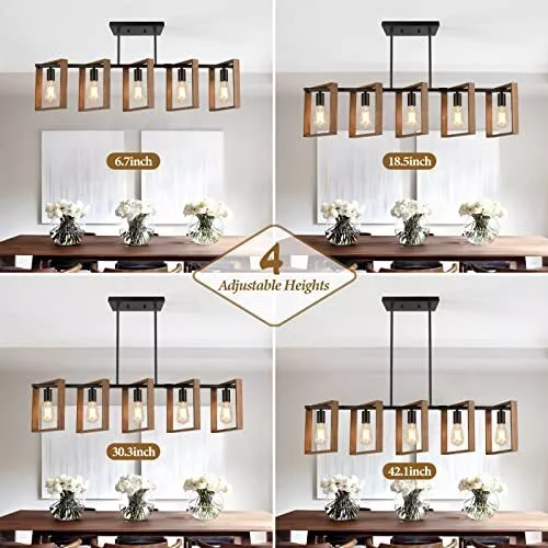 Return Policy Fast Delivery Trusted seller 53’’ Farmhouse Kitchen Island Lighting, 5-Light Adjustable Dining Room Light Fixtures, Rustic Wood Chandeliers Black Hanging Light Fixtures for Kitchen, Pool Table Lights, Bulbs Not Included Product Description Wood Island Lights For Dining Room: This 5-Light wood chandeliers featured with high-quality natural wood&black metal, adds endless farmhouse/rustic/retro/vintage/industrial chic over your dining tables or kitchen islands. The solid but minimalist square framework shaped a high-class&rich look kitchen dining light over your dinner tables. Simple open box makes it no difficult to clean at any time. Excellent additions for your dining room 4 Adjustable Hanging Heights: We featured this farmhouse island lights with 8 detachable rods, hence you can freely screw the rods and adjust 4 hanging heights which range from 17.3’’-52.8’’. Super smart design fit for diverse ceiling heights, fully personalized pendant light fixtures for your kitchen choice All Mounting Parts Covered: We kindly includes all mounting accessories inside the package for your quick installation. Paired with the clear manual instruction, you may easily get a wood hanging light by following the procedures carefully. If t’s any missing issue, please let us know without hesitation. We’ll troubleshoot for you immediately Suggested Bulbs & Fully Dimmable: Our 5-Light rustic wood chandeliers are adaptable with all E26 bulbs such as LED, CFL, Incandescent, Flame, Halogen bulbs( Bulbs NOT Included). 100 watt Max support super bright light and a 360 degree seamless lighting source which enable to light up all your dining area. What’s more, this pendant light can be fully dimmed when work with compatible dimmer switch and bulbs Flexible Structure For Versatile Use: Except for the adjustable rods, the 5 wood boxes are flexible to rotate from 0-90 degrees. DIY your own farmhouse pendant light as your wish. What a customized hanging wood chandeliers versatile fit for most indoor area such as kitchen islands, dining tables, restaurants, corridors, cafe tables, bar counter, pool tables, library,etc Shipping Returns Payment Shipping Shipping is FREE to all addresses other than APO/PO boxes in the lower 48 states. All our stock ships from US-based warehouses. Shipped via USPS or UPS (depending on location and package weight) Unless stated otherwise, all orders will ship within 24-72 hours of your payment being processed. Check our feedback to see the great reviews of FAST shipping we offer. Returns Seller does not accept returns Payment We currently accept payment via eBay managed payments only. Once payment is cleared, we will dispatch your shipment within 1-3 business days. Please refer to the "Shipping" tab for more information regarding shipping speed to your destination.
