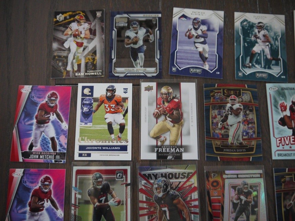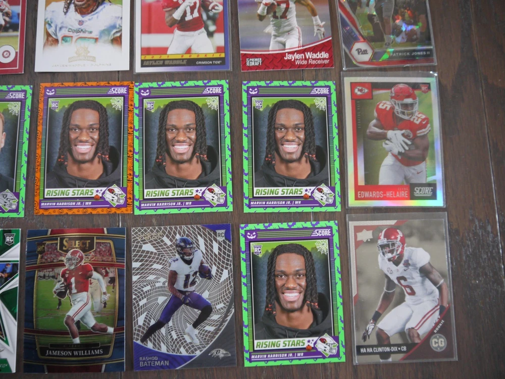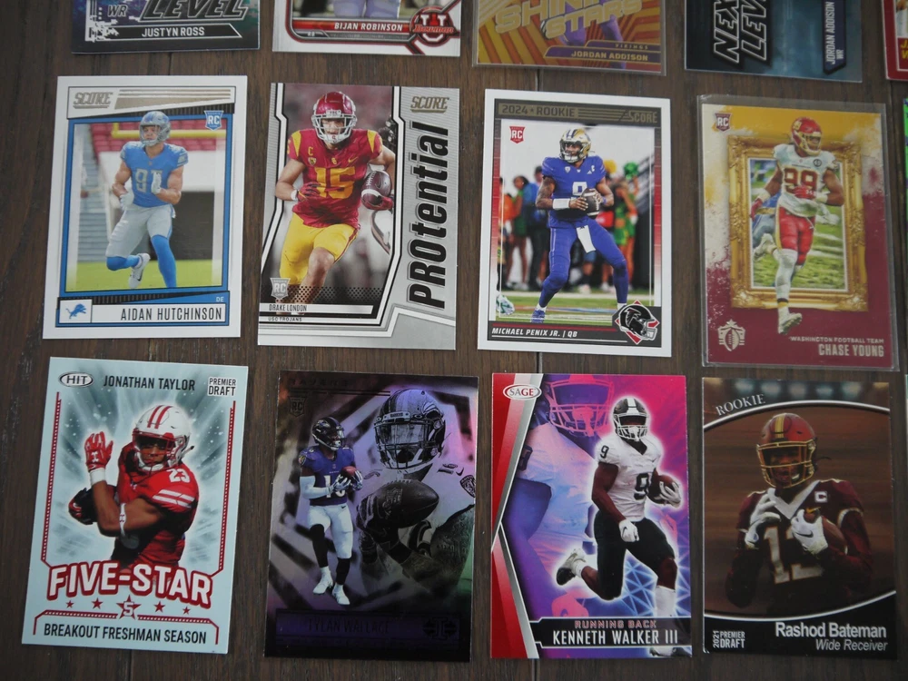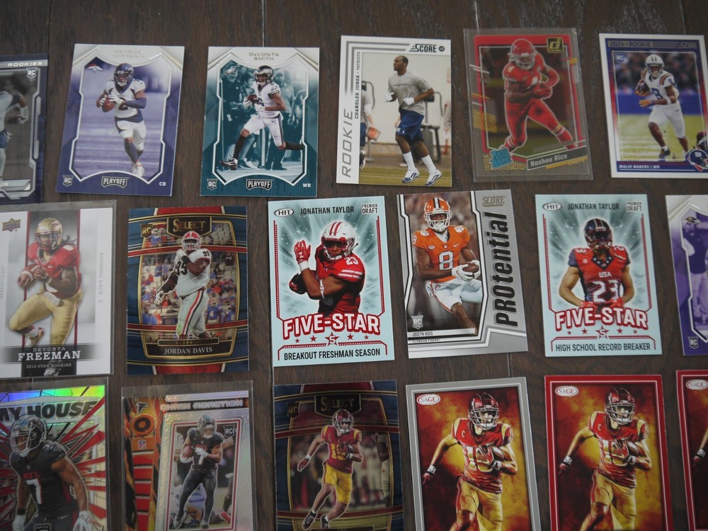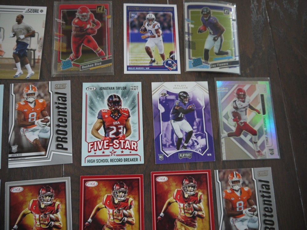 Elevate your football card collection with this substantial lot of 53 modern rookie cards, featuring big names like Bijan Robinson, Rashee Rice, Jordan Addison, Zay Flowers, John Metchie III, and Justyn Ross. Box K | Free Shipping