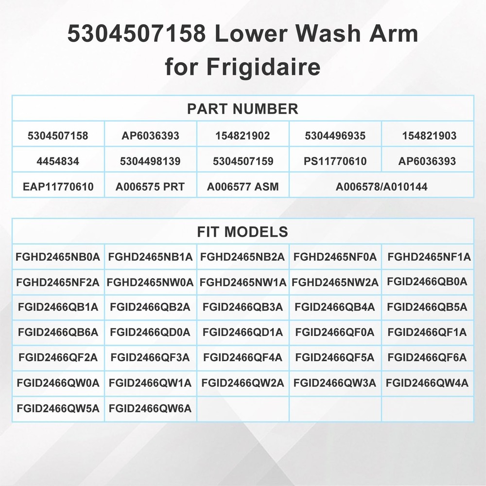 Part #s 5304507158, AP6036393, 154821902, 5304496935, 154821903, 5304498139, 5304507159, PS11770610, EAP11770610, A006575 PRT, A006577 ASM, A006578/A010144 Dishwashers Lower Spray Arm Assembly Perfect Fit: 5304507158 lower spray arm for Frigidaire dishwasher, upgrade your dishwasher’s performance with our premium dishwasher parts & accessories Part Number: 5304507158, AP6036393, 154821902, 5304496935, 154821903, 4454834, 5304498139, 5304507159, PS11770610, AP6036393, EAP11770610, A006575 PRT, A006577 ASM, A006578/A010144 Fit Models: FGHD2465NB0A, FGHD2465NB1A, FGHD2465NB2A, FGHD2465NF0A, FGHD2465NF1A, FGHD2465NF2A, FGHD2465NW0A, FGHD2465NW1A, FGHD2465NW2A, FGID2466QB0A, FGID2466QB1A, FGID2466QB2A, FGID2466QB3A, FGID2466QB4A, FGID2466QB5A, FGID2466QB6A, FGID2466QD0A, FGID2466QD1A, FGID2466QF0A, FGID2466QF1A, FGID2466QF2A, FGID2466QF3A, FGID2466QF4A, FGID2466QF5A, FGID2466QF6A, FGID2466QW0A, FGID2466QW1A, FGID2466QW2A, FGID2466QW3A, FGID2466QW4A, FGID2466QW5A, FGID2466QW6A Built to Last: 5304507158 dishwasher spray arm are made from high-quality materials to withstand the toughest dishwashing loads Easy to Install: No hassle – just a quick and easy installation that’ll have your dishwasher running like new