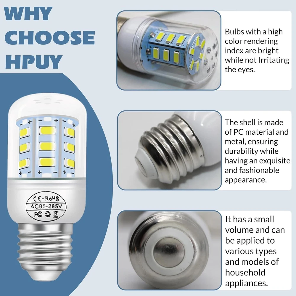 Product Details Brand: HPUY Light Type: LED Special Feature: Energy Efficient, Long Lasting Wattage: 3.5 watts Bulb Base: E26 Specific Uses For Product: Appliance, Lamp Light Color: White Voltage: 110 Volts Unit Count: 1.0 Count Number of Items: 2 Material: Plastic, Metal Included ComponentsFor Frigidaire Refrigerator Light Bulb*2PCS Item Package Quantity: 1 Product Dimensions: 1.22"W x 2.95"H Manufacturer: HPUY Item Weight: 2.11 ounces Country of Origin: China Color: 2-packs Special Features: Energy Efficient, Long Lasting Batteries Required?: No Product Dimensions : 1.22 x 1.22 x 2.95 inches; 2.12 ounces Manufacturer : HPUY Country of Origin : China Brand: HPUY Light Type: LED Special Feature: Energy Efficient, Long Lasting Wattage: 3.5 watts Bulb Base: E26 Energy-Efficient LED Technology:Save on energy bills with this 3.5W led refrigerator light bulb, which offers bright, cool white light while consuming less power than traditional bulbs. Ideal for maintaining optimal visibility inside your refrigerator Easy Installation:This kei d34l refrigerator bulb 3.5w is designed as a manufacturer substitution, meaning it fits seamlessly in place of your old bulb without any modifications. Always remember to disconnect power before installation to ensure safety After sales:If you encounter any problems during use, please contact HPUY for timely assistance. Customer satisfaction is our top priority