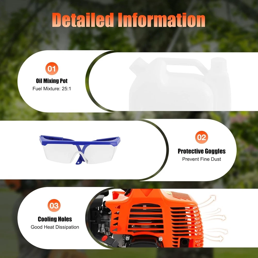 Product Description Description Are you still bothered by the unmanageable high branches in your yard? Then you can try our high branch saw. With it, you no longer need to risk climbing up a ladder or tree to trim branches. With its powerful 52cc engine, it gets the pruning job done easily and quickly. Its compact saw head can easily reach any corner without leaving a single weed or excess leaf behind. It will be your ideal choice! Specification Material: Aluminum Alloy Engine Type: Single Cylinder, Air-cooled, 2-stroke Gasoline Engine Fuel Consumption Rate: 480g/kw.h(1.05lbs/kw.h) Engine Displacement: 52cc Maximum No Load: 9500r/min Maximum Power: 1.25KW/6500RPM Fuel oil Mixture: 25:1 (2T engine oil) Fuel Tank Capacity: 1.2L/0.32gal Machine Weight: About 9kg/19.84lb Pole Length: 2.3m/90.55in Size: 35*35*250cm/13.78*13.78*98.43in (Plus Pole) Packing Size: 35*33*28cm/13.77*12.99*11in Package Included 1* High branch saw 1* Fuel Tank 1* Shoulder Strap Notes 1. It is necessary to add oil to the engine oil tank and gasoline tank to mix, shake it evenly before use 2.Please note that you must use two-stroke oil, not four-stroke oil or other engine oil, otherwise it will easily lead to pulling or other problems. 3.Please allow the slight color difference caused by the shooting light and 1-3 cm error due to manual measurement, and make sure you do not mind before ordering.