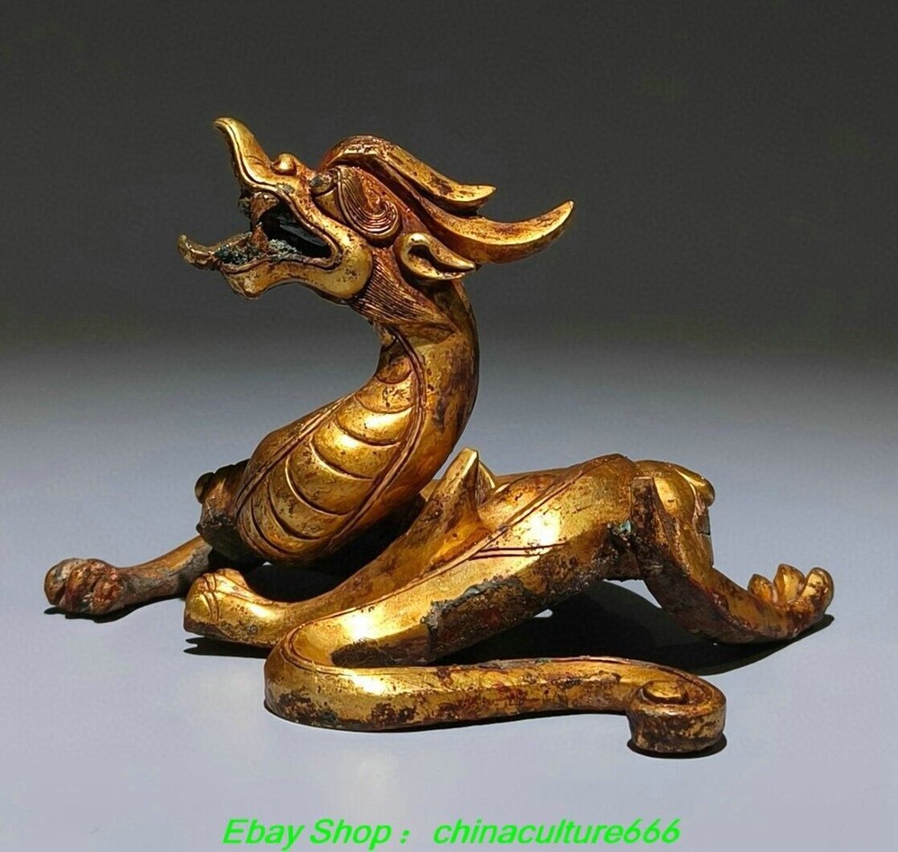 5.3"Old Chinese Han Dynasty Bronze Ware Gold Dragon Loong Statue Sculpture