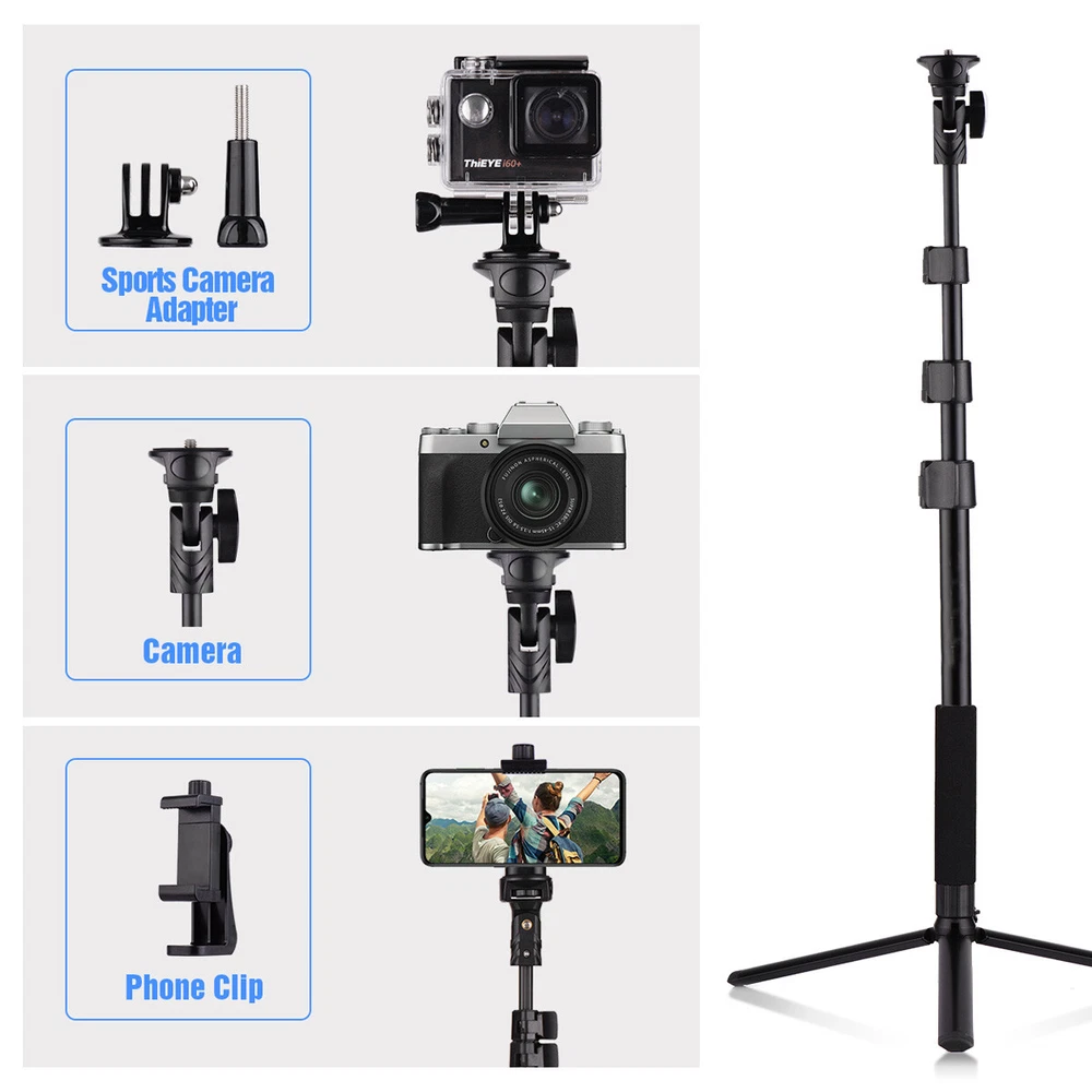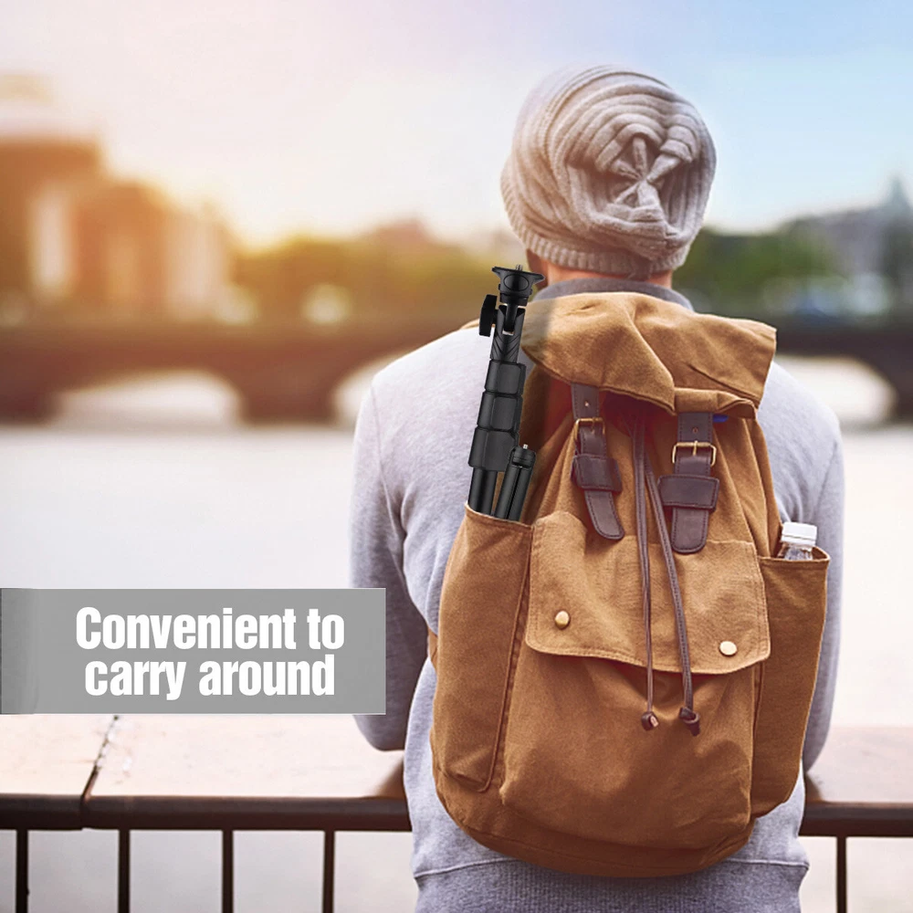 Features: 【Selfie Stick & Mini Tripod 2-in-1】 To own this extendable selfie stick + detachable mini tripod kit, you not only can take selfies with great flexibility, but also can take pictures/record videos with excellent stability while liberating your hands. Perfect for selfies, group photos, vlogging, podcasts, live video, online chatting, etc. 【54-inch Fully Extendable Selfie Stick】 The selfie stick can be fully extended to max. 54 inch with the mini tripod, which enables you to get a wider shooting range and capture more smiling faces and more beautiful scenery. Telescopic and portable design makes it suitable for travel, sports activities, camping, family gatherings and so on. 【Sturdy Mini Desktop Tripod】 Made of sturdy aluminum alloy material, plus non-skid rubber feet, the mini tripod offers great safety and reliability for your devices. Folded length is only 18.5cm, which makes it more convenient to carry around. 【Wide Compatibility】 Universal 1/4 inch screw design, and comes with a phone holder and a sports camera mount adapter, the selfie stick tripod is compatible with digital camera, mirrorless camera, action camera and most smartphones. 【Wireless Remote Shutter for Smartphone】 The remote shutter is compatible with iOS and Android smartphones. Do not need APP, instantly wireless BT connection, easy to operate and free your hands to catch memorable moments in your life. Specifications: Material: Aluminum Alloy Selfie Stick Length: 42cm-120cm/16.5inch-47inch Tripod Folded Length: 18.5cm/7.3in Connector: 1/4 inch screw Remote Shutter Power Supply: 1 * CR2032 battery(included) Packing List: D8398 1 * Selfie Stick 1 * Mini Tripod 1 * Remote Shutter 1 * Phone Holder 1 * Sports Camera Mount Adapter Hello,welcome to the store,what can I help you?