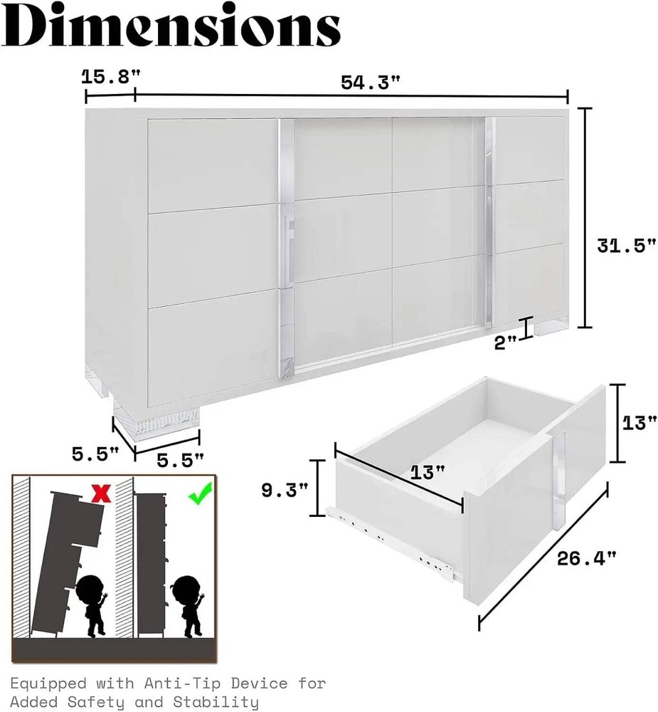 54 Inch High Gloss 6 Drawer Dresser Modern Chest for Bedroom Storage Transform Your Space with the Ljustra 54" High Gloss Dresser Elevate your home decor with the Ljustra 54" W High Gloss Dresser, a perfect blend of style, functionality, and modern design. This luxurious storage solution offers ample space for all your essentials while enhancing the aesthetic of your bedroom, dressing room, or living area. Key Features: Modern High Gloss Finish: Sleek high gloss surface paired with elegant silver grooved handles adds a touch of sophistication. Spacious & Sturdy: Features 6 drawers and a wide tabletop, capable of holding up to 150 lbs, while each drawer supports up to 50 lbs. Versatile Use: Functions beautifully as a TV stand, vanity dresser, or chic storage solution in any room. Enhanced Safety: Comes with pre-installed slide rails and an anti-tip device for stability and safety. Easy Assembly: All parts are numbered for quick and hassle-free setup, allowing you to enjoy your new dresser in no time. Specifications: Dimensions: 15.8"D x 54.3"W x 31.5"H Material: Engineered Wood, Chrome Number of Drawers: 6 Room Type: Dressing Room, Bedroom, Living Room Upgrade your home organization with the Ljustra 54" High Gloss Dresser today! Explore more from Ljustra Dresser bedroom furniture Home Decor 54 Inch High Gloss 6 Drawer Dresser Modern Chest for Bedroom Storage Transform Your Space with the Ljustra 54" High Gloss Dresser Elevate your home decor with the Ljustra 54" W High Gloss Dresser, a perfect blend of style, functionality, and modern design. This luxurious storage solution offers ample space for all your essentials while enhancing the aesthetic of your bedroom, dressing room, or living area. Key Features: Modern High Gloss Finish: Sleek high gloss surface paired with elegant silver grooved handles adds a touch of sophistication. Spacious & Sturdy: Features 6 drawers and a wide tabletop, capable of holding up to 150 lbs, while each drawer supports up to 50 lbs. Versatile Use: Functions beautifully as a TV stand, vanity dresser, or chic storage solution in any room. Enhanced Safety: Comes with pre-installed slide rails and an anti-tip device for stability and safety. Easy Assembly: All parts are numbered for quick and hassle-free setup, allowing you to enjoy your new dresser in no time. Specifications: Dimensions: 15.8"D x 54.3"W x 31.5"H Material: Engineered Wood, Chrome Number of Drawers: 6 Room Type: Dressing Room, Bedroom, Living Room Upgrade your home organization with the Ljustra 54" High Gloss Dresser today! Explore more from Ljustra Dresser bedroom furniture Home Decor × × × × × × × × × × × × × Shipping info Click the Shipping & Payments tab above the listing description for more info FREE Shipping Click the Shipping & Payments tab above the listing description for more info! Additional delivery notes PICK UP OPTION Sorry, our items are NOT available for pick-up. PAYMENT Immediate payment is required upon selecting "Buy It Now" or upon checking out through the cart. We accept payment via U.S. PayPal accounts and all Major Credit Cards, Debit Cards & Google Pay. We are legally required to collect sales tax in those states and localities where we maintain a physical presence (nexus). The applicable amount of sales tax charged to an order will be calculated based on the shipment destination's state and local sales tax laws. Thank you for shopping with us on eBay! Additional Information No additional information at this time Ask seller a question You might also like Modern Black U-Shaped Corduroy Sectional Sofa w/ Chaise Lounges, 130" Wide 78" Curved Folding Sofa Bed Full Sleeper | Teddy Fabric Loveseat Couch Luxurious 3 Piece Velvet Chesterfield Living Room Sofa Set Ljustra 110 Inch Sleeper Sofa Sectional Bed with Storage Chaise Contact To contact our Customer Service Team, simply click the button here and our Customer Service team will be happy to assist. Ask seller a question © My Store Shipping & Payments Shipping is FREE for this item Payment Accepted Payment Methods Immediate payment is required upon selecting "Buy It Now" or upon checking out through the cart. We accept payment via U.S. PayPal accounts and all Major Credit Cards, Debit Cards & Google Pay. We are legally required to collect sales tax in those states and localities where we maintain a physical presence (nexus). The applicable amount of sales tax charged to an order will be calculated based on the shipment destination's state and local sales tax laws. Thank you for shopping with us on eBay! Returns Returns are accepted Items must be returned within 14 days of the auction ending Buyer will pay for return shipping. eBay integration by