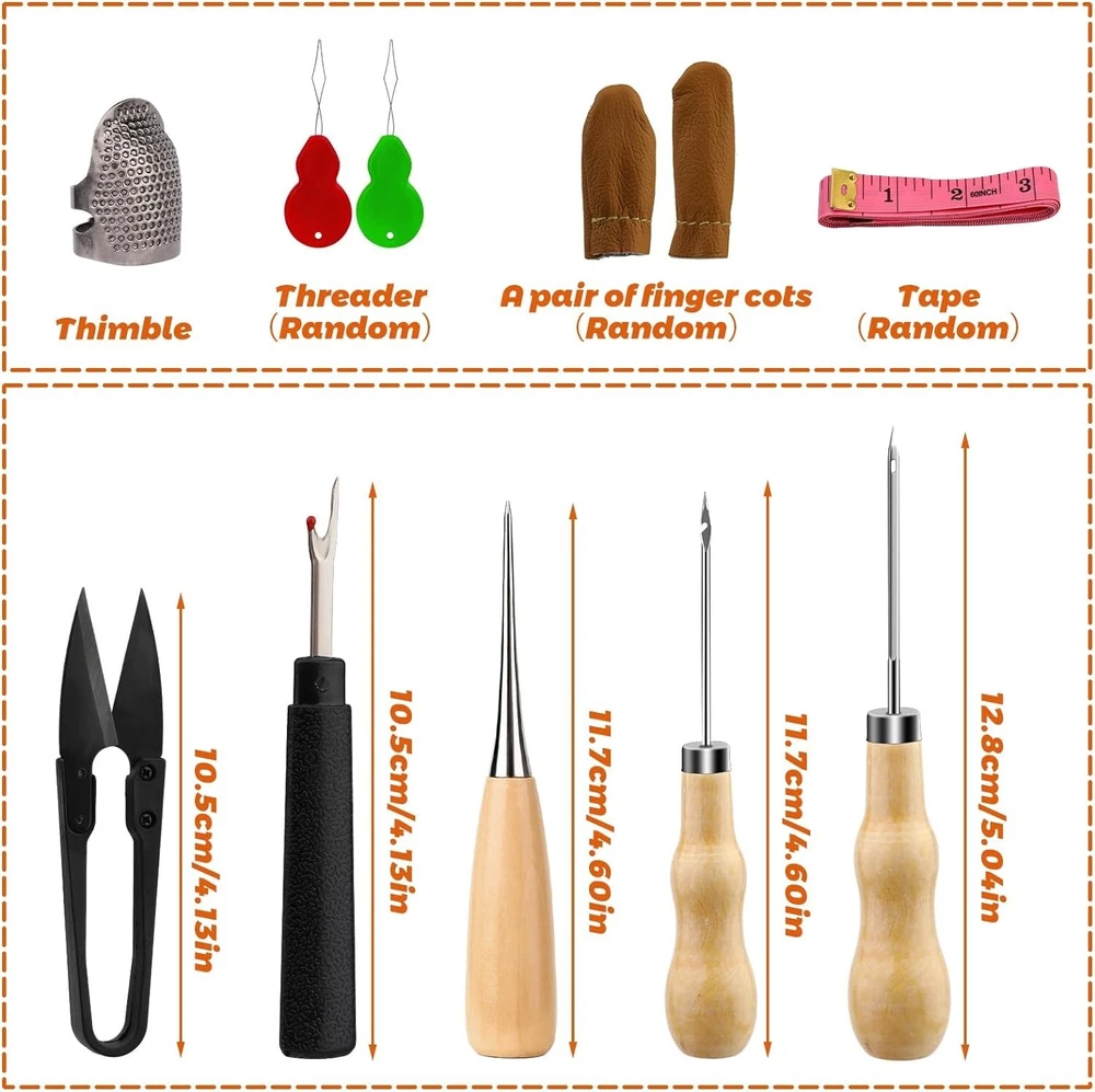 54 Pcs Leather Sewing Kit Heavy Duty Sewing Upholstery Repair Kit for Car Boots Product Description: Material upholstery repair kit Brand Branded Included Components needle threaders, thimble, seam rippers, tape measure, upholstery needles for hand sewing Upholstery Repair Kit Includes: The leather stitching kit contains 34pcs upholstery needles for hand sewing, needle threaders, seam rippers, tape measure, thimble, 8 pcs commonly used upholstery thread, leather stitching awl, scissors, fingercots, sewing kit storage bag and etc. Compact leather sewing tools come in a full range of sizes to meet your basic leather sewing needs. Leather Needles for Hand Sewing-- A wonderful upholstery leather sewing kit with the necessities you'll need for starting repairs of leather. High-quality leather needles for hand stitching, curved needles, thread, scissors, a thimble, etc. If you'd rather make repair yourself to replace items with minor damage, this is the heavy-duty sewing kit for you. Plus you will get a satisfying feeling of satisfaction when it's done! Heavy Duty Leather Sewing Kit- -Great leather sewing repair kit for DIY leather sewing projects. This is a great leather needle and thread kit for beginners or those with basic needs. It has a curved needle which is very helpful as well as metal thimbles which are essential when working with leather. If you use the sewing repair kit through super thick denim and fleece fabric and it will work great too! Upholstery Needle and Thread-- Used for repairing leather truck seats, the leather sofa, couches, canvas, shoes, leather gloves, and stitching up a backpack shoulder strap that was coming undone, worked perfectly to add more life to a very good gloves backpack! Leather Stitching Kit-- This little heavy-duty leather sewing kit is great and will meet your needs nicely. if you repair the leather recliner arm where the seam had come apart, many colors of thread in the kit are a perfect match. Suitable for car leather seat repair, leather sheaths and holsters, leather purses,s and leather handles of bags.Can also be used for leather jewelry making.