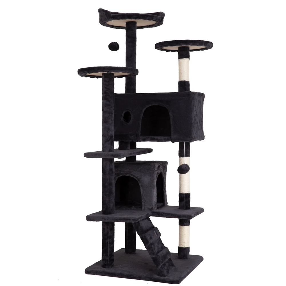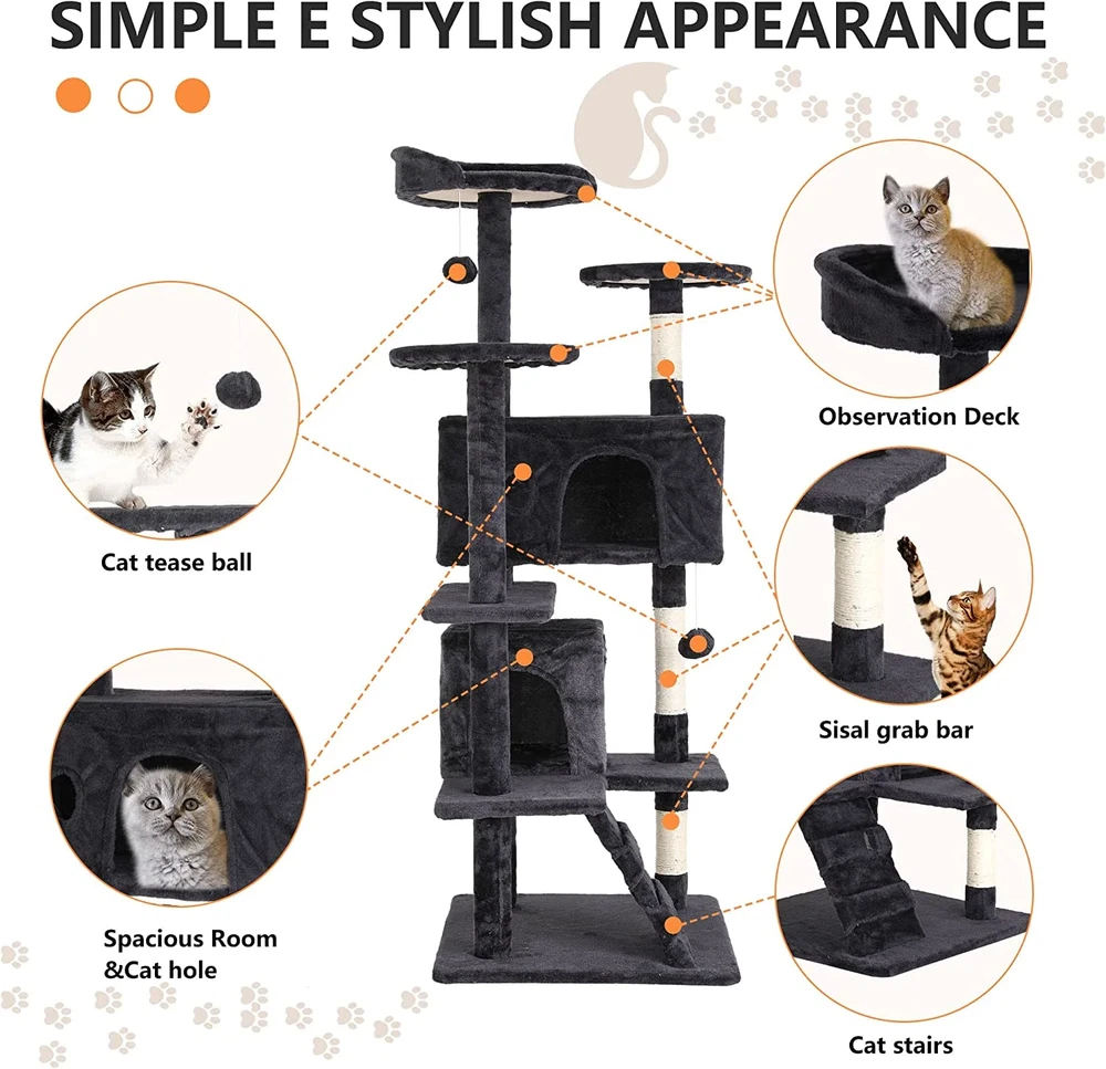 Why Choose Our Cat Tree? Does your cat scratch around and damage your furniture? Are you still upset about this? Are you looking for a comfortable space where your kids can relax and play? Our cat tree is your best choice! Your cat needs its own space to rest and play. They can nap or play at will. This cat tree makes your cat more active. Our cat house has three top floors and Two comfortable condo. Whether your kitten wants to stretch out on a spacious perch, curl up in a plush room, or release the urge to scratch on a sisal pole, this multifunctional cat tree tower can make your fur baby's day full of fun and excitement! The multi-level cat condo is a perfect hideaway for your sensitive baby to enjoy privacy.The cat tree covered by plushy faux-fur,lines both inter iro and exterior of the tower, providing the feline-friendly warmth and softness. Our cat tree also comes with two interactive toys. These interactive cat toys can improve your cat's playfulness and make it happy. The activity cat tower has a wall anchor belt to provide good dual security protection. You don't have to worry that the cat tree will overturn or shake accidentally. Children can move freely on the cat tower. It's a good choice for your kitten to spend a happy afternoon in our cat tree.Just let's enjoy it at once! Cat tree cat tower cat condo cat playground cat activity center cat house kitten tree cat tree cat tower cat condo cat playground cat activity center cat house kitten tree cat tree cat tower cat condo cat playground cat activity center cat house kitten tree cat tower cat condo cat playground cat activity center cat house kitten tree cat tower cat condo cat playground cat activity center cat house kitten tree cat tower cat condo cat playground cat activity center cat house kitten tree cat tower cat condo cat playground cat activity center cat house kitten tree ?? 【Multifunctional Activity Center】The cat Tree provides 3 top perches platforms and two cozy condo. Whether your kitten wants to stretch out on a spacious perch, curl up in a plush hole room, or release the urge to scratch on a sisal pole, this multifunctional cat tree tower works perfectly as a recreation paradise,which can make your fur baby's day full of fun and excitement!two toys gives them a unique way and Fun to play! ??【 Large Space Vertical】Because of its compact footprint and ability to conserve floor space, the cat tree design offers a large amount of vertical space. Every cat can have their own zone thanks to the cat jumping platform, which is another way that modern cat trees promote indoor cat peace. Maximum Load Capacity: 44 lbs. If your cat is too big for this cat tree, please buy one for tiny and medium-sized cats! ?? 【Stable Construction】Our Cat Tower is made of high-quality particle board with skin friendly plushy faux-fur cover to keep your cat warm and comfortable. The cat activity tree has a wall anchor strap which provides a good double security protection. You don't have to worry that the cat tree will overturn or shake accidentally.Give your cat the best protection!ideal for average kittens and cats. ?? 【Posts for Scratching Covered in Sisal 】These are scratching surfaces that are integrated into the framework. Cats love to bury their claws in sisal because it's a sturdy substance with a coarse texture. Our cat tree promotes healthy scratching habits and helps discourage cats from damaging furniture by offering dedicated spaces for them to scratch. ?? 【Simple assembly】We understand that convenience is important to pet owners, which is why we made our cat tree simple to assemble in a matter of minutes. You can quickly provide your kitties a stimulating environment by following the simple setup instructions and using the available tools. Please feel free to contact us with any questions you may have about our cat tree, and we will respond to you within a day!