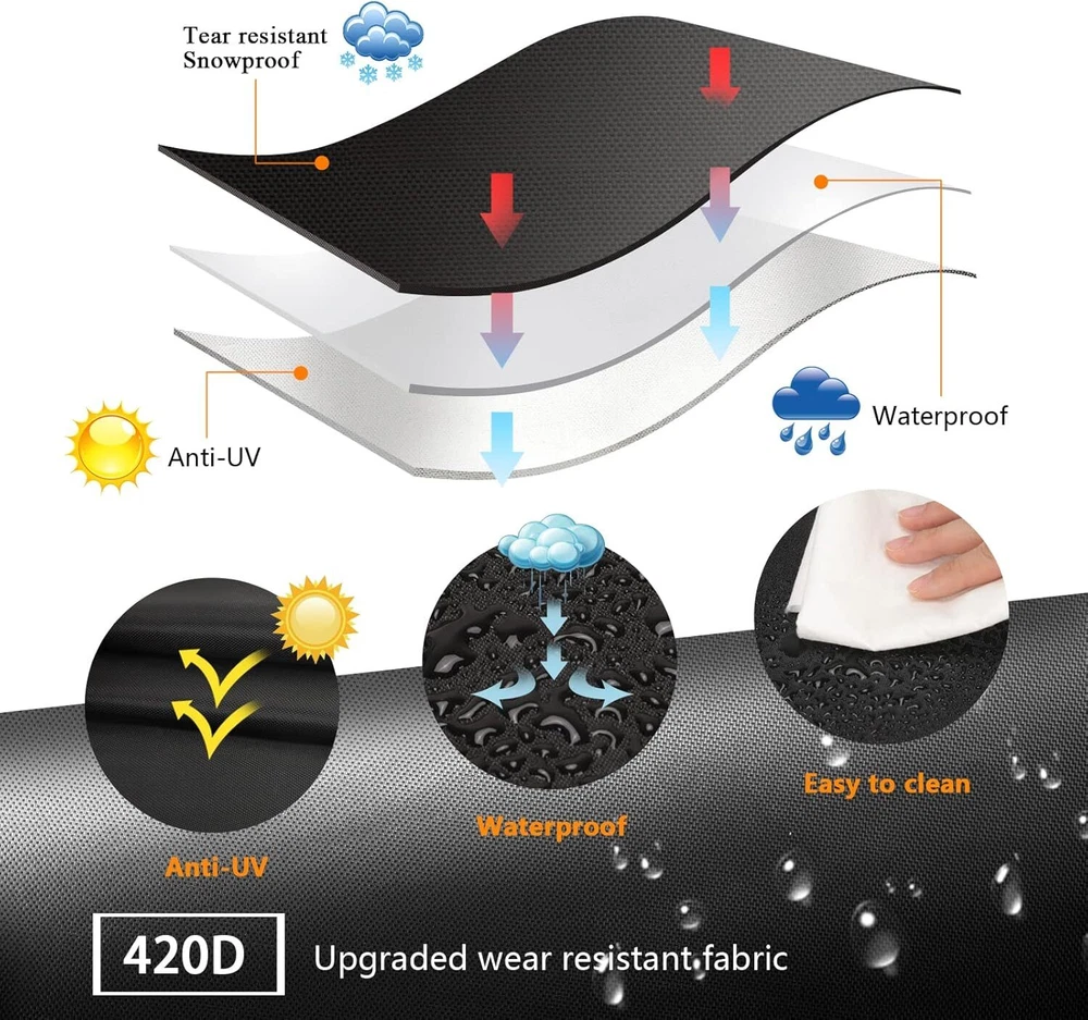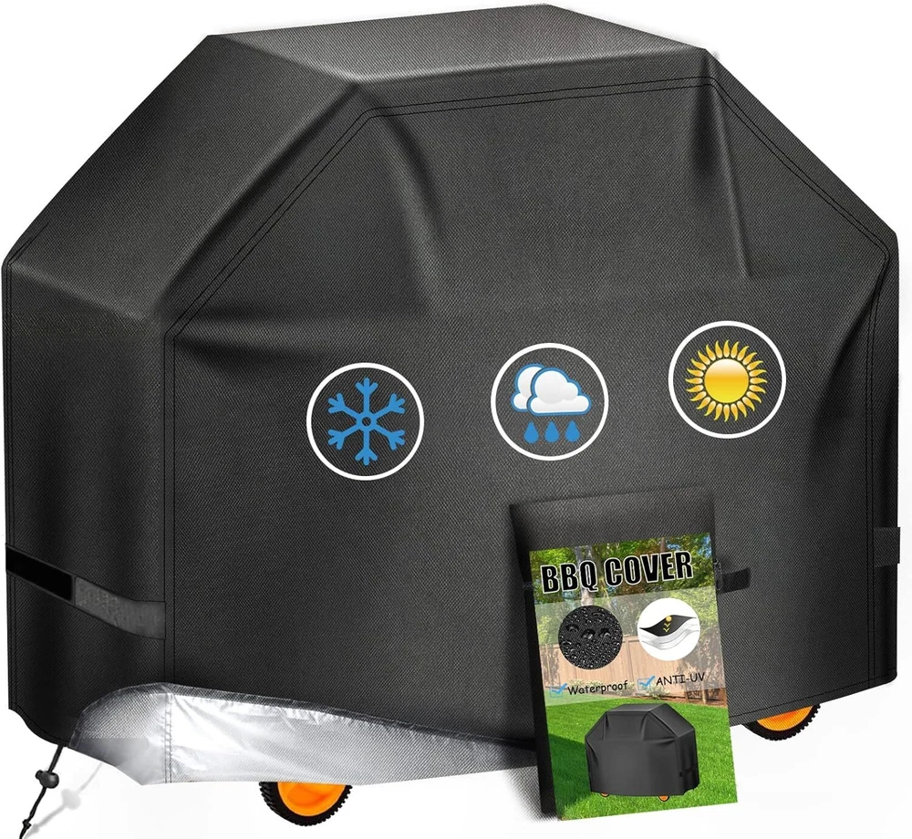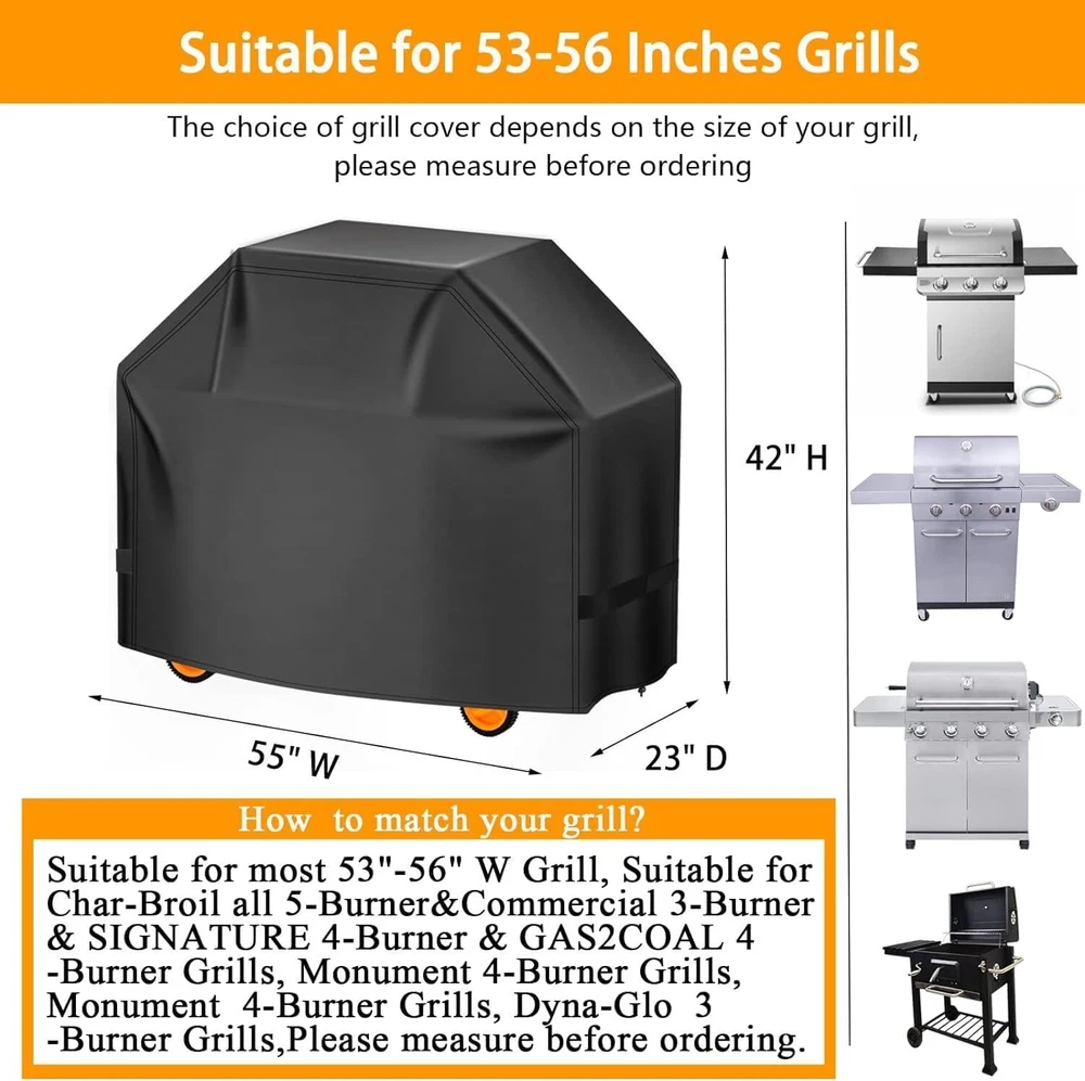 55" BBQ Grill Cover, Waterproof, UV Resistant, Fits Weber, Nexgrill & Char-Broil Grill Cover Dimensions : 55"W x 23"D x 42"H, designed for most 53"-56" W grills. Compatible Grills : Fits Char-Broil 5-Burner, Commercial 3-Burner, Signature 4-Burner, GAS2COAL 4-Burner, Monument 4-Burner, Dyna-Glo 3-Burner grills, and others. Windproof & Rain Resistant : Features adjustable hook-and-loop straps and an elastic hem drawstring for a secure fit, even in strong winds and heavy rain. Weather Protection : Waterproof, snowproof, and anti-UV, made of durable 420D Oxford fabric with silver coating to resist tears, cracking, and fading. Year-Round Protection : Shields your grill from sun, rain, snow, wind, dust, and dirt. Easy to Maintain : Wipe clean with a cloth, air dry, and avoid using a washing machine or dryer. Cover only after the grill cools down. Durable & Reliable : Provides year-round protection with high-quality material and excellent wind and rain resistance. Thank you for viewing our 55" BBQ Grill Cover, Waterproof, UV Resistant, Fits Weber, Nexgrill & Char-Broil.