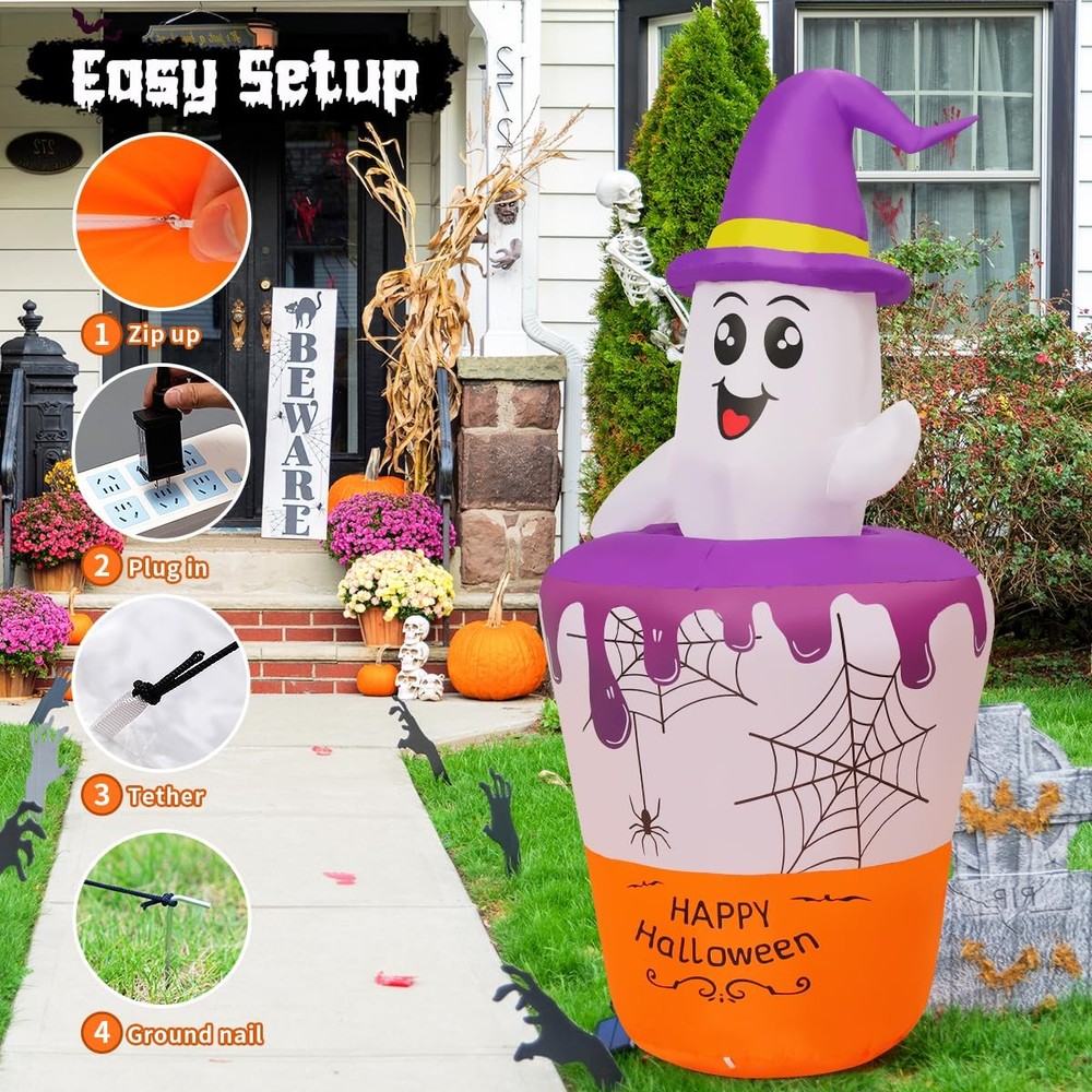 Why choose Inflatables? PREMIUM QUALITY -- CE and UL standard certified adapter. Equipped with a strong build-in-blower, just need to plug it in and it can be blown up in a short time. PERFECT INFLATABLE COSTUME-- Adorable shape, which is a perfect inflatable decoration for home and outdoor. Enjoy time with your family and friends has been committed to producing better inflatable products for decades. We strive for your shopping experience Ghost Inflatable Decoration: Cute ghosts look very funny bathing in the witch's magic potion; Our ghost has built-in LED lights, it not only decorates your patio, but also brings laughter and surprise to every guest Excellent Craftsmanship: The Halloween blow up decorations are made of high-strength waterproof polyester which is against rips and tears, the excellent stitching improves the duration of the Halloween decorations; This ensures the holiday yard decorations can operate normally in rain and wind Easy Inflation and Deflation: The ghost with broom inflatable Halloween with an Waterproof Powerful Blower; Just zip it up and plug it in, and it will fully inflate in one minute; Unplug it and open the bottom zipper, the blow-up can automatically deflate Stable and Safty: Besides the blower and storage bag, our blow-up comes with rope and ground stakes to keep the inflatable firmly on the ground; The CE and UL adapter with a 10 FT power cord means you can safely place it anywhere in your home, yard, or garden Customer Service: is a professional inflatable decoration company in the united states; If you have any questions, we are here for you