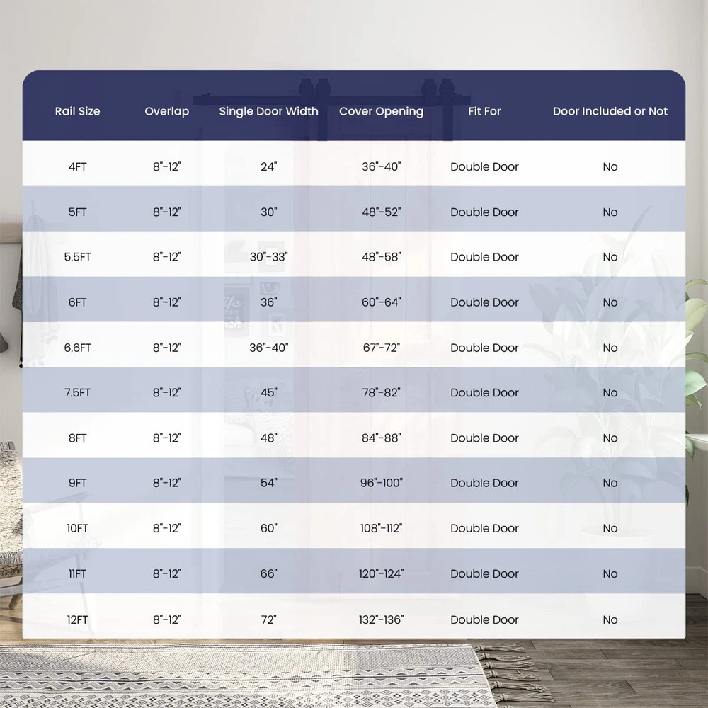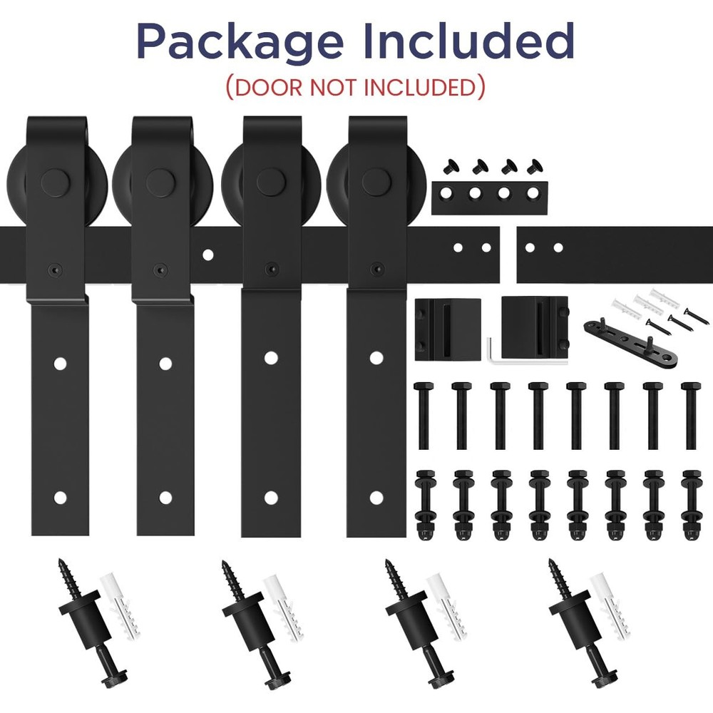 【WHY CHOOSE US】Our rail is made by 1/4" heavy duty carbon steel, solid inside, frosted black surface. The rail comes in two pieces, instead of mutiple small pieces, the door can roll quietly and smoothly. 【OVERLAP SPACE】There would be a 8"-12" overlap space since the 2 doors are hanging on one single rail. The door panel width should be wider than half of the (opening+overlap sapce) or the opening may not be fully covered. 【EASY TO INSTALL】Professional instruction and team help you solve all installation problems in time. Save the cost of finding a Carpenter or decoration team. 【PACKAGE INCLUDED】2x Rail,1 x connector, 4 x Hanger, 4 x Wall spacers, 1xFloor Guide, 2xDoor Stoppers,2x Hex Key, and other necessary hardware is included as you see in the pictures.【DOOR NOT INCLUDED】 【DOOR WEIGHT CAPACITY】Door Weight Limited 220lbs. Fit door panel thickness: 1 3/8" to 1 3/4".