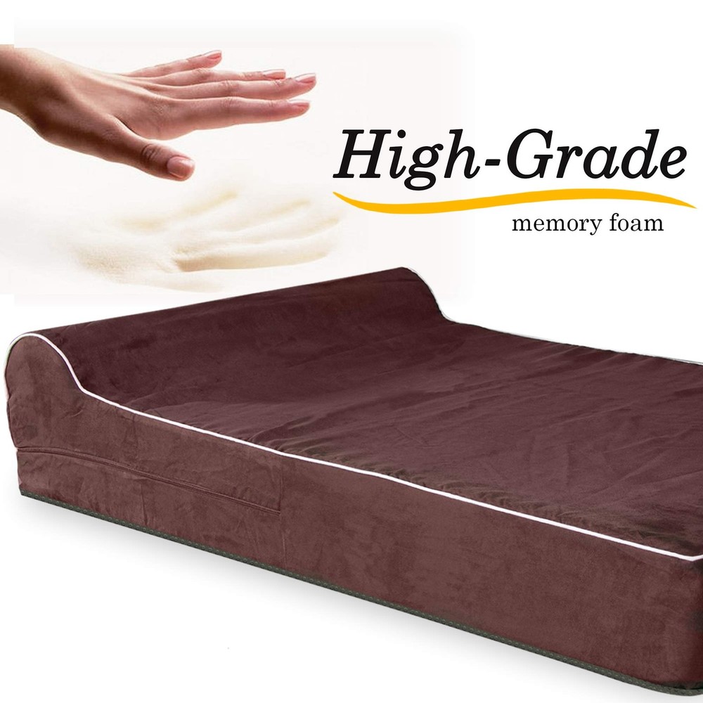 DIMENSIONS: 35-Inches x 28-Inches x 5.5-Inches thick Memory Foam and 2.5 Inch thick HeadRest. HYPO-ALLERGENIC PREMIUM MEMORY FOAM DOG COUCH BED - NOT EGG CRATE FOAM OR OTHER ORTHORPEDIC NON MEMORY FOAMS - Compare to Therapeutic Foam found in High End Mattress Stores SPECIAL LOVING: This Large Dog Bed is Great For Pets With Arthritis or Joint and Muscle Issues DOUBLE LAYER PROTECTION – INTERIOR COVER: WATERPROOF Fabric Zippered Cover / EXTERIOR COVER: Soft, Plush Suede with an Ant-Slip Bottom Zippered Cover, great washable dog bed YOUR SPOILED ONE SPENDS MORE THAN HALF ITS LIFE SLEEPING. A MEMORY FOAM BED WILL IMMEDIATELY BECOME THEIR FAVORITE SPOT AND PUPPY BED