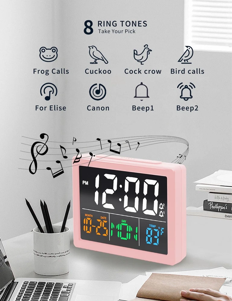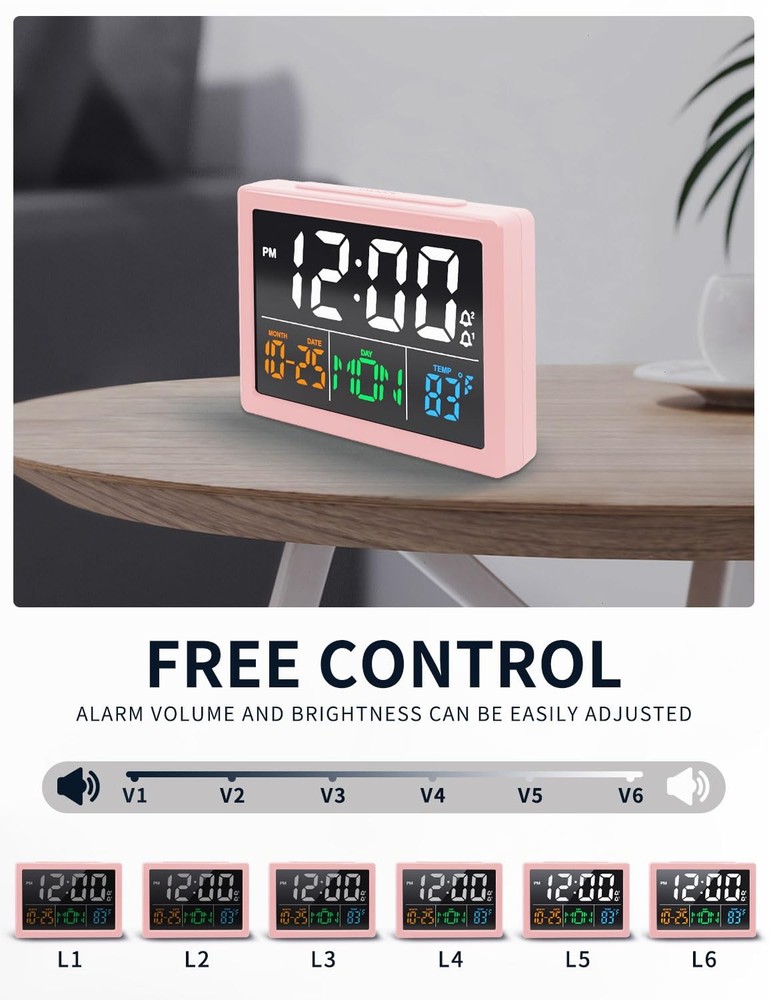 Digital clock 【Upgraded Big Screen Display】- Experience the luxury of a 5.5" High Resolution Digital Alarm Clock that spells out the time, date, and temperature clearly. The illuminated LED digits ensure visibility even from a distance, allowing you to effortlessly check the time without straining your eyes. 【Adjustable Alarm Brightness】- With our revolutionary 6 Brightness Levels ranging from 5% to 100%, you have complete control over the alarm clock's brightness. No need to worry about the brightness being too intense to disrupt your sleep or too dim to read the time. Find the perfect balance that suits your preferences. 【Adjustable Alarm Volume】- Say goodbye to jarring wake-ups! Our alarm clock offers 8 adjustable sounds that can be set between 30-85 DP, allowing you to wake up to your preferred level of audio stimulation. And with the easy snooze function, simply press the top button for an extra 9 minutes of snooze. 【Easy Operate】- Designed for simplicity, our alarm clock features a big and clear display, 12-hour / 24-hour format, and provides indoor temperature information. It's perfect for kids, seniors, and the elderly, guaranteeing a stress-free experience when setting the time and alarm. 【USB Charging Port and Battery Backup】- Conveniently charge your smartphones, tablets, or other 5V electronic devices with the built-in USB charging port. The clock also features a backup button battery, ensuring that it keeps the time even during power outages. Please note that the clock must be powered using the power cable.