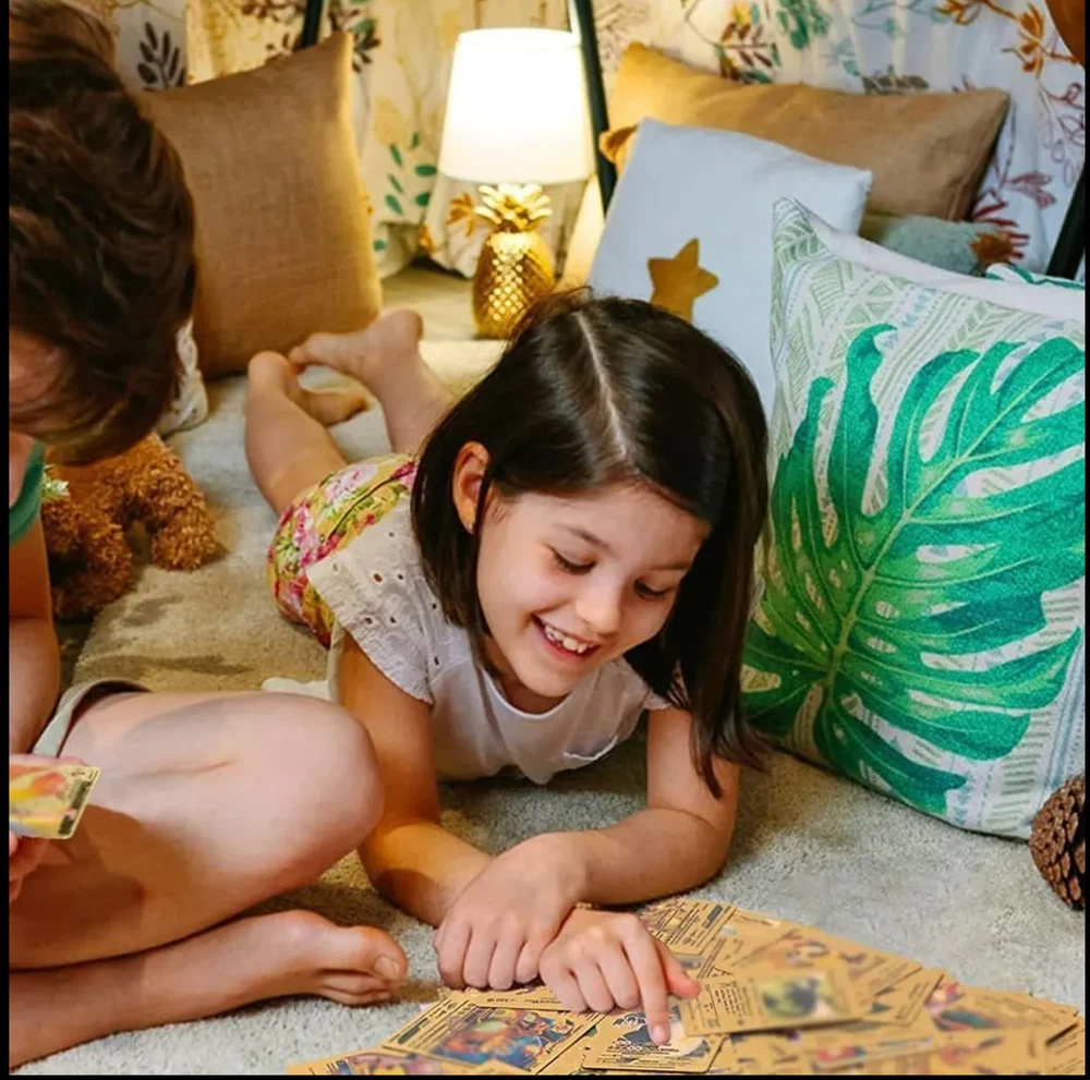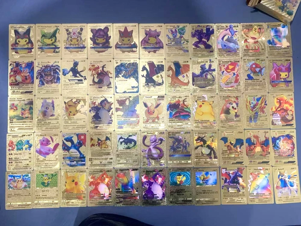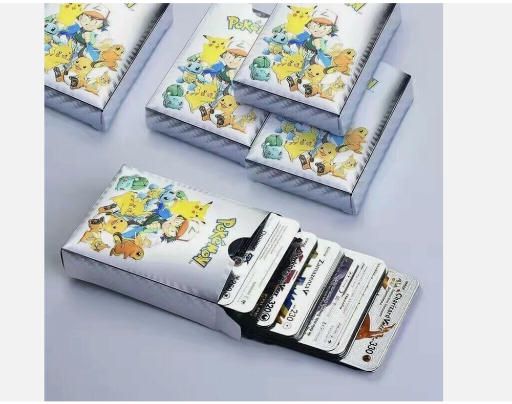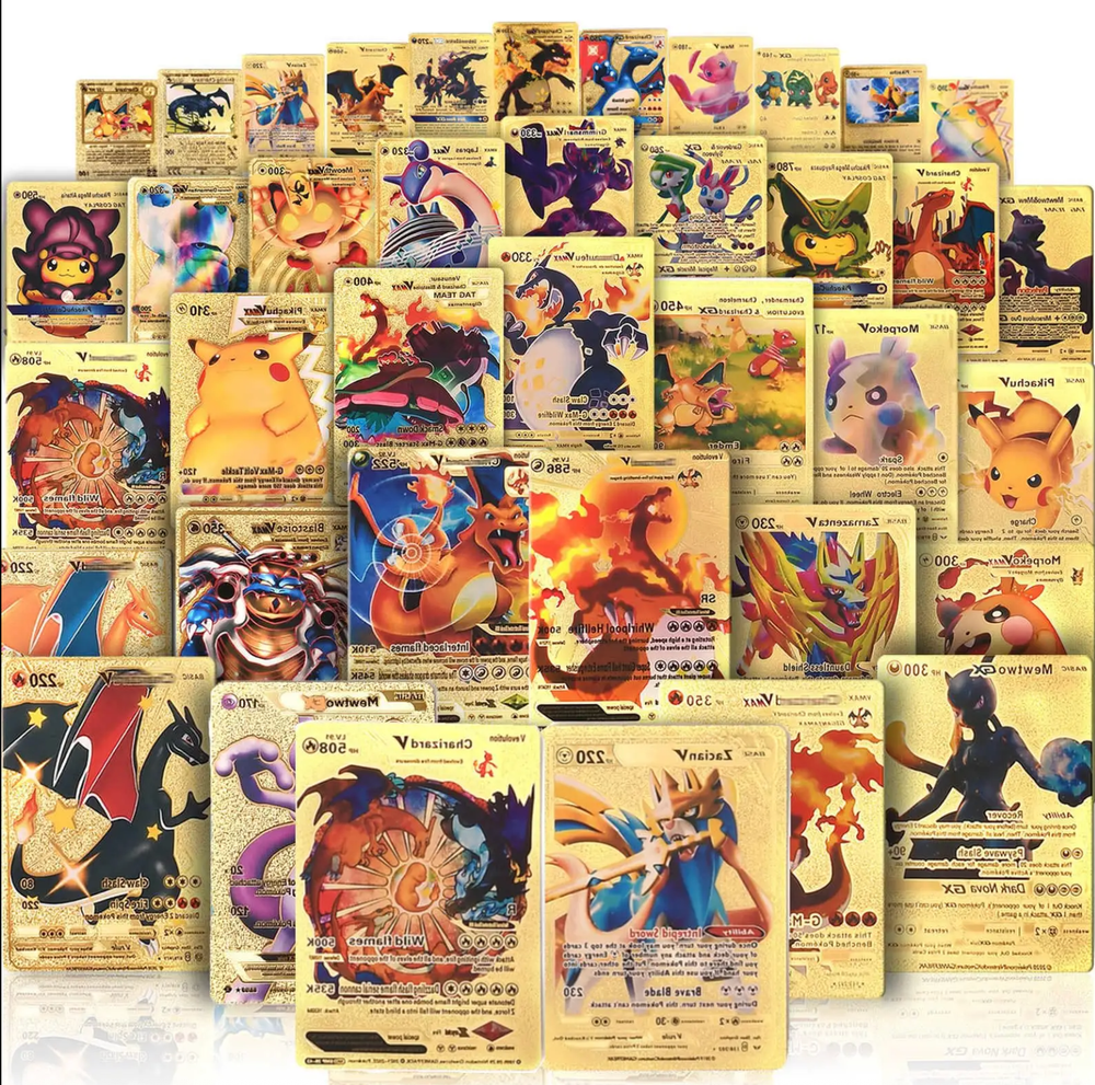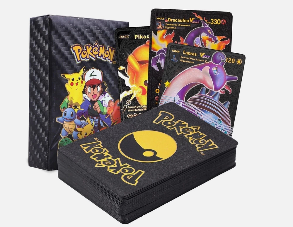 55 PCS Premium Gold Foil TCG Cards Set – VMAX, V, EX, GX Rare Trading Cards in Collector’s Deck Box – Uniquely Assorted Cards – Ideal for Kids, Fans & Collectors (Gold, Silver, Black Editions) Unleash your competitive edge or grow your trading card collection with this exclusive 55-card set crafted for collectors, casual players, and TCG enthusiasts. Each pack includes a powerful and visually stunning mix of VMAX, V Series, GX, EX, DX, and common cards—carefully selected to ensure every card is unique and no duplicates are included. Available in bold gold , sleek silver , and mysterious black-themed editions , this collection offers a perfect blend of strategy, creativity, and visual impact. Whether you're building a new deck or expanding your collection, this card set is a valuable and exciting addition to your trading card universe. ⚡ Complete 55-Card Assortment: Includes a wide range of VMAX, V Series, GX, EX, DX, and common cards with no repeated designs for a varied and exciting experience. 🎨 Three Unique Color Editions: Available in gold, silver, and black color themes, offering a premium aesthetic for display or gameplay. 🧠 Strategic & Imaginative Gameplay: Cards feature diverse characters and combat styles designed to spark creativity and enhance battle tactics. 🌟 Highly Collectible: An ideal mix of rare and standard cards makes this a standout addition to any card collection. 🎁 Gift-Ready Presentation: Comes in a beautifully designed collector’s deck box, making it a perfect gift for kids, fans, and trading card collectors alike. “All of our cards are brand new and carefully packaged, so you can buy with confidence. Though unofficial, they are highly collectible and designed to be both durable and fun—perfect for kids to play with and enjoy. Each pack comes randomized, adding an exciting surprise with every purchase!”