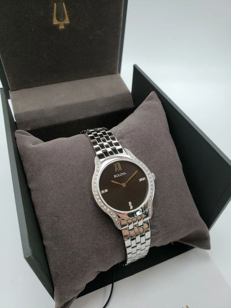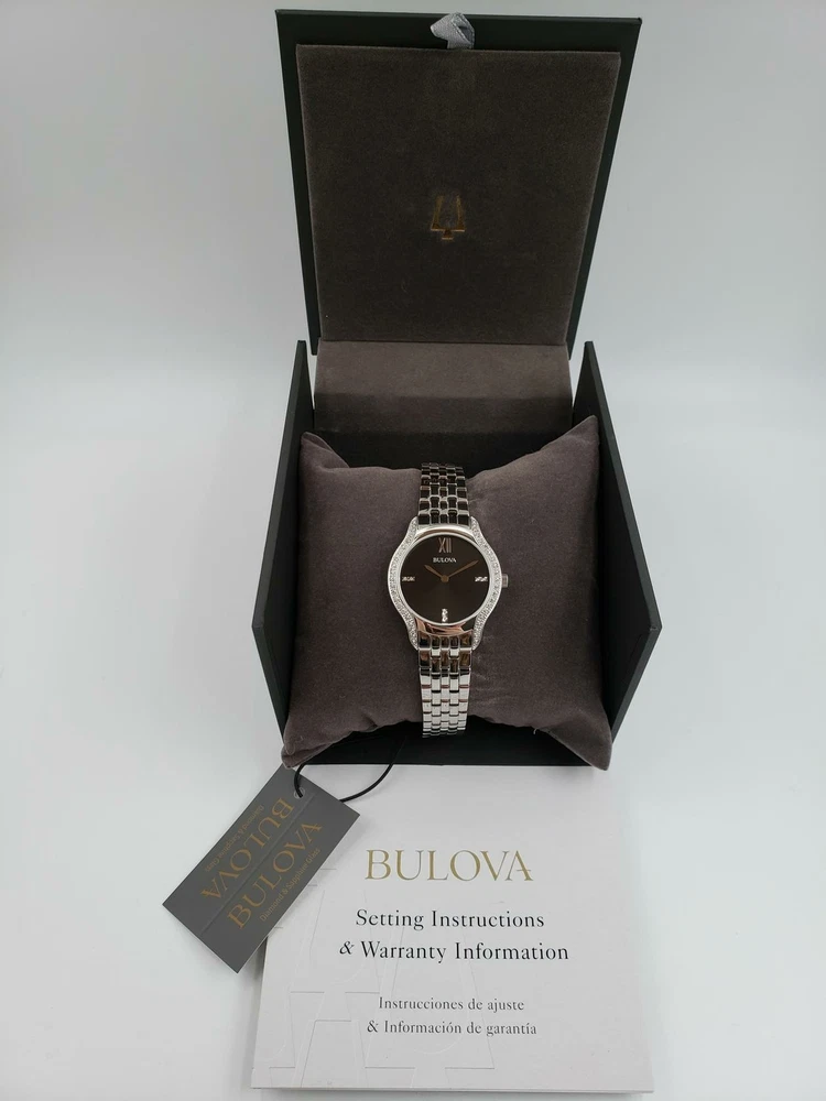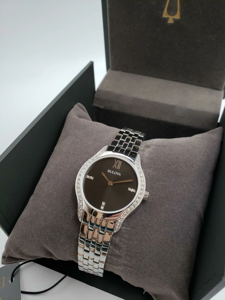 $550 MSRP | Bulova Women’s Diamond Bezel Silver Tone Ladies Watch - 96R249 NEW The Bulova Women’s Diamond Bezel Silver Tone Watch (model 96R249) exemplifies over 143 years of Bulova’s watchmaking legacy, blending timeless craftsmanship with modern innovation. Known for its commitment to precision and design, Bulova continues to set the standard in the watch industry. This elegant timepiece combines tradition with cutting-edge technology, offering a stylish accessory for the modern woman. Featuring a 30mm stainless steel case, this watch showcases a sleek black dial that creates a striking contrast with the silver-tone bezel and band. Adorning the dial are genuine diamond accents around its perimeter, adding a touch of luxury and sophistication to the design. The overall aesthetic exudes elegance, making it a versatile piece that can be worn for both casual and formal occasions. Powered by precise quartz movement, the Bulova 96R249 ensures accurate timekeeping and boasts water resistance up to 30 meters, making it suitable for everyday wear and resistant to splashes. The stainless steel bracelet is both durable and classic, secured with a reliable clasp for a secure fit. This timepiece is more than just a watch—it’s a statement of enduring style and innovation, ideal for the discerning woman who values both function and fashion in her accessories. Features Brand: Bulova Model: 96R249 Bezel Color: Silver Dial Color: Black Band Color: Silver Case Size: 30mm Case Material: Stainless Steel Band Material: Stainless Steel Movement: Quartz Water Resistance: 30m Fast and Free Shipping You're already purchasing the item. Why pay additional for shipping, especially slow shipping? We get your order shipped out within 1-business day and delivered to your doorstep as quickly as possible. Competitive Pricing With our dynamic pricing model, our prices are always competitive. Our prices are some of the lowest that you will find on the internet. Rest assured that you're getting a good deal when purchasing with us. 30-day Money Back Guarantee We are committed to making sure that you leave this transaction satisfied. If you're unhappy with the product for any reason, you may return it back for your money-back or a replacement within 30 days. No questions asked!
