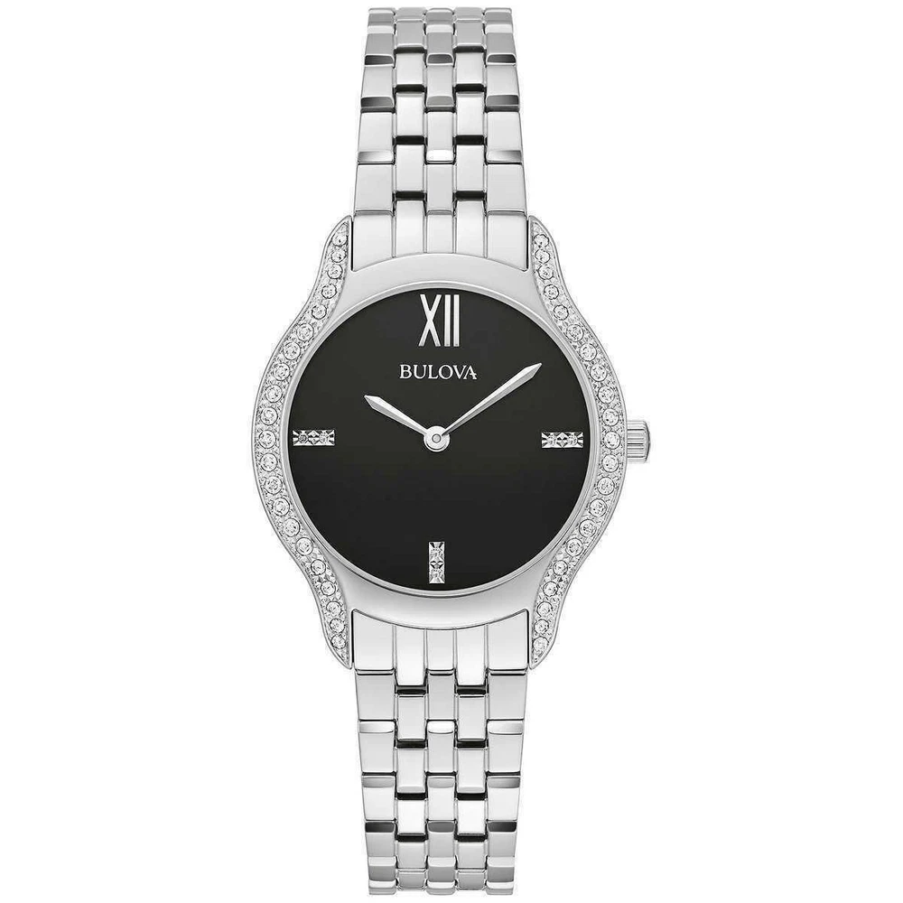 Style: Casual, Classic, Dress/Formal, Luxury Brand: Bulova Country/Region of Manufacture: Japan Reference Number: 96R249 With Manual/Booklet: Yes Movement: Quartz Watch Shape: Round Bezel Color: Silver Customized: No Dial Color: Black Features: 12-Hour Dial, Diamond Accent, Scratch-Resistant, Splash Proof, Water-Resistant Case Material: Stainless Steel Department: Women Model: Bulova 96R249 With Original Box/Packaging: Yes Band Material: Stainless Steel Case Size: 30mm Type: Wristwatch Band/Strap: Bracelet With Papers: Yes Display: Analog Water Resistance: 30 m (3 ATM) Case Color: Silver Band Color: Silver