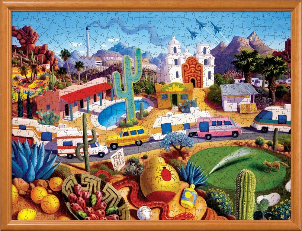 These 24" x 18" 550PC Roadsides puzzles are created by the talented Steven Morath. Tucson Arizona shimmers in the desert sun. Whether capturing a bountiful table of delights on a Mexican beach or a parade of trailers through the desert countryside, his paintings express the artist's obvious amusement and fascination with the Southwest. To reduce their impact on our environment, the chipboard used in these puzzles is made of recycled material. For 25 years, has enjoyed making quality jigsaw puzzles, games, toys & Works of Ahhh craft kits. Innovation and premium quality is the hallmark. We pledge to always provide earth friendly products. Our puzzles are made from recycled paper and soy based inks. Green is not just a color, it’s a commitment. Matte Finish – Our matte finish helps reduce glare for an improved puzzling experience. Random Cut - All puzzles have varying shapes to create a variety with tight and thick interlocking pieces. Ensuring a variety of challenges with every puzzle! The perfect way to keep game night fun. Environmentally Friendly - Our puzzles are made from 100% recycled material and non-, soy-based inks for eco-friendly fun! Bonus Poster - This puzzle comes with a poster for a large and detailed view to help guide puzzlers through solving this puzzle. We create puzzles using a thick puzzle board in a wide variety of piece counts for both children and adults to enjoy! Quality - is an American Puzzle & Game Company. We support you with our missing piece 100% . If you have any questions, you can us directly for additional support.