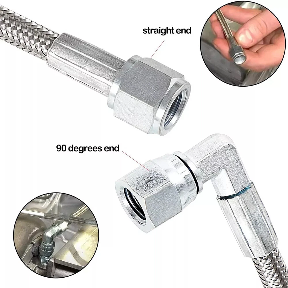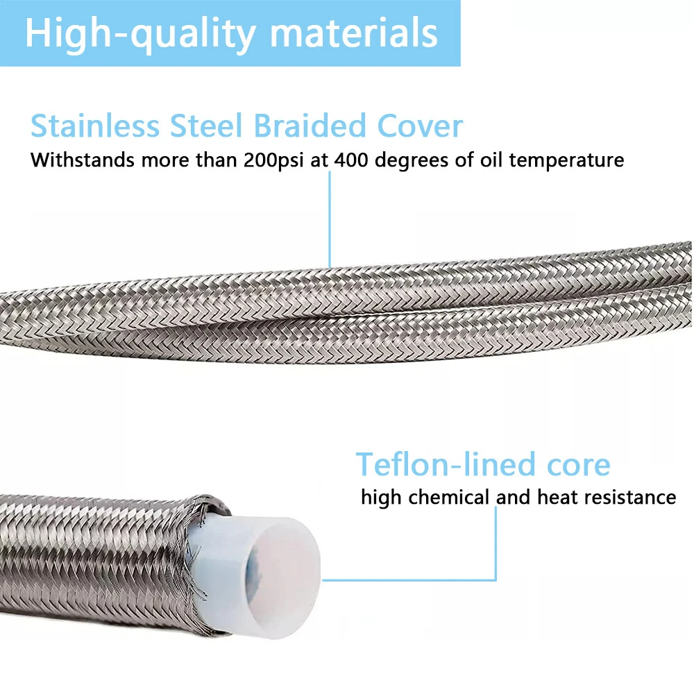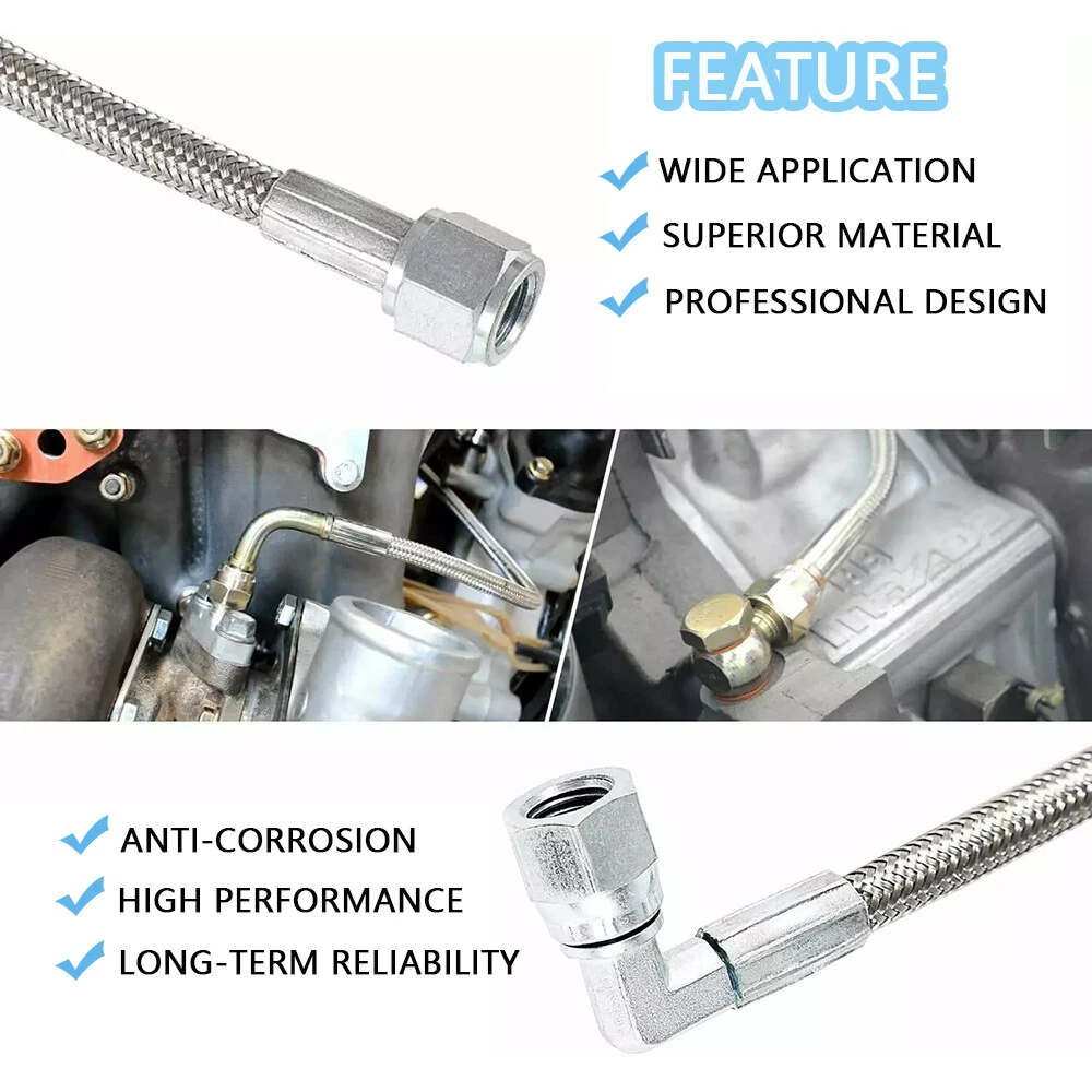 Function This steel braided turbo oil feed line connects your turbo chargers oil gallery to the engine, it drains the oil away from the bearings inside the turbo charger. Features This line is 60 inches length, and the hose end is 4AN(0.4375” OD., comes with 1 Straight End and 1 90 Degree End. Material We choose best quality materials to ensure top quality, Teflon lined core with heavy-duty stainless steel braided jacket wrapped on line, top quality stainless steel made hose ends. Performance The premium materials ensure the oil feed line could withstand more than 200psi at 400 degree Oil Temperature. Function: Premium grade hose offers a seamless transfer of lubricant to and from the engine's turbocharger; Prevents blown oil seal effectively caused by excessive oil pressure. Manufactured to OEM specification, meet or even exceed OEM standard in function, performance and quality. This 4AN hose transport oil to the turbocharger as the oil simultaneously cools and lubricates the moving parts, preventing the turbo's internals from overheating and subsequently failing and effectively preventing blown oil seal caused by excessive oil pressure. Fitment: 4AN hose ends are with 1 straight end and 1 90 degrees end with swivel fittings for an easy install. This 4AN 90 degree straight hose withstands more than 200psi at 400 degrees of oil temperature. Braided Stainless Steel Lines are specially designed to work in any automotive project Features: 1. This steel braided turbo oil feed line connects your turbo chargers oil gallery to the engine, it drains the oil away from the bearings inside the turbo charger 2. This line is 60 inches length, and the hose end is 4AN(0.4375” OD., comes with 1 Straight End and 1 90 Degree End 3. The premium materials ensure the oil feed line could withstand more than 200psi at 400 degree Oil Temperature 4. We choose best quality materials to ensure top quality, Teflon lined core with heavy-duty stainless steel braided jacket wrapped on line, top quality stainless steel made hose ends Package included: 4AN hose ends are with 1 straight end and 1 90 degrees end with swivel fittings