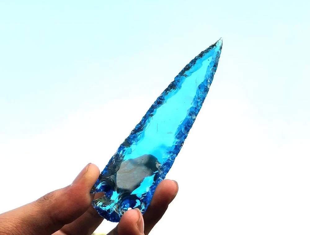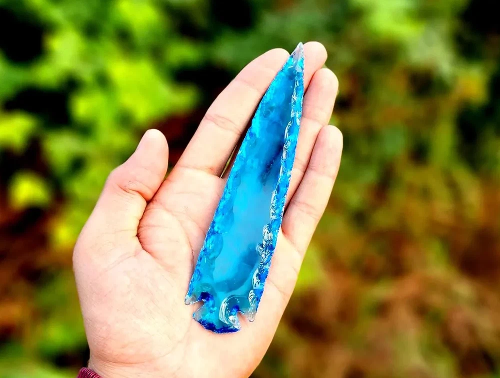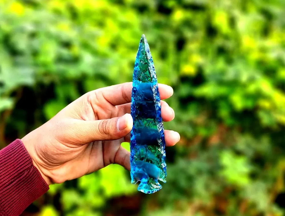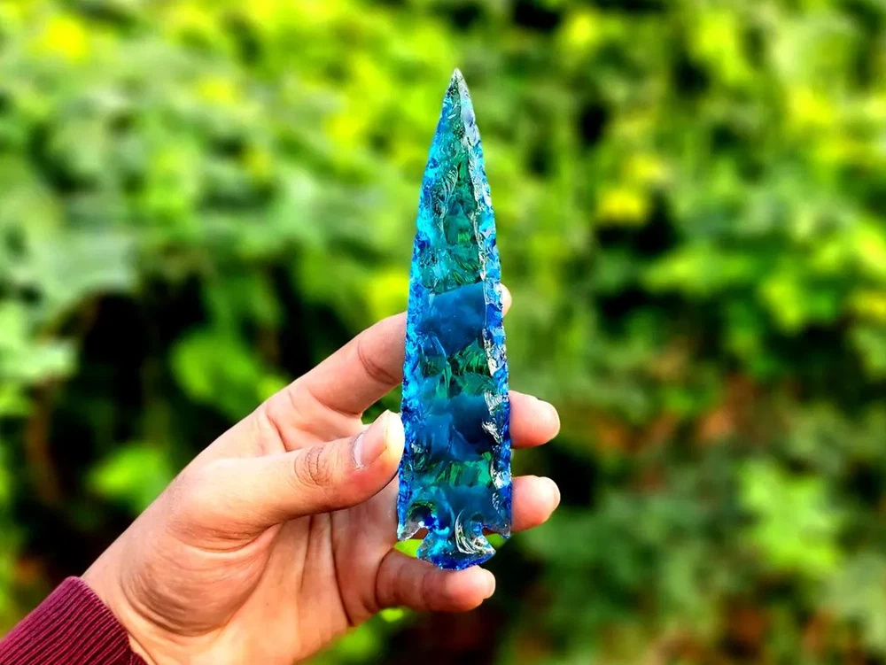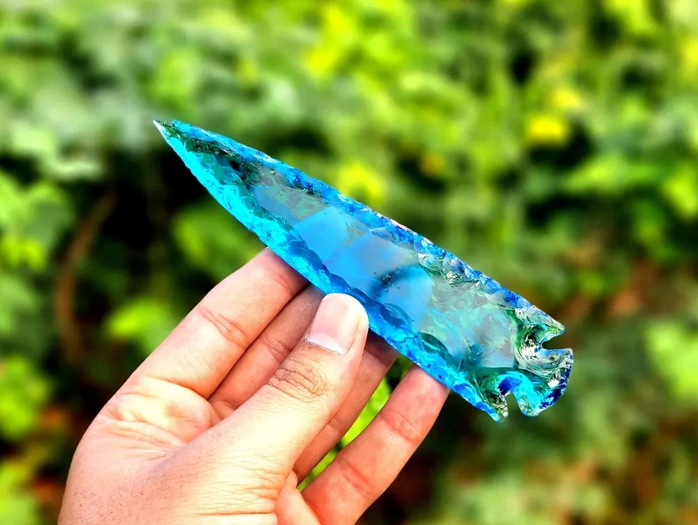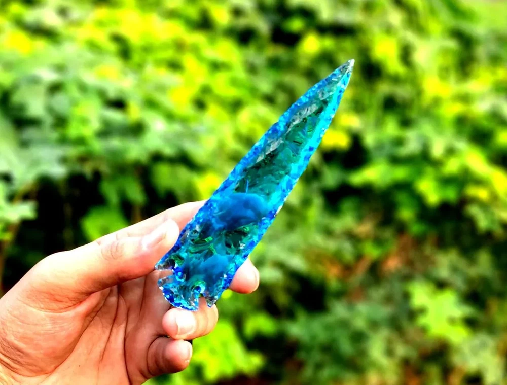 Description: Rare Blue Aqua Obsidian Arrowhead – A Stunning Handmade Crystal Masterpiece Discover the beauty and rarity of this 5.5-6" Blue Aqua Obsidian Crystal Arrowhead. Skillfully hand-carved, this gemstone combines elegance and craftsmanship, making it a perfect choice for crystal enthusiasts, artisans, and collectors. Its shimmering aqua hues and sleek arrowhead design make it ideal for display, energy healing, or as a unique and thoughtful gift. Product Features: Premium Blue Aqua Obsidian: A rare and mesmerizing gemstone with calming energy and captivating color. Handmade Arrowhead Design: Each piece is meticulously crafted for a unique and flawless finish. Versatile Usage: Suitable for jewelry making, home décor, or spiritual practices. Healing Properties: Believed to enhance clarity, emotional balance, and spiritual growth. Perfect Gift: A one-of-a-kind present for special occasions, crystal lovers, or artisan crafters. Why Choose This Blue Aqua Obsidian Arrowhead? This arrowhead showcases a rare gemstone paired with intricate craftsmanship, blending aesthetic appeal and metaphysical properties. Whether for personal use or gifting, it’s a piece that stands out in any collection. Suggested Uses: Jewelry Making: Transform it into a striking pendant or focal piece for custom accessories. Energy Healing: Use it as a tool for meditation, chakra alignment, or emotional healing. Decorative Accent: Add an ethereal touch to your home or altar space. Gift Idea: An unforgettable and meaningful gift for crystal enthusiasts or spiritual practitioners.