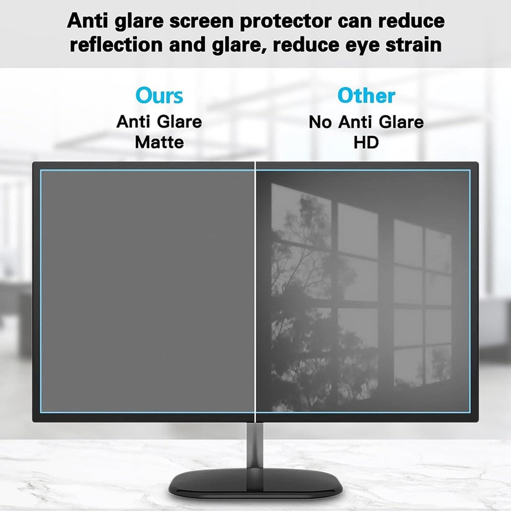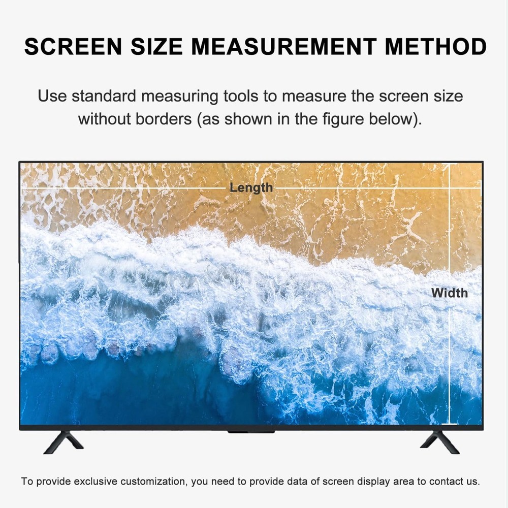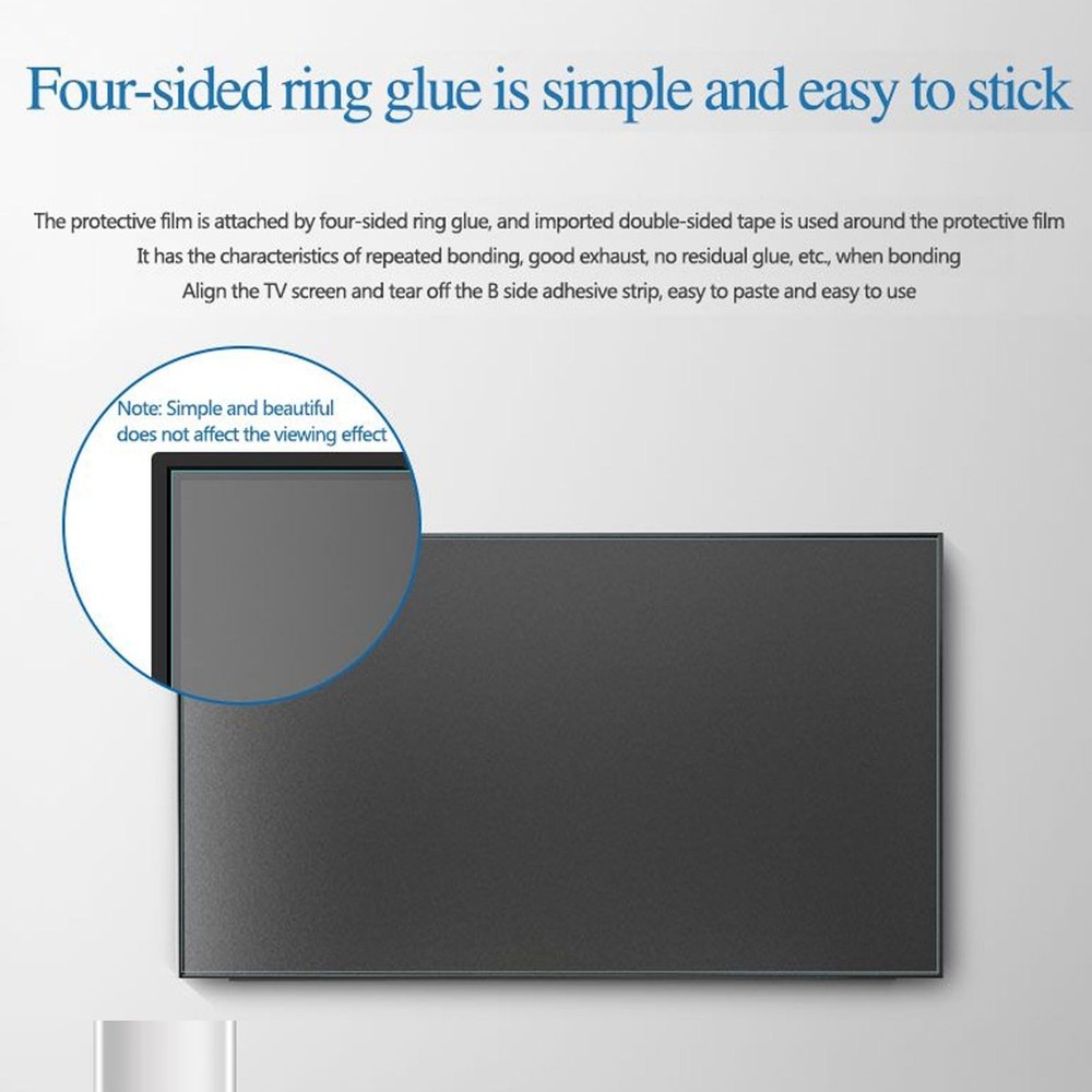 Ultra Clear Screen Protector - matte Blue light screen protector for monitor blocks 85% of the harmful wave length of blue light between 380nm~480nm and also blocks 100% of UV light. TV Matte Protective Film Material: Matte PET High Quality Materials Features: Anti-reflective / Anti-radiation / Anti-myopia, Etc Applicable products: TV monitor screen protector Size: 55-75Inch Please allow the protector size with a tiny difference Features: Ultra Clear/Filter out Blue Light/Anti-Glare/Protect eyesight. Scratch coating that protect your TV from Child and Pets. Guarantee Bubble Free Installation. Easy to apply and remove. Package includes: 1x TV Screen Protector Blue light filtering technology: TV screen protector blocks harmful blue light between 380nm-495nm and provides 100% UV protection. The blue - light blocking helps reduce eye strain, Protect your eyes. High light transmittance does not affect the picture quality: The TV screen film high-definition transparent material is used to protect the screen while not affecting the picture quality of the TV, without affecting the original appearance design of the TV, simple and beautiful. Matte anti-reflective surface: The matte material design not only reduces screen reflection and glare, but also effectively prevents fingerprint residue and scratches, keeps the screen clean and tidy, and extends the service life. Multiple sizes available: A variety of specifications and sizes are available for 55-75inches, which can be selected according to the size of the TV to ensure the best fit. Please measure the screen size before purchase to get a perfect fit. Note: For outdoor use, the TV screen protector has specific guidelines. It must be used under the eaves or in a shaded area. Indoor and outdoor use should also avoid direct sunlight on the screen, and after installation, adjusting the screen brightness to the highest.
