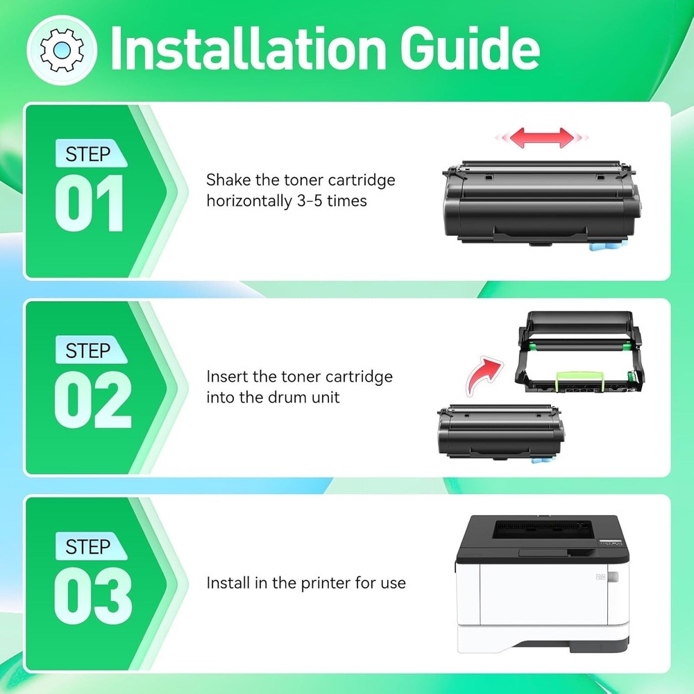 Key Features Part Number: JCTONER Compatible Replacement for Lexmark 55B1H00 Black Toner Cartridge (High Yield, 1-Pack). Yield: Massive 15,000 Page Yield (High-Yield version) at 5% coverage, perfect for high-volume offices. Color: Black (Monochrome Laser). Compatible With: Lexmark MS331dn, MS431dn, MS431dw, MX331adn, MX431adn, MX431adw, MX432adwe Series Printer. Chip Status: Latest Smart Chip Included for instant, hassle-free installation and 100% stable compatibility and accurate ink level tracking. Why Choose JCTONER? Premium Print Quality: Fine toner formula delivers sharp, clear, professional-grade, and stain-free monochrome text and graphics. Certified Reliability: Every cartridge is manufactured under strict quality control and is ISO9001 certified to ensure stable performance and a long printer lifespan. Convenient Installation: Equipped with a pre-installed, updated chip—simply install and start printing immediately, no manual adjustments needed. Cost-Effective: Our High Yield version is an affordable alternative that meets high-volume printing demands while significantly lowering your cost per page.