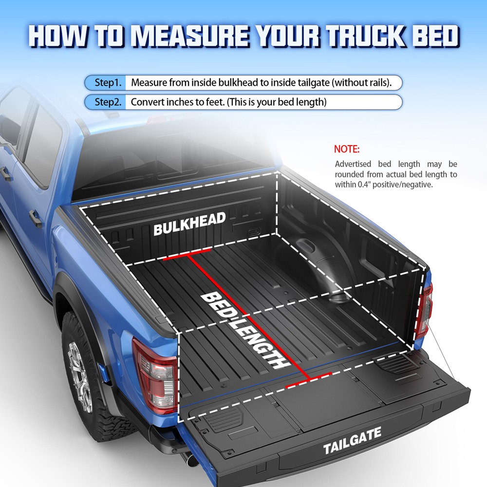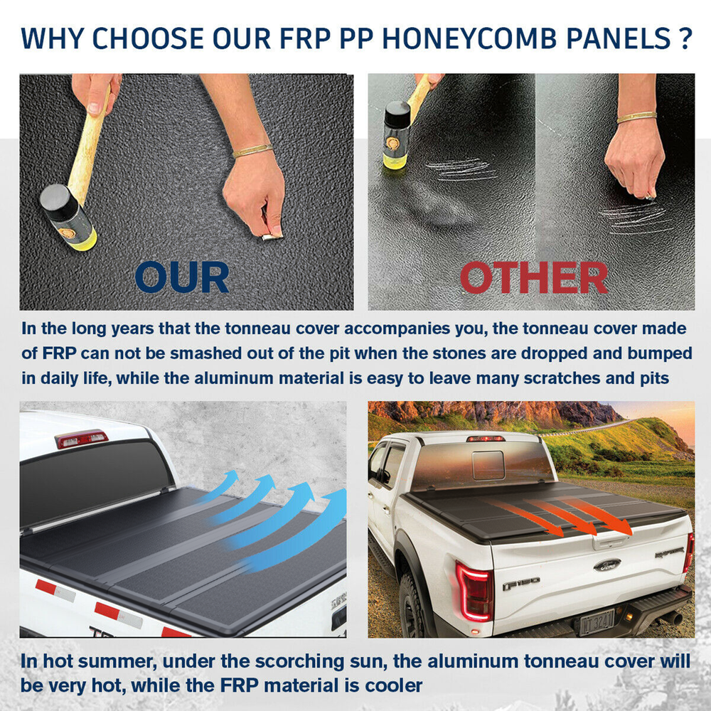 Shop Contact Feedback Store Categories Store Categories Wheel Hub Bearing Shock Struts Air Intake Manifold Auto Tools Air Intake Tube Engine Valve Cover Headlights Tail Lights Fuel Pumps Fuel Injectors Oxygen Sensor ABS Sensor Air Flow Sensor Distributor Radiator Fan Mirrors Carburetor VVT Valve Exhaust Manifold EGR Valve Water Pump Bed Tonneau Cover Sun Visor Control Arm Nox Sensor Other Installation Guide: ONE YEAR WARRANTY Please measure your truck bed length and make sure you have the correct model before ordering! Application: 2007-2024 Toyota Tundra 5.5' / 66.7" Crew Max Bed Description: Comes fully assembled with all hardware needed to install Straps secure the cover on both sides for driving with the cover open. Cover can be removed quickly and effortlessly to offer 100% access A simple latching system allows you to quickly open and close the tonneau cover Cover is secured by quick release clamps. Keeps your equipment inside your bed dry When the tailgate is closed, your belongings are safe Cover can be washed with soap and water Features: 100% Brand New Package include: 1 X 4-Fold Hard Truck Bed Tonneau Cover All hardware for installation Material is FRP+PP honeycomb Perfect Material 1. Impact Resistance : Fiberglass Reinforced Polymer ( FRP) shell achieves 20KJ/m² impact strength (equivalent to 15kg weight drop from 1.5m), surpassing aluminum. 2.Thermal/Rigidity Performance: FRP dual-layer skin stays 40% cooler than aluminum, with 35% higher rigidity for superior deformation resistance. 3.Surface Durability: Polymer-optimized surface offers 3X better scratch resistance vs. aluminum/standard fiberglass. 4.Lightweight Load-Bearing: PP honeycomb core reduces density by 60%, boosts compressive strength by 28%, enabling 350 lbs capacity (75% higher than previous 200 lbs design). 5.Ultra-Slim Profile: Sub-1-inch thickness retains 92% under-tonneau storage space, ideal for pickup truck hidden storage. Shipping Return Warranty Customer Service Shipping Handling time: 1-3 day Shipping Cost : Free to US Shipping time: Business days in USA After shipping, the tracking number available by message We ship to eBay address Return No returns are accepted without an RMA number Refund is valid within 60 days after the date delivered Refund will be given as money back or replacement The money less the freight cost will be refunded due to their own fault Item must be returned in original packing same as reached Warranty Warranty after receiving Buyers pay return and replacement shipping cost We will not refund any labor cost Customer Service Any question will be replied within 24 hours except the weekend and holiday. Please contact us by email before opening return, we will try our best to help you. On Jun 23, 2025 at 23:02:21 PDT, seller added the following information: