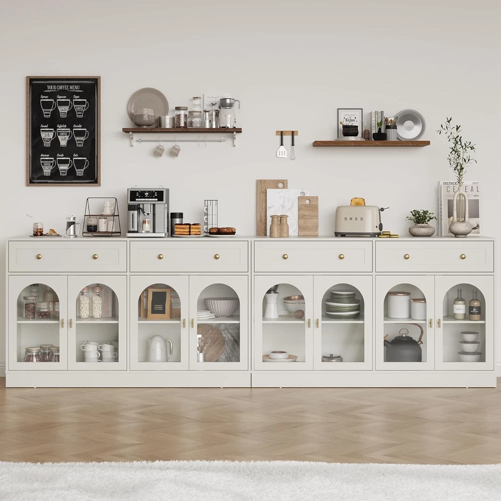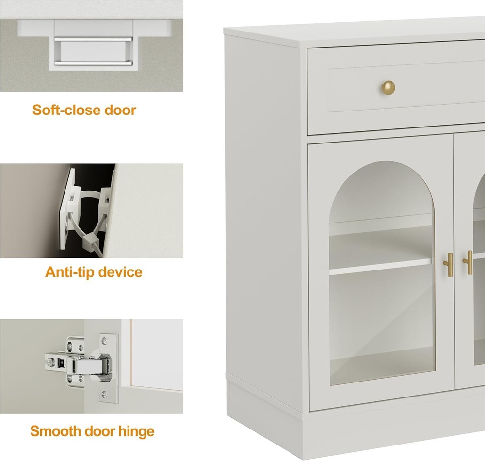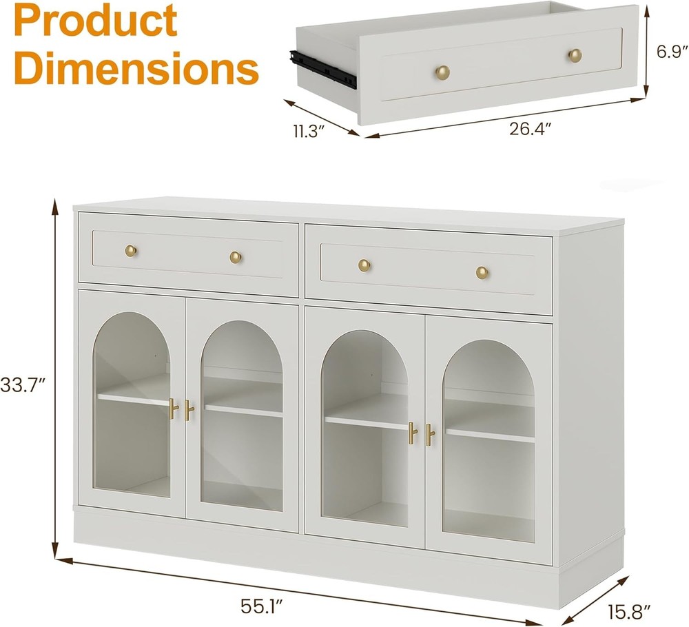 Product Description About this item Ample Storage Space: Two extra-large, spacious drawers provide easy storage for snacks and favorite items. The cabinet features three adjustable shelves to accommodate items of varying heights, while the wide tabletop offers plenty of space for small appliances like coffee machines or decorative items such as vases. Stylish Charm & Slient Design: The vintage white painted finish paired with antique golden metal handles and the unique arched transparent acrylic doors exude retro charm! The soft-close door design minimizes noise during use, making it perfect for quiet spaces and reducing impact damage. Combining practicality and style, it seamlessly enhances any home decor. High-quality Materials: Crafted from high-quality MDF, this sideboard cabinet is built to be sturdy and stable. It has passed strict TSCA and EPA standards, ensuring safety and reliability. The sustainable materials not only offer a smooth finish but are also durable, easy to clean, and maintain—designed for long-lasting use. Versatile Use: This accent cabinet boasts a unique style that fits seamlessly into any space, helping you stay organized and clutter-free. The sideboard is not only suitable as a coffee bar cabinet in your kitchen or dining room but also as a console table for your living room or home office. It's the ideal addition to enhance your home decor! Easy Assembly: Includes clear installation instructions and all necessary accessories, including anti-tip hardware for added stability. Assembling this buffet cabinet is a breeze. Enjoy professional customer service before and after your purchase—reach out anytime, and we’ll resolve any issues within 24 hours.