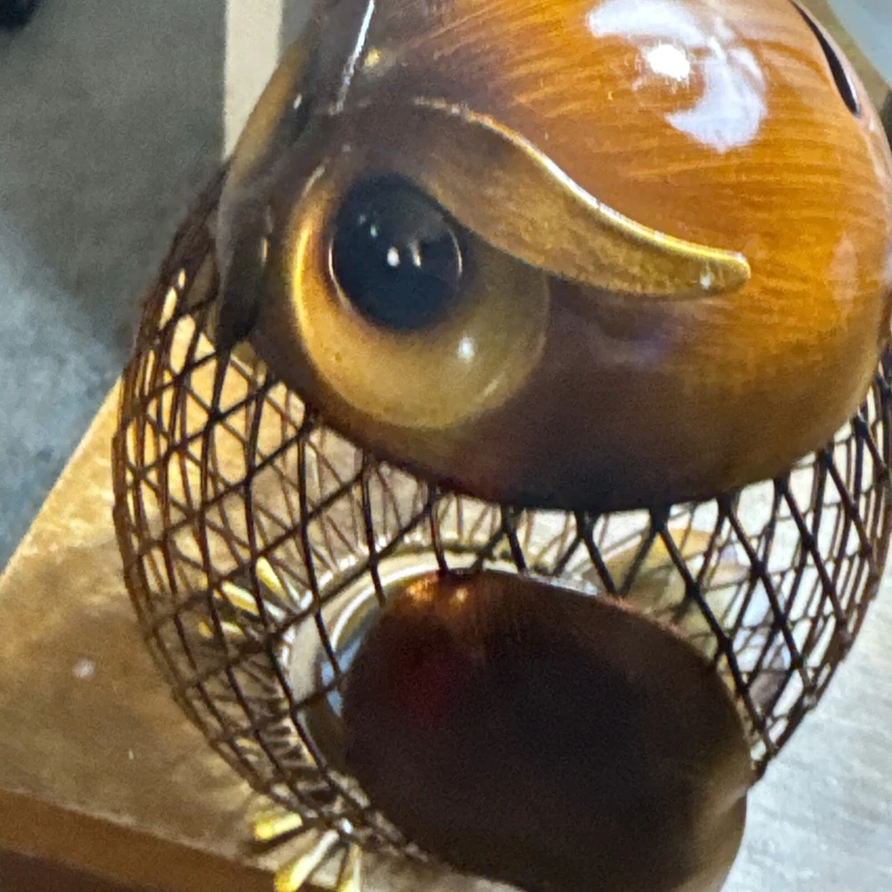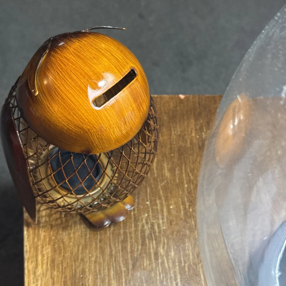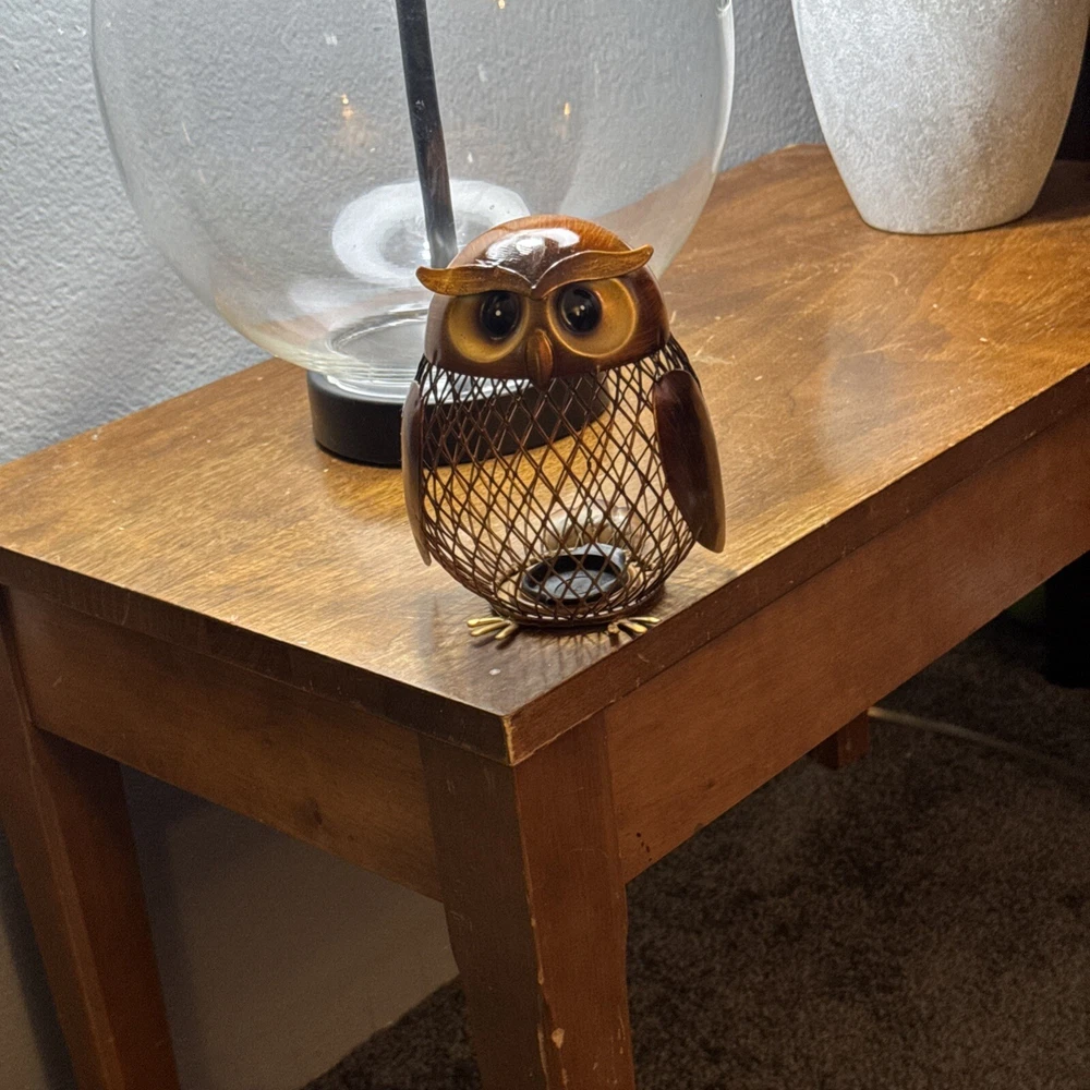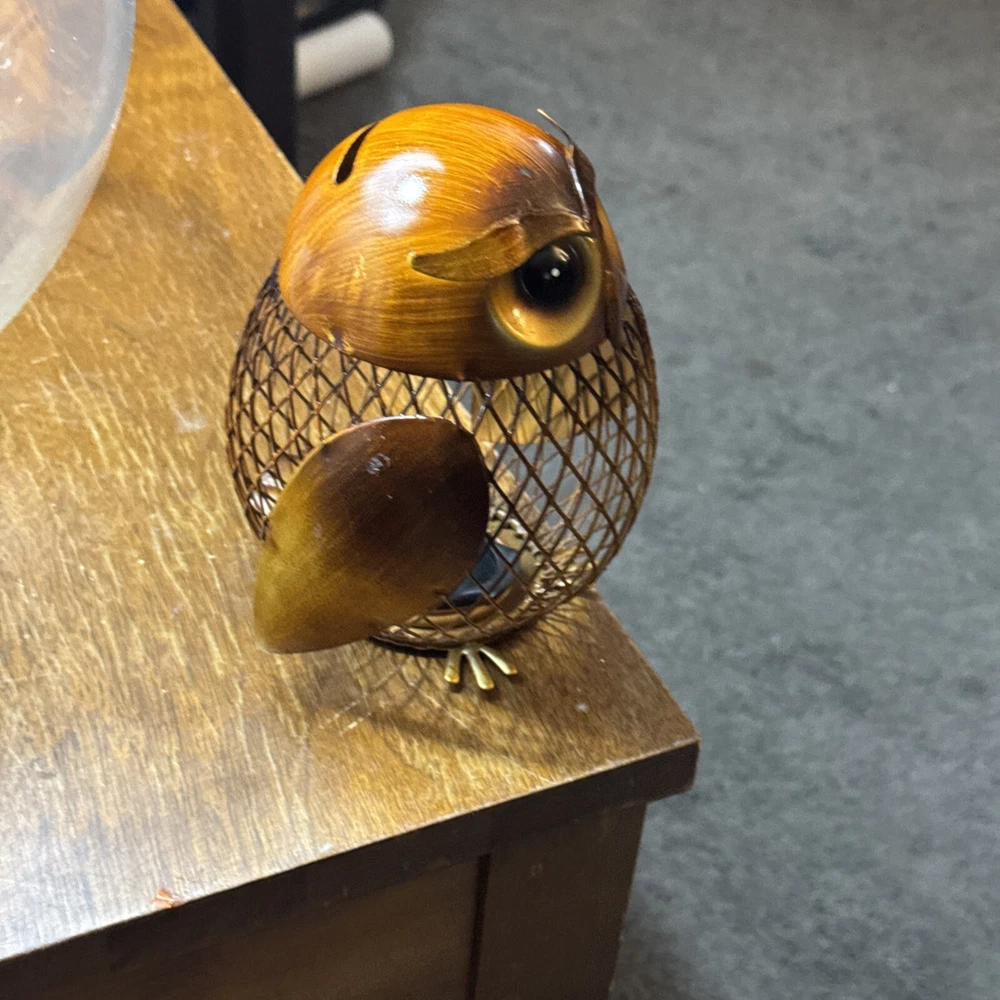 This 5.5" Metal Owl Coin Bank from the brand TooArts is a small vintage/retro-style figurine designed as a money box. The owl-shaped figurine is made of brass, mesh metal, and aluminum/plastic, featuring a glossy brown and gold finish. With a height and length of 5.5 inches and a width of 4 inches, this owl coin bank can be a charming addition to any room in the house, including the office, bedroom, or living room. Its intricate design and functionality make it a unique home decoration piece that can also help you save coins.