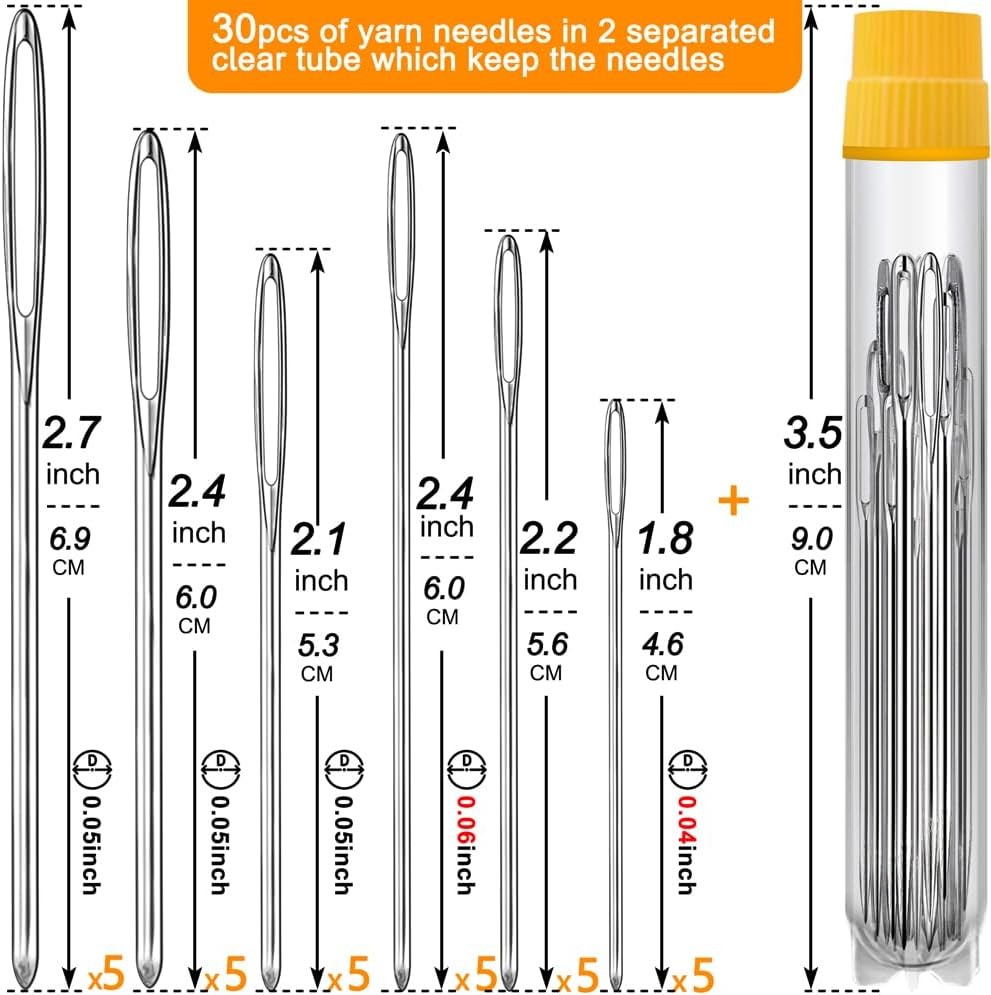 55 PCS Large-Eye Blunt Needles, Large Eye Sewing 11 55 pack, Silver Product Details Material: Stainless Steel Brand: phicivono Color: Silver Point Type: Blunt Recommended Uses For Product: Yarn needle, tapestry needles for yarn, plastic canvas needles, tapestry needles, Knitting needles, crochet needles, darning needles for yarn, crochet accessories, blunt needles Unit Count: 1.0 Count Item Length: 2.5 Inches Manufacturer: phicivono Item model number: YND-1 Item Weight: 1.76 ounces Country of Origin: China Recommended Uses For Product: Yarn needle, tapestry needles for yarn, plastic canvas needles, tapestry needles, Knitting needles, crochet needles, darning needles for yarn, crochet accessories, blunt needles Yarn needle, tapestry needles for yarn, plastic canvas needles, tapestry needles, Knitting needles, crochet needles, darning needles for yarn, crochet accessories, blunt needlesYarn needle, tapestry needles for yarn, plastic canvas needles, tapestry needles, Knitting needles, crochet needles, darning needles for yarn, crochet accessories, blunt needles See more Easy Storage: We provide three transparent tubes with screw caps to prevent the needles from getting lost. When you finish your project, simply place the yarn needles into the storage tubes. You no longer need to worry about losing your finishing needles. High-Quality Material: Our needles are made of high-quality steel and come in 11 different sizes, including six blunt-point needles and five sharp-point needles. These needles are sturdy and resistant to bending, rust, and corrosion, making them very easy to use. The blunt-point needles are perfect for knitting and seaming, while the sharp-point needles are ideal for sewing and embroidery. Their smooth surface ensures less resistance when passing through fabric, making them easier to penetrate. 11 Sizes Included: All 55 needles are packaged in 3 bottles of different colors. The blunt needles come in six sizes, with lengths ranging from 1.8 inches to 2.76 inches and thicknesses from 0.04 inches to 0.08 inches. The sharp needles come in five sizes, with lengths ranging from 1.8 inches to 2.36 inches and thicknesses from 0.04 inches to 0.06 inches. Wide Applications: Our needles are suitable for weaving in ends and sewing up seams on your knit and crochet projects. They can also be used for repairing jute rugs, mending vinyl upholstery and leather, as well as for regular sewing, mending clothes, and embroidery. Easy to Use: The extra-large and long eye of our needles makes threading very easy, even without a threader. Of course, we also provide two threaders to make it even easier for elderly users.