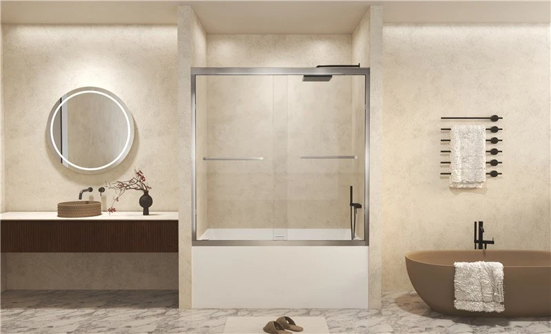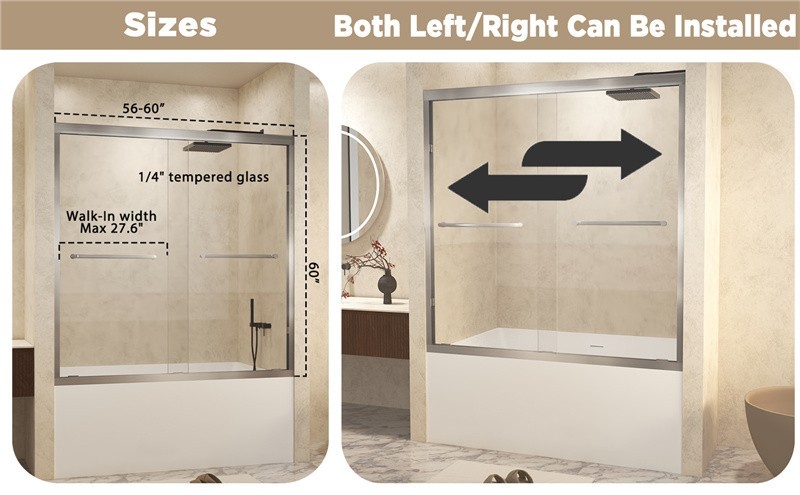 Features and Details: Durable Aluminum Frame: Lightweight, corrosion-resistant, and long-lasting. Stainless steel long handle: Rust-proof and oxidation-resistant, maintaining a shiny finish over time. 6mm(1/4")Tempered Glass with Safety Film: Shatterproof protection for the safety of your family. Modern Minimalist Design: Matte black frame paired with transparent glass, matching any bathroom style. Easy-to-Clean Surface: Resists dirt buildup for effortless maintenance. Simple Installation: No professional tools required; quick and easy assembly. SCGG Certified: Guaranteed quality for peace of mind. Specification: Color: Brushed Nickel Main Material: Tempered Glass Item Size: 60" W × 0.25" D ×60"H Product Weight (lbs.): 93.24