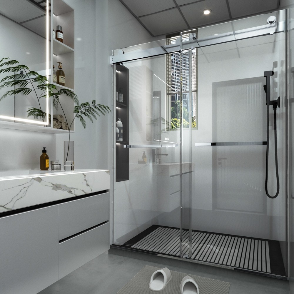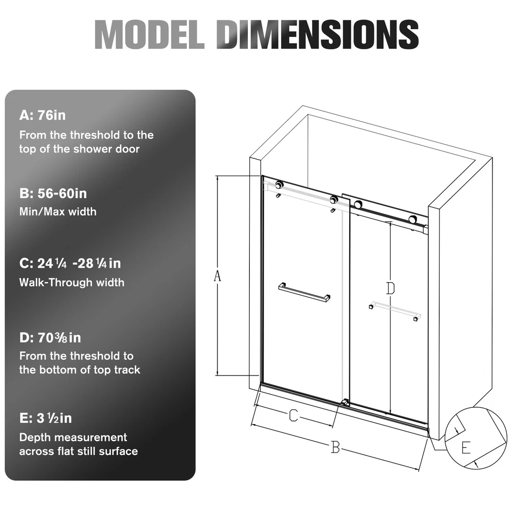 △Please be noted that this product comes in an extra large package,can only be transited and delivered by truck delivery,which requires accurate recipient phone number to well deliver. This large package takes longer to arrive. Product Information Item Code S00011 Product Type Combo Item Product Name 56-60 inches W *76 inches H Frameless Double Sliding Soft-Close Shower Door in Chrome, 3/8 inches (10mm) Thick SGCC Tempered Glass Door Place of Origin China Main Color Chrome Main Material Glass+Metal Product Dimensions Assembled Length (in.) 60.00 Assembled Width (in.) 76.00 Assembled Height (in.) 0.38 Weight (lbs) 187.00 Package Size Sub-item 1: P174988 Package Quantity: 1 63.58 * 9.45 * 3.54 in. 24.09lbs Sub-item 2: P143500 Package Quantity: 2 79.53 * 35.43 * 2.17 in. 93.28lbs Product Features · DOUBLE BYPASS SLIDING: This frameless shower door can be adjusted from 56 to 60 in width by cutting, maximize your bathroom layout of our double sliding door system, designed for easy access while using minimal space for smooth, unobstructed movement. The door body is light and flexible, with a long mechanical life, and provides smooth opening and closing. · SAFE & STYLISH BATHROOM PARTITION: This product is made of high quality 3/8"(10mm) SGCC certified tempered glass for impact resistance and high tensile strength. Tempered glass surfaces are smooth and easy to clean and maintain, keeping your bathroom clean and tidy at all times. · EXCELLENT WATERPROOF and DENOISE PERFORMANCE: This shower door is designed with a focus on water and denoise resistance. Its premium materials and advanced construction ensure a watertight seal and denoise function, preventing any water from escaping your shower and onto your bathroom floor, reducing sliding noise and providing you with a comfortable bath experience. · CLASSIC AND HIGH-QUALITY MATERIALS: The tub shower door's main structure is made of lightweight and durable aluminum alloy with stunning and sophisticated chrome finish, which offers excellent corrosion and oxidation resistance, ensuring the stability and durability of the shower door without deformation over time. · EASY INSTALLATION: The complete packaging of the tub door includes all necessary components, ensuring a smooth and unobstructed installation process. And the packaging comes with an easy to understand installation guide that covers component preparation and step-by-step installation. How to Measure Your Shower Space ? Measuring the size of your enclosure is the first step toward a perfectly fitted installation. The following guidelines can help you achieve a precise measurement: 1. Ensure that finished wall material is in place before measuring. 2. Take lengthwise measurements at the bottom, center, and top of your enclosure. 3. Check all surfaces and walls for level. If any surface is out of level by 3/8 inches or more, a tapered filler is recommended. 4. Measure your available height (from shower curb to ceiling) and requested height (from shower curb to the desired height of your door) ------------------------------------------------------- Do Read before You Buy : Refund& Return -Returns are accepted within 30 days.Any problems, please feel free to contact us by ebay message first, let's figure problems out together,your email will be replied within 1 business day. -We provide free Return service, but return shipping cost will be on you in below circumstances : 1. C hanged your mind or do not need /want the item or other personal reasons. 2.Items may slightly differ from photo s in terms of color and lighting differences & on different monitor’s display. 3. Manual measurement has been used, there may be some reasonable error range. 4. Choos ing the wrong size , type or color cause s unfit ting problem . Or didn't read specifications and descriptions, causes real item is different with own imagination or expectation. 5. Buyer did not know how to install or Use the item 6.Find a better price elsewhere . -Returns for free / free Replacement / free parts only happens in condition of product issue/ arriving broken /wrong item or missing parts. -For the quality issue , defective photo s must be attach ed in mails / when Return. Shippment Warning : if we shiped out the item and buyer wants to cancel the order or change address,buyer need to pay possible shipping cost . Please cancel the order or Change address before we ship out. After sals Service -we are responsible for accessories missed ( please contact us first ,and attach photo of what you've received ) -we are responsible for all losses caused by product quality issues ( Resend or Refund, please also attach defective photo s) Feedback We do appreciate hav ing such opportunity to solve the problem before leaving feedback s . Cause negative feedback solve s NO problem, but we DO ! Hope you have a good time shopping in our store! We are honored !