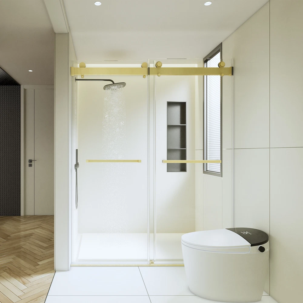 Minimum Width: 56 in Installation Side: Both Sides Glass Thickness: 3/8 inches (10mm) Features: Tempered Glass Personalize: No Frame Type: Frameless Item Length: 56-60 in Color: Brushed Gold Glass Style: Clear Handle Type: Bar Set Includes: Shower Door Manufacturer Warranty: 3 Months Door Opening Size: 24-1/4to 28-1/4 inch Labels & Certifications: SGCC Item Height: 76 in Glass: 3/8 inches (10mm) Thick SGCC Tempered Glass Item Width: 3 1/2 in Room: Bathroom Item Weight: 187 lb Assembly Required: Yes Type: Shower Door Installation: Screw-In Material: Glass, Metal Opening Mechanism: Sliding Shape: Rectangle Number of Items in Set: 1 Brand: FORLAN Maximum Width: 60 in Suitable For: Shower Handle Material: Stainless Steel