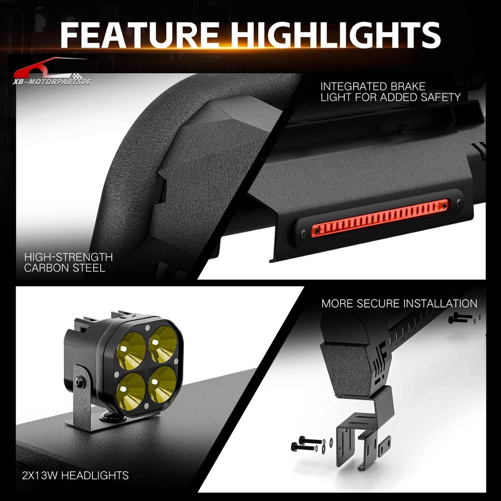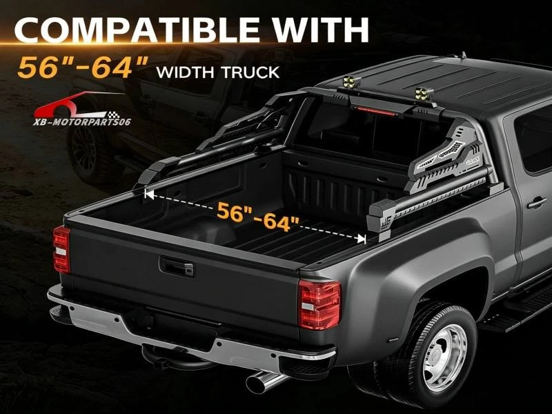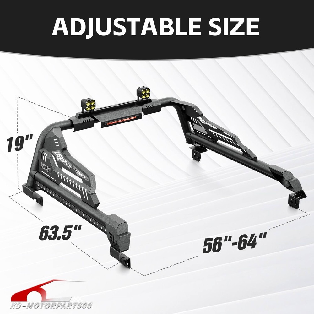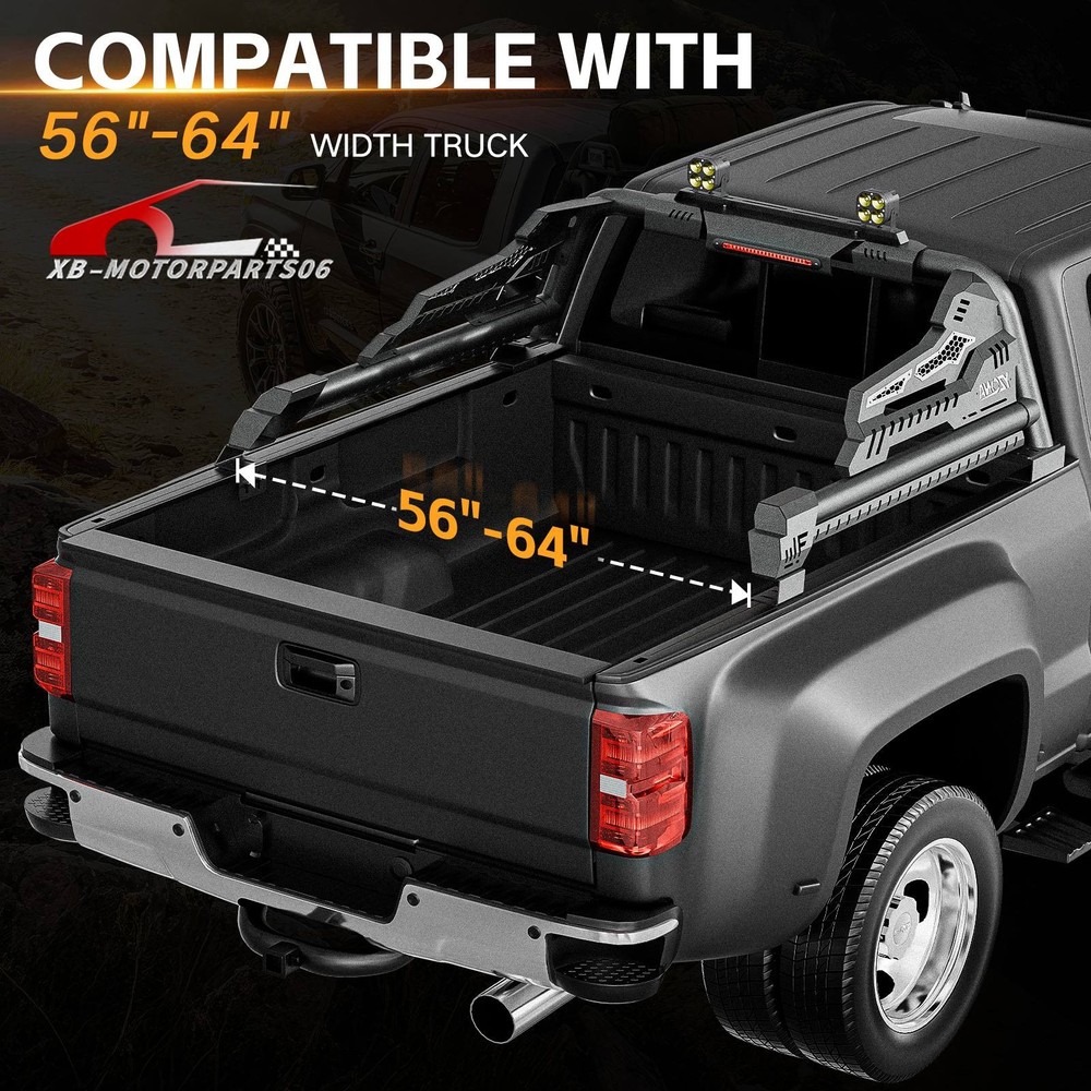 56''-64'' Adjustable Truck Bed Sport Roll Bar For Tundra/Tacoma/Canyon/JT/F-150 For safety reasons, we strongly recommend that you seek professional installation services Regularly check the rack hardware for looseness before driving to ensure cargo safety. Suitable Models : fit for the truck width bed range of 56" to 64". Fit for Chevy Silverado & GMC Sierra 1500, Toyota Tundra, Ford F150, Ridgeline, Titan, Tacoma, Gladiator JT, Colorado, Canyon, Frontier etc. ( Compatible with Trucks with Tonneau Cover & Bed Cover. ) Package Includes : 1 x Roll Bar with brake light bar, mounting hardwares, 1 x Include instructions. Product Information: Package Dimensions: 54.72 × 16.54 × 9.06 inches Installation mode: bolt-on Placement on Vehice: Rear Item Weight: 77.00 pounds Material: Carbon Steel Color: Black (hand measurements may have an error of 2-3 mm/0.078-0.118 in) Feature : ① Made from heavy-duty carbon steel, this roll bar is built for durability and strength. The black powder-coated finish enhances corrosion resistance, ensuring long-lasting performance; ② The roll bar features an adjustable width range of 56” to 64”, with a fixed height of 19”, allowing for a perfect fit across different truck bed sizes; ③ Equipped with a brake light bar and two high-quality LED lights, this roll bar enhances visibility for nighttime driving, off-road adventures, and worksite illumination. The extension harness for connecting the LED needs to be purchased separately ; ④ Features a bolt-on, no-drill installation process, requiring no cutting or modifications. The package includes all necessary mounting hardware and instructions for a quick and easy setup; Warranty Period : 1 year Standard Shipping (FedEx Ground or FedEx Home Delivery) Will usually ship within 3 business days of receiving cleared payment For safety reasons, we strongly recommend that you seek professional installation services Regularly check the rack hardware for looseness before driving to ensure cargo safety. Suitable Models : fit for the truck width bed range of 56" to 64". Fit for Chevy Silverado & GMC Sierra 1500, Toyota Tundra, Ford F150, Ridgeline, Titan, Tacoma, Gladiator JT, Colorado, Canyon, Frontier etc. ( Compatible with Trucks with Tonneau Cover & Bed Cover. ) Package Includes : 1 x Roll Bar with brake light bar, mounting hardwares, 1 x Include instructions. Product Information: Package Dimensions: 54.72 × 16.54 × 9.06 inches Installation mode: bolt-on Placement on Vehice: Rear Item Weight: 77.00 pounds Material: Carbon Steel Color: Black (hand measurements may have an error of 2-3 mm/0.078-0.118 in) Feature : ① Made from heavy-duty carbon steel, this roll bar is built for durability and strength. The black powder-coated finish enhances corrosion resistance, ensuring long-lasting performance; ② The roll bar features an adjustable width range of 56” to 64”, with a fixed height of 19”, allowing for a perfect fit across different truck bed sizes; ③ Equipped with a brake light bar and two high-quality LED lights, this roll bar enhances visibility for nighttime driving, off-road adventures, and worksite illumination. The extension harness for connecting the LED needs to be purchased separately ; ④ Features a bolt-on, no-drill installation process, requiring no cutting or modifications. The package includes all necessary mounting hardware and instructions for a quick and easy setup; Warranty Period : 1 year On Apr 21, 2026 at 17:14:54 PDT, seller added the following information:
