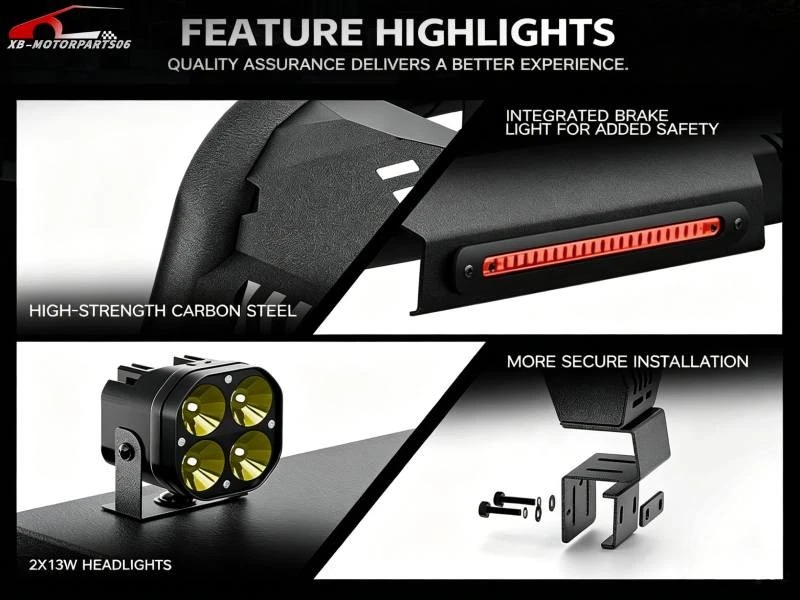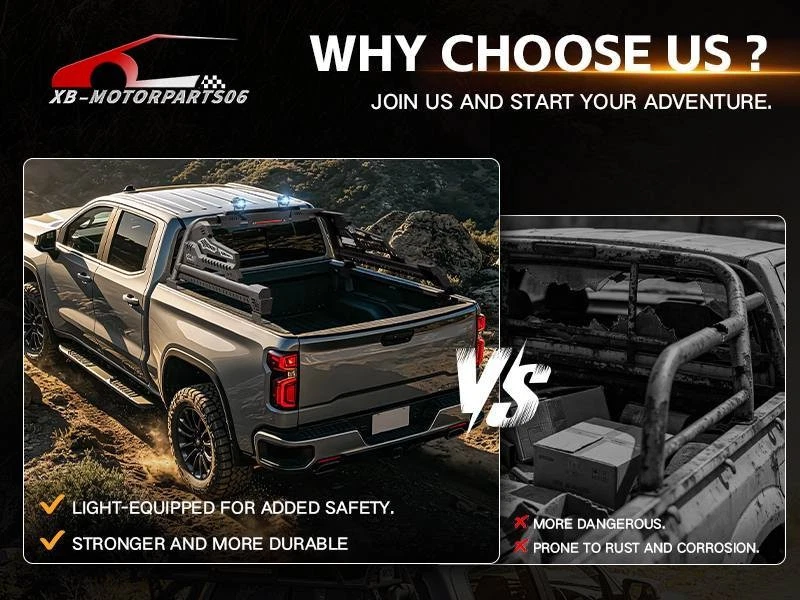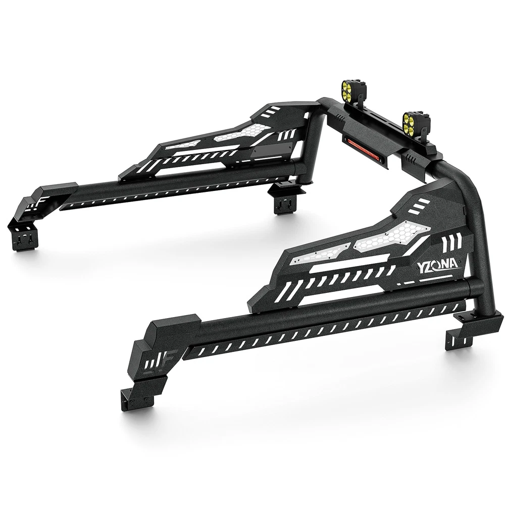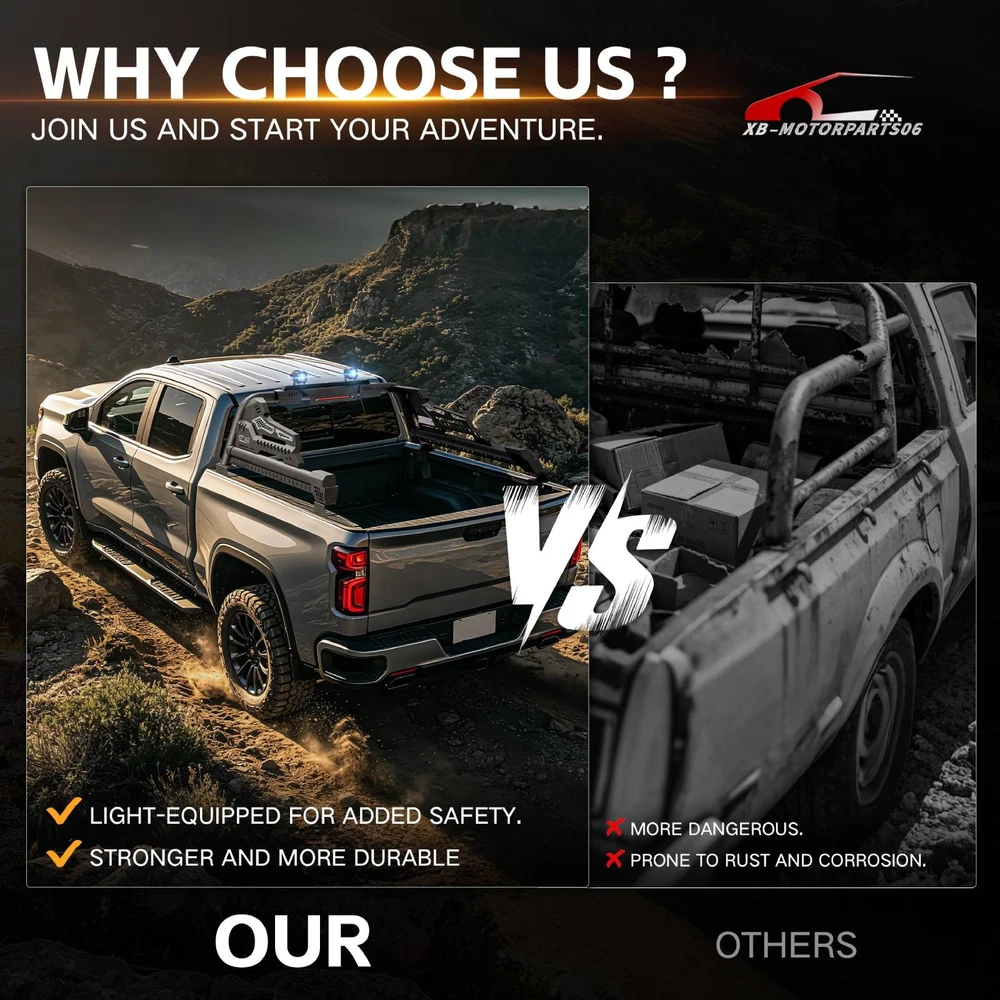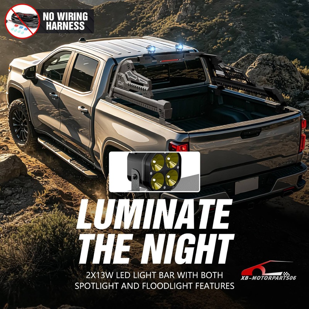 56''-64'' Adjustable Truck Bed Sport Roll Bar For Tundra/Tacoma/Canyon/JT/F-150 For safety reasons, we strongly recommend that you seek professional installation services Regularly check the rack hardware for looseness before driving to ensure cargo safety. Suitable Models : fit for the truck width bed range of 56" to 64". Fit for Chevy Silverado & GMC Sierra 1500, Toyota Tundra, Ford F150, Ridgeline, Titan, Tacoma, Gladiator JT, Colorado, Canyon, Frontier etc. ( Compatible with Trucks with Tonneau Cover & Bed Cover. ) Package Includes : 1 x Roll Bar with brake light bar, mounting hardwares, 1 x Include instructions. Product Information: Package Dimensions: 54.72 × 16.54 × 9.06 inches Installation mode: bolt-on Placement on Vehice: Rear Item Weight: 77.00 pounds Material: Carbon Steel Color: Black (hand measurements may have an error of 2-3 mm/0.078-0.118 in) Feature : ① Made from heavy-duty carbon steel, this roll bar is built for durability and strength. The black powder-coated finish enhances corrosion resistance, ensuring long-lasting performance; ② The roll bar features an adjustable width range of 56” to 64”, with a fixed height of 19”, allowing for a perfect fit across different truck bed sizes; ③ Equipped with a brake light bar and two high-quality LED lights, this roll bar enhances visibility for nighttime driving, off-road adventures, and worksite illumination. The extension harness for connecting the LED needs to be purchased separately ; ④ Features a bolt-on, no-drill installation process, requiring no cutting or modifications. The package includes all necessary mounting hardware and instructions for a quick and easy setup; Warranty Period : 1 year Standard Shipping (FedEx Ground or FedEx Home Delivery) Will usually ship within 3 business days of receiving cleared payment For safety reasons, we strongly recommend that you seek professional installation services Regularly check the rack hardware for looseness before driving to ensure cargo safety. Suitable Models : fit for the truck width bed range of 56" to 64". Fit for Chevy Silverado & GMC Sierra 1500, Toyota Tundra, Ford F150, Ridgeline, Titan, Tacoma, Gladiator JT, Colorado, Canyon, Frontier etc. ( Compatible with Trucks with Tonneau Cover & Bed Cover. ) Package Includes : 1 x Roll Bar with brake light bar, mounting hardwares, 1 x Include instructions. Product Information: Package Dimensions: 54.72 × 16.54 × 9.06 inches Installation mode: bolt-on Placement on Vehice: Rear Item Weight: 77.00 pounds Material: Carbon Steel Color: Black (hand measurements may have an error of 2-3 mm/0.078-0.118 in) Feature : ① Made from heavy-duty carbon steel, this roll bar is built for durability and strength. The black powder-coated finish enhances corrosion resistance, ensuring long-lasting performance; ② The roll bar features an adjustable width range of 56” to 64”, with a fixed height of 19”, allowing for a perfect fit across different truck bed sizes; ③ Equipped with a brake light bar and two high-quality LED lights, this roll bar enhances visibility for nighttime driving, off-road adventures, and worksite illumination. The extension harness for connecting the LED needs to be purchased separately ; ④ Features a bolt-on, no-drill installation process, requiring no cutting or modifications. The package includes all necessary mounting hardware and instructions for a quick and easy setup; Warranty Period : 1 year On Apr 21, 2026 at 17:14:54 PDT, seller added the following information: