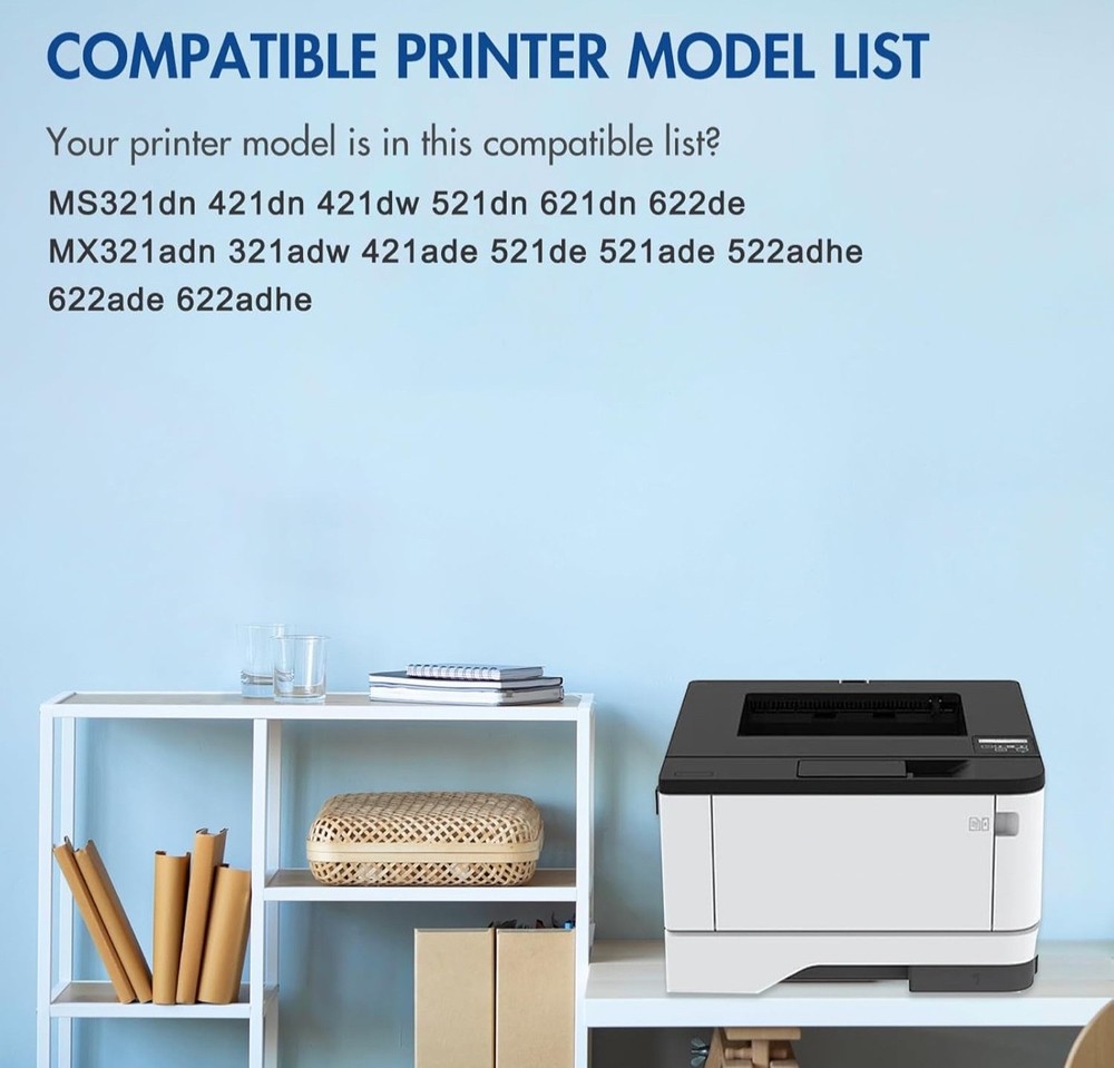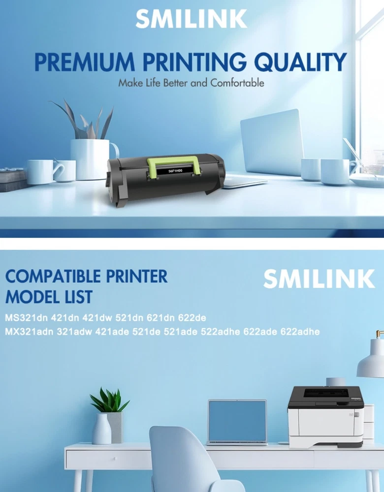 #2985 56F1H00 Black Toner Cartridge MS521dn MS421dn Remanufactured Compatible for Lexmark MX321adn MX521de MS621dn MX622ade MX421ade MS321 MS421 MS521 MS621 MS622 MX321 MX421 MX521 Printer High Yield 2Pack Brand SMILINK Color 56F1H00 Black Toner Cartridge*2 Compatible Devices MS321dn MS421dn MS421dw MS521dn MS621dn MS622de MX321adn MX321adw MX421ade MX521ade MX521de MX522adhe MX622ade MX622adhe Manufacturer SMILINK-for-Lex'mark 56F1H00 black toner cartridge Included: 2 Pack 56F1H00 toner cartridge Compatible for 56F1H00 toner Replacement for Lexmark 56F1H00 black toner cartridge Page Yield: Up to 15,000 pages per 56F1H00 Black Toner Cartridge (Letter/A4, at 5% Coverage) Compatible for Lexmark Printer: MS621dn MX321adn MX622ade MX421ade MX521de MS321dn MS521dn MS421dn MS421dw MX321adw MS622de MX522adhe MX622adhe MX521ade MX520 MX620 MS620 Printer Package Contents: 2 Pack 56F1H00 Black Toner Cartridge SMILINK 56F1H00 black toner cartridge continues to offer you a printing experience of high quality and economic affordability Compatible for Lexmark Printer: MS321 MS421 MS521 MS622 MS621 MX321 MX421 MX521 MX522 MX622 Printer