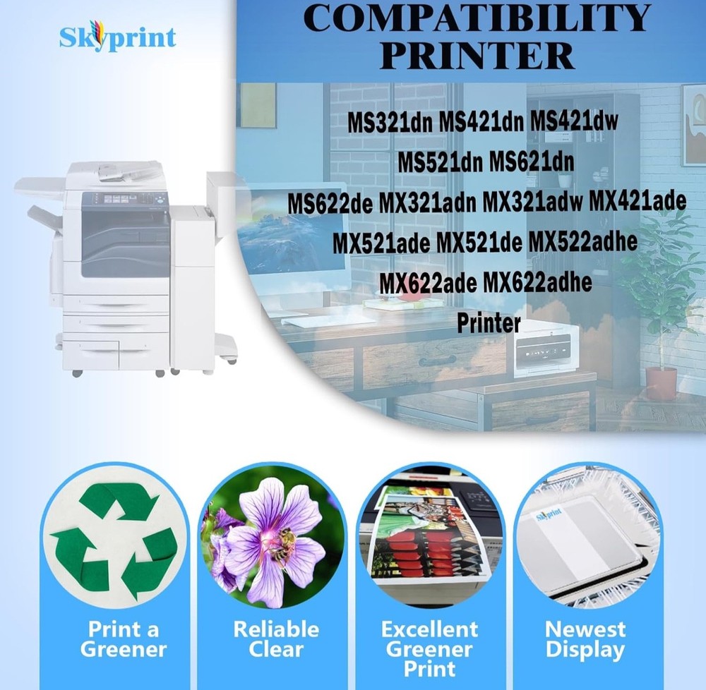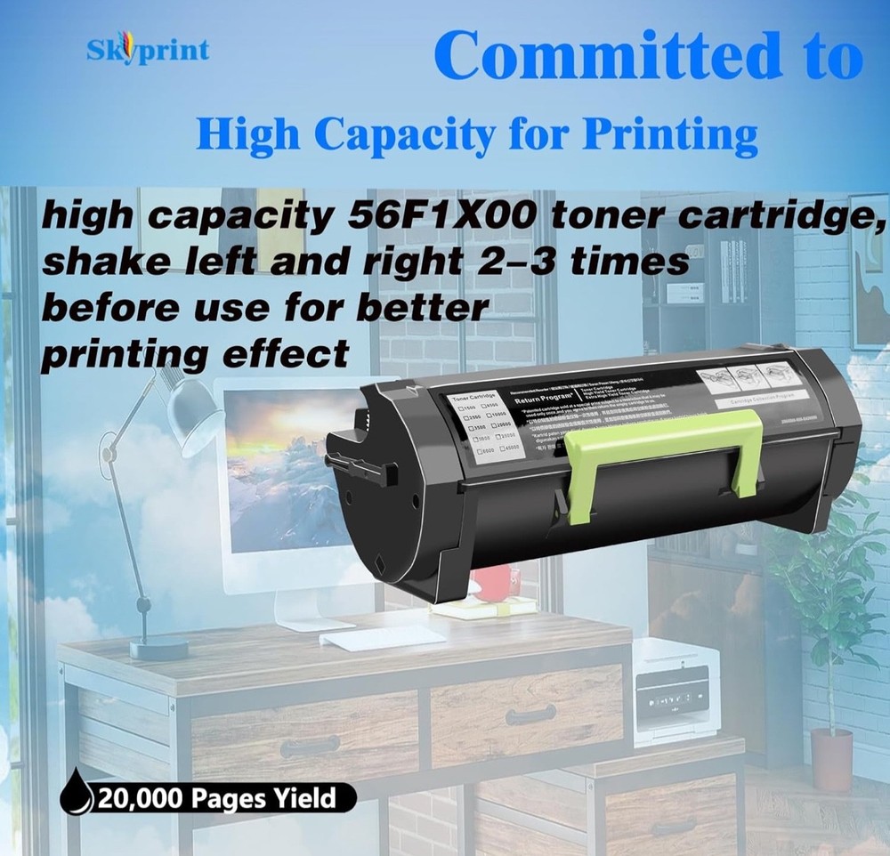 #2878 CS421dn 56F1X00 Black Toner Cartridge Extra High Yield (with Chip) Compatible with Lexmark 56F1X00 Toner Cartridge for Lexmark MS421 MS521 MS621 MS622 MX421 MX521 MX522 MX622 Printer Ink Brand SkyPrint Color Black Compatibility Options Compatible MS321dn, MS421dn, MS421dw, MS521dn, MS621dn, MS622de, MX321adn, MX321adw, MX421ade, MX521ade, MX521de, MX522adhe, MX622ade, and MX622adhe Printers Page Yield 22000 Manufacturer SkyPrint Product Quantity:1-pack 56F1X00 toner cartridge MS331 MS431 MX331 MX431 MX432 56F Toner Compatible With Printers:Lexmark MS321dn MS421dn MS421dw MS521dn MS621dn MS622de MX321adn MX321adw MX421ade MX521ade MX521de MX522adhe MX622ade MX622adhe Printers High Page Yield:up to 20,000 pages per 56F1X00 High Yield black toner at 5% coverage of A4 Letter SkyPrint 56F1X00 toner cartridges come with intelligent chips that automatically recognize and provide printin, Not damaging the machine,Shake the toner cartridge horizontally 2-3 times before use to evenly distribute the toner When purchasing 56F1X00 toner cartridge, please confirm if your printer model meets the requirements