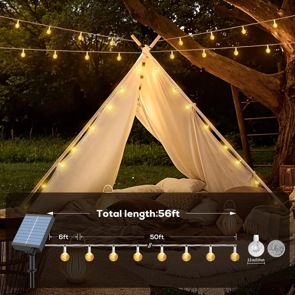 / [Larger Capacity & Longer Use Time] 1200mah large capacity solar panel, lights up for all night (15-18 hours) after fully charged; with extra USB C port (suitable for 5v adapter ), more convenient to outdoor use; modes and power display; more convenient and easy to use, suitable for all people [8 Lighting Modes & Memory Function] This solar panel built-in memory chip saves your last mode setting, so there's no need to reset it again. By pressing the mode button of the solar panel or remote control, you can switch between 8 lighting modes. The string light also offers timer settings and brightness adjustment, providing you with various lighting atmospheres for your window, door, floor, wall, ceiling, grass, Christmas tree, camping tent [IP65 Waterproof & Auto On/Off] This string light is IP65 waterproof, you can use this in sun, wind, rain, snow, fog, and any weather. Light sensor controls the solar outdoor light auto on at dark and auto off at daytime, no electricity cost. adding perfect atmosphere for your home [Widely Used & Energy-Saving] The solar design is not only energy-saving, but also safe and can be moved freely. It is very suitable for hanging on terrace, pergola, balcony, porch, roof, tree, etc. In addition, you can use the solar panel as a battery box and use it indoors to decorate your Christmas tree, photo wall, children's room, etc. [Package & Tips] 1*56ft string light, 1*solar panel, 1*remote control, 1*use manual. NOTE: If the solar panel is installed in a place with street lamps, the solar panel will automatically enter the charging state at night, and the string light cannot be turned on. Please ensure that the solar panel installation location is completely dark at night