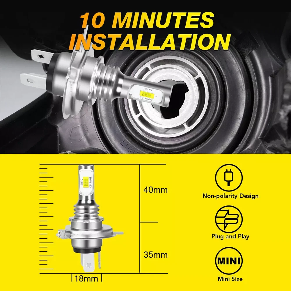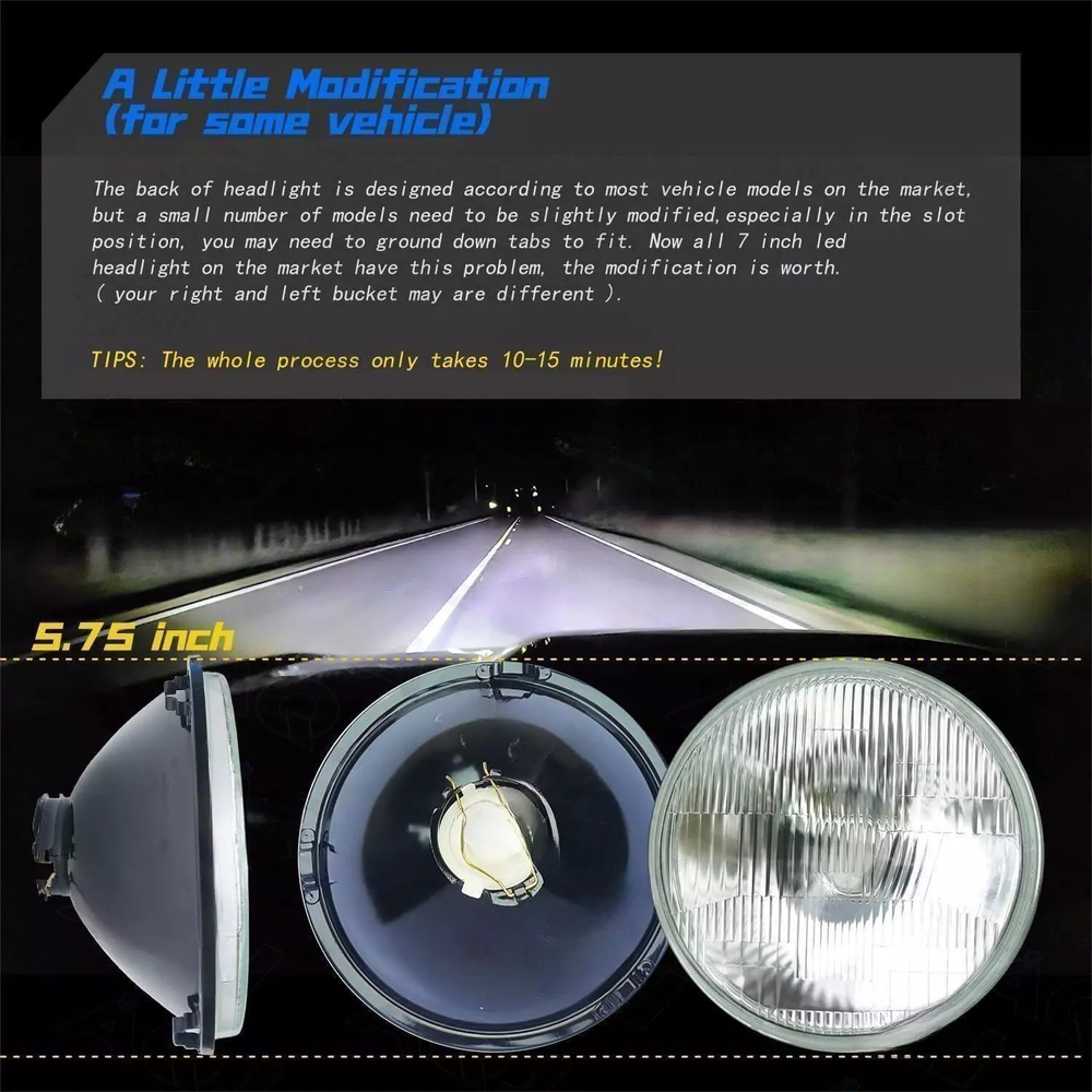 Technical Specification 4 Modes: High Beam + Low Beam + DRL+ Turn Signal Housing Color: Black Voltage: DC9V-32V Color Temperature: 6000K Power: 120w/pc Luminous Flux: 12000LM@High Beam, 6000LM@Low Beam Per PC Life Span: 80000+ hours Angel eyes color: amber & white, you can change it by yourself Material: Diecasting aluminum alloy housing, clear hardcoated PC lens Newest Design: Angel Eye Headlights Energy Saver 60% Lower Consumption (Low Energy Consumption means Low Fuel Consumption) Material: Die-cast aluminum housing, clear hardcoated PC lens Waterproof Rate:IP68 Certifications: DOT; SAE Fitment Fit for most vintage car with H5009 / H5006 / H5506 / H5001 / 4001 / 4004 / H5010 / H5501/ H4001 5.75 inch headlight brackets,such as: Fits for Cadillac Eldorado/ Calais/ DeVille/ Fleetwood/ Series 60 62 70 75 Fits for Ford Elite/Galaxie 500/ Thunderbird/ Torino/ Country Squire/ Ranch Wagon/ Musang/ Fairlane Fits for Oldsmobile 98/ Delta-88/ Toronado/ Cutlass/ F85/ Vista Cruiser/ 442/ Dynamic/ Super 88/ Fiesta Fits for Buick Electra/ LeSabre/ Riviera/ Skylark/ Special Fits for Chevrolet Caprice/ Impala/ Chevelle/ El Camino/ Corvair/ Malibu/ Pickup K10 K20 C10 C20 Fits for Chrysler Newport/ New-yorker/ Town & Country/ Imperial/ 300/ LeBaron Fits for Dodge Charger/ Coronet/ Monaco/ Dart/ Lancer/ D100 Series/ Royal Fits for Mercury Capri/ Comet/ Cougar/ Park Lane/ Monterey/ Villager/ Colony Park/ Montego/ Commuter Fits for Plymouth Cricket/ Barracuda/ Fury II III/ Gran Fury/ Belvedere/ Custom/ Satellite/ Savoy/ Fleet Special/ Valiant/ Suburban/ Plaza Fits for Toyota Pickup/ Corona/ Celica/ Land Cruiser/ Cressida/ Crown/ Mark II Fits for Fiat 124 131 Brava Fits for Peterbilt 349 359 289 Package Included 4pcs 5-3/4" Headlight Housings 4pcs H4/9003 LED Bulbs