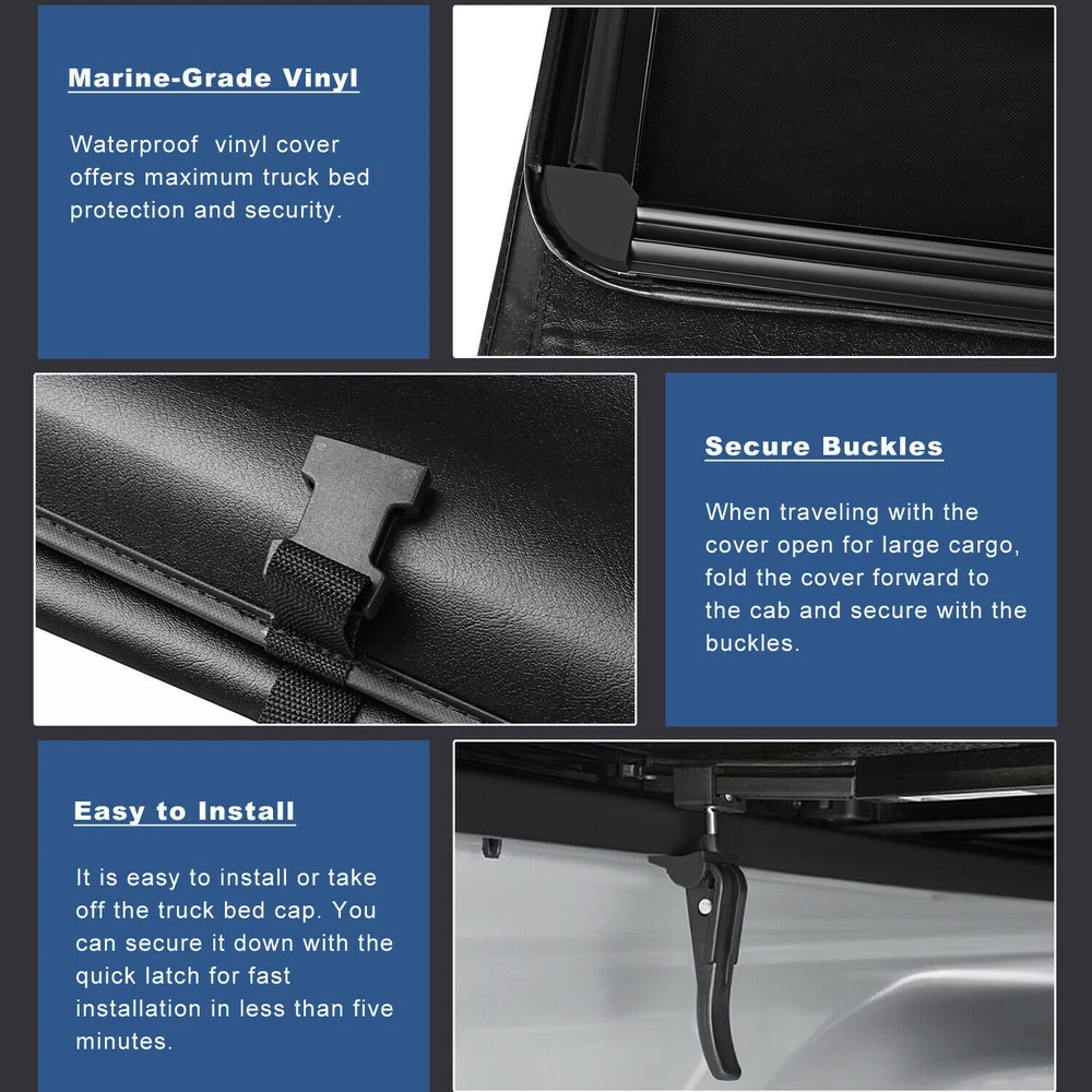 Type: Tonneau Cover Material: Aluminum, Vinyl Color: Black Placement on Vehicle: Rear, Upper Brand: OSIAS Attachment Type: Clamps Manufacturer Warranty: 3 Years Finish: New Black Bed Length: 5.7/5.8FT Interchange Part Number: For 2009-2024 Dodge Ram 5'7 or 5'8 Bed(No Ram Box) Manufacturer Part Number: 18M32301 Fits: 2009-2024 Dodge Ram 1500 5.8 Bed Without Ram Box Features: 4-FOLD, On Top, Waterproof, Soft Cover Fitment Type: Performance/Custom